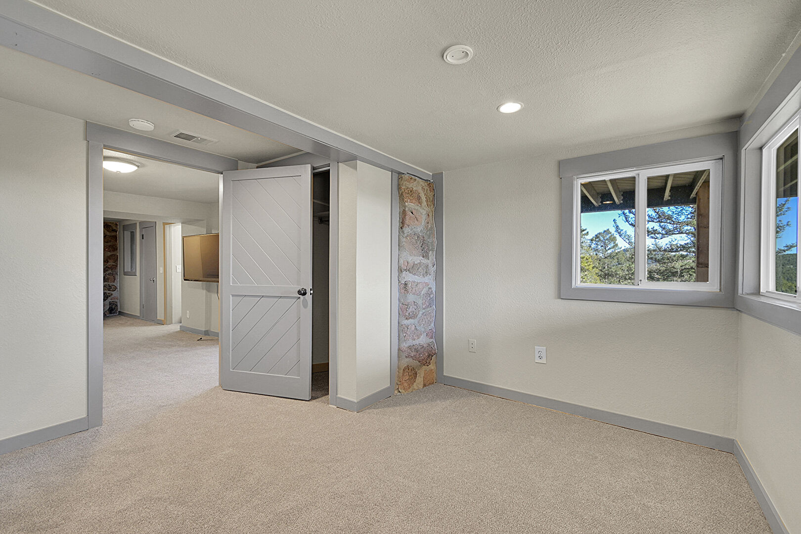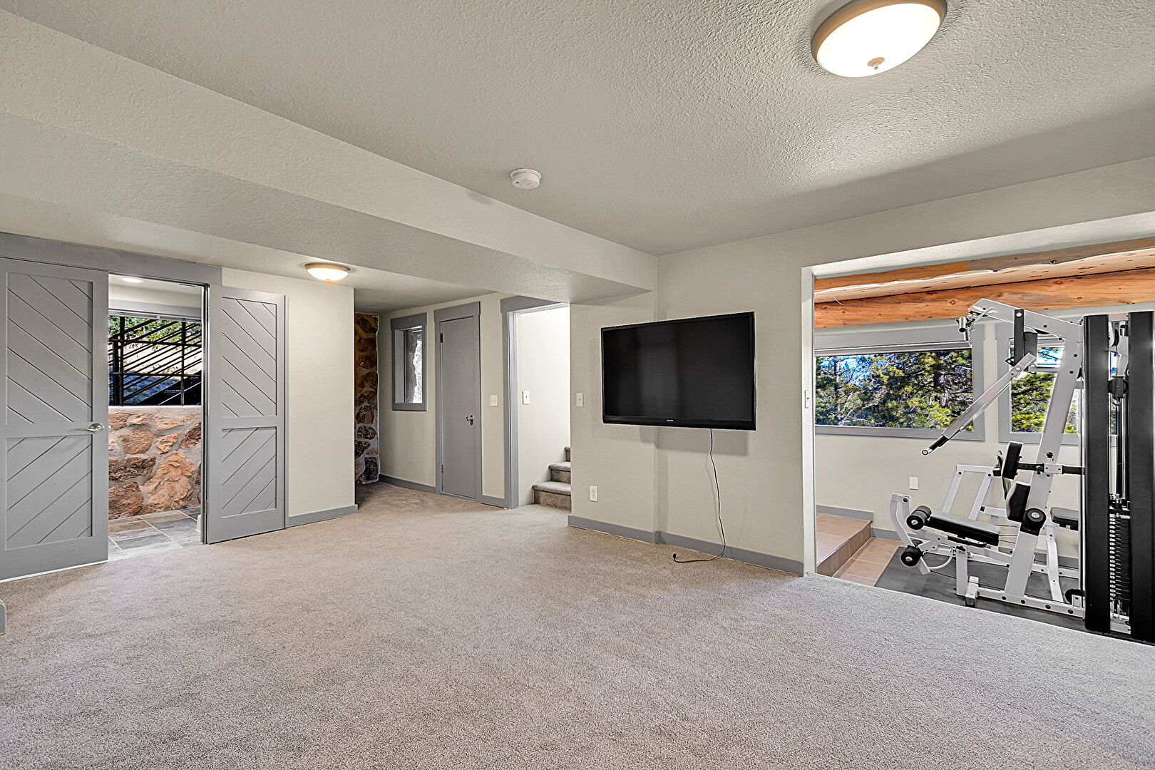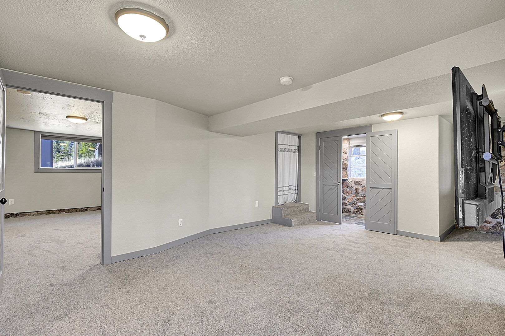 Baseboards Wall, Basement, Carpet, Drywall, Fireplace, Natural Light, Smoke Carbon Monoxide Detector, Stairs, Stone Wall, Textured Ceiling, Vent, Basement, Textured Ceiling