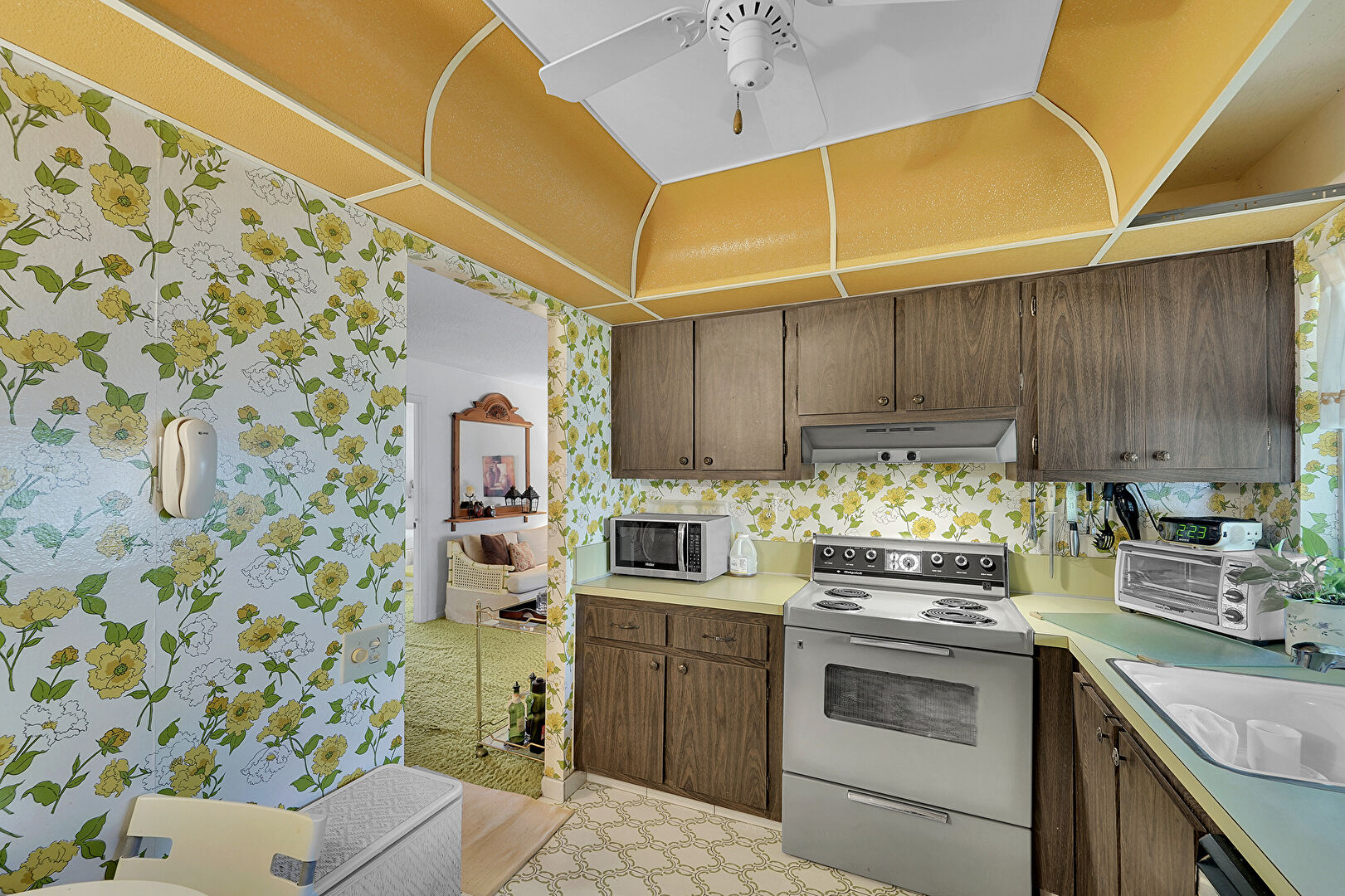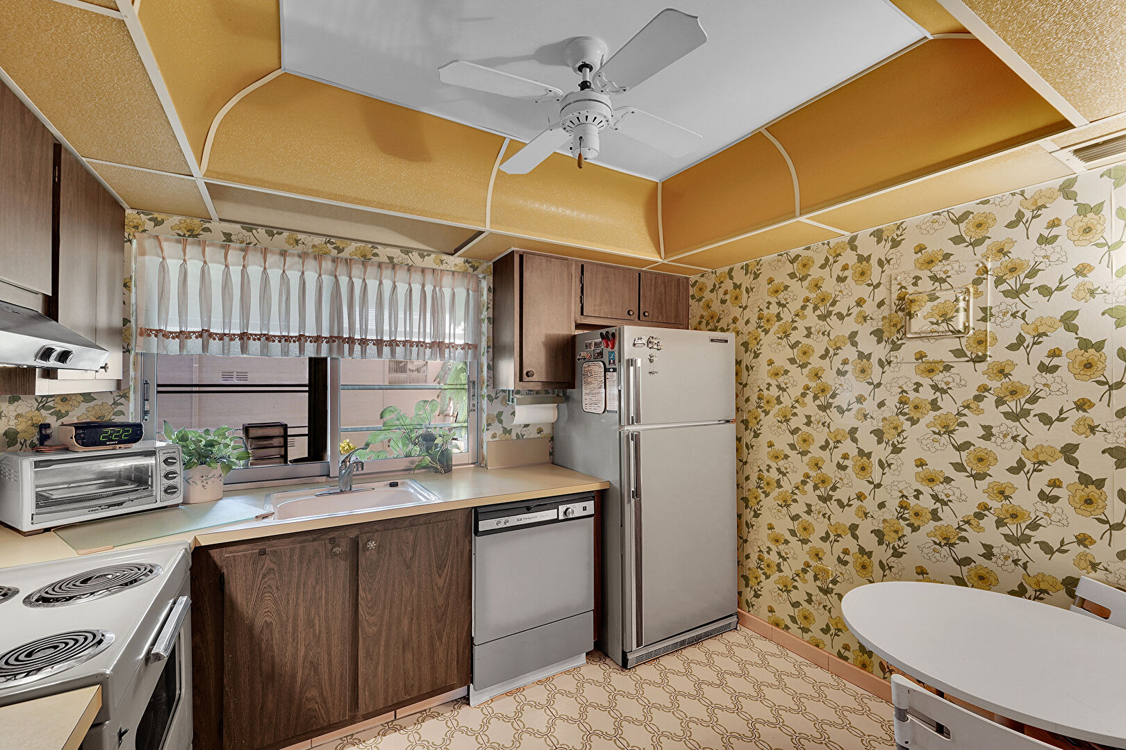 Baseboards Wall, Ceiling Fan, Dark Brown Cabinets, Toaster, Vinyl Floor, Visible Hinge Cabinets, Wallpaper Wall, Natural Light, Visible Hinge Cabinets