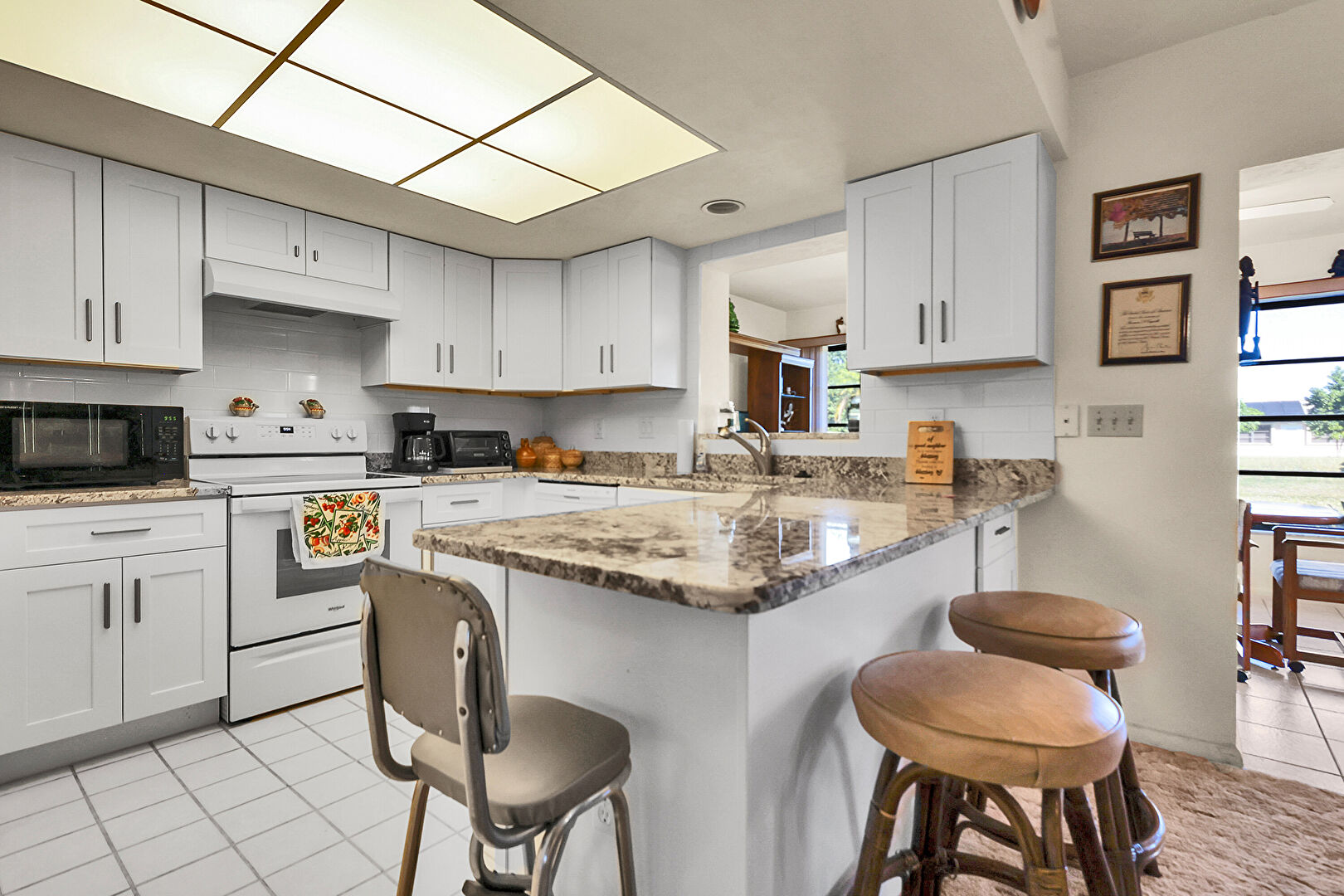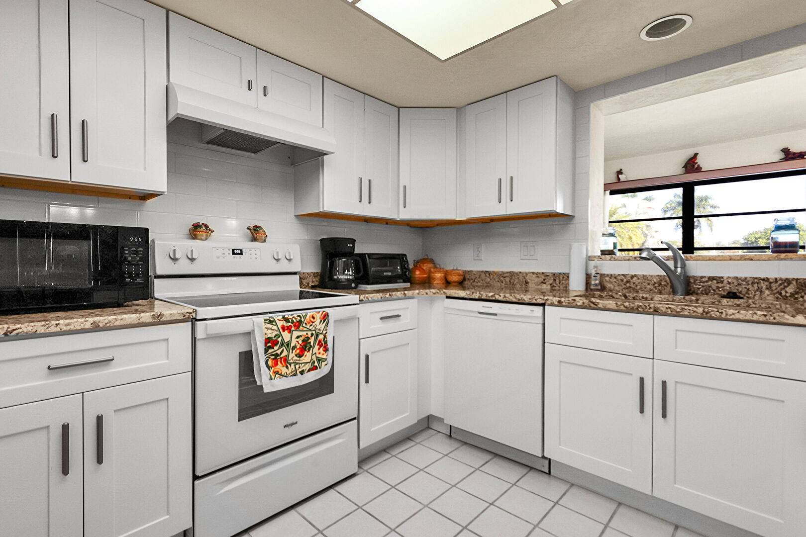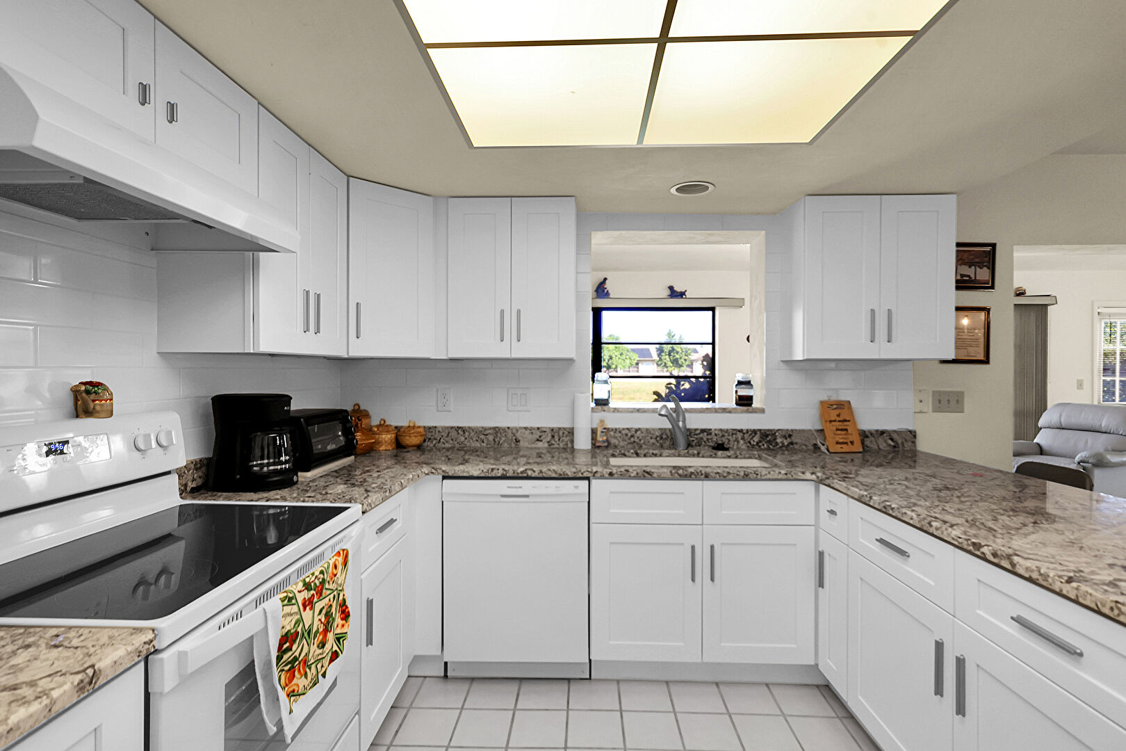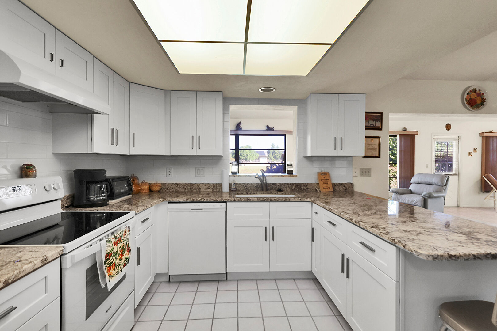 Baseboards Wall, Drywall, Kitchen Bar, Kitchen Peninsula, Natural Light, Pass Through Window, Recessed Lighting, Shaker Cabinets, Stone Countertops, Tile Floor, Toaster, Vent, Natural Light, Tile Floor, Toaster