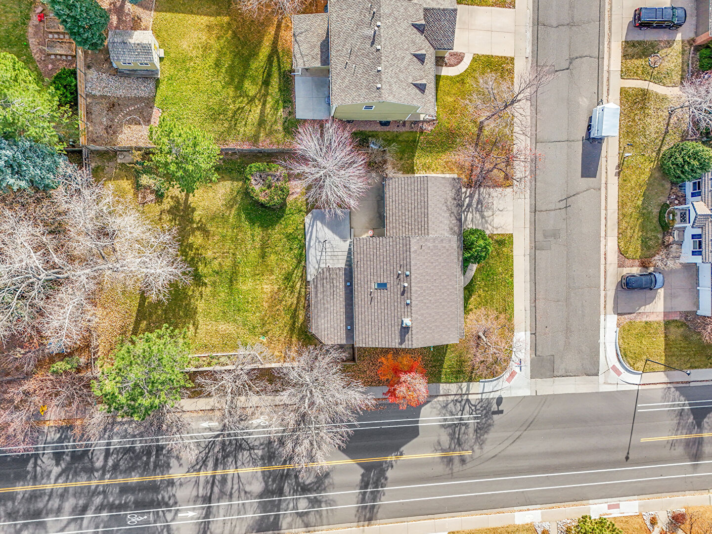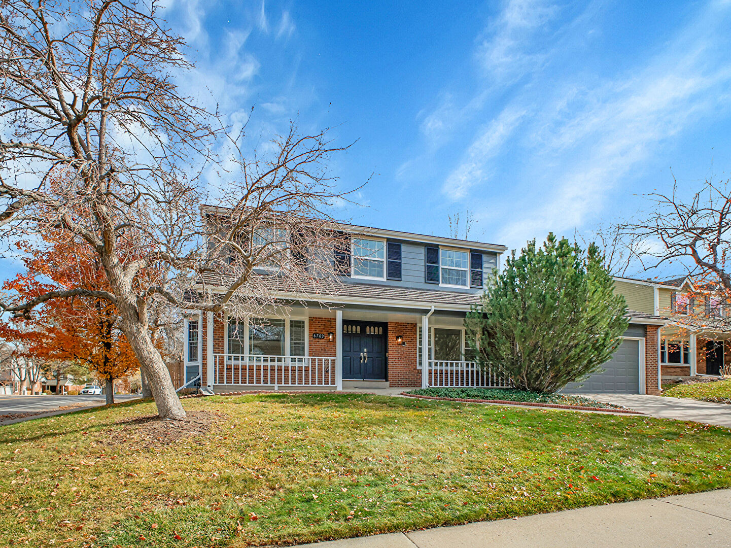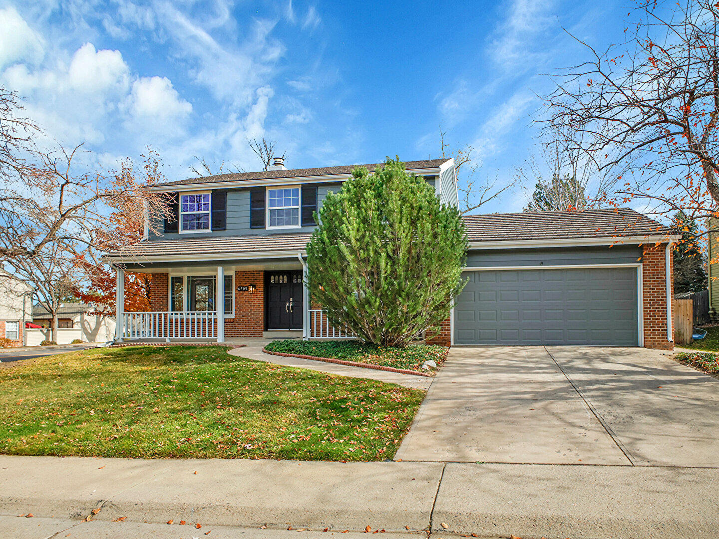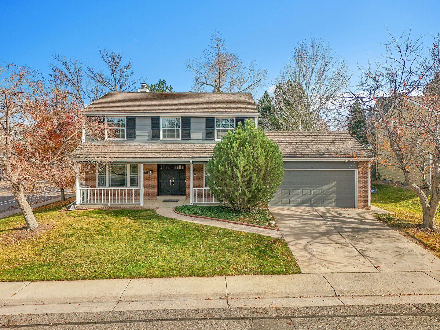 Brick Siding, Chimney, Downspout, Driveway, Gutters, Horizontal Siding, Lawn, Porch, Chimney, Driveway, Lawn