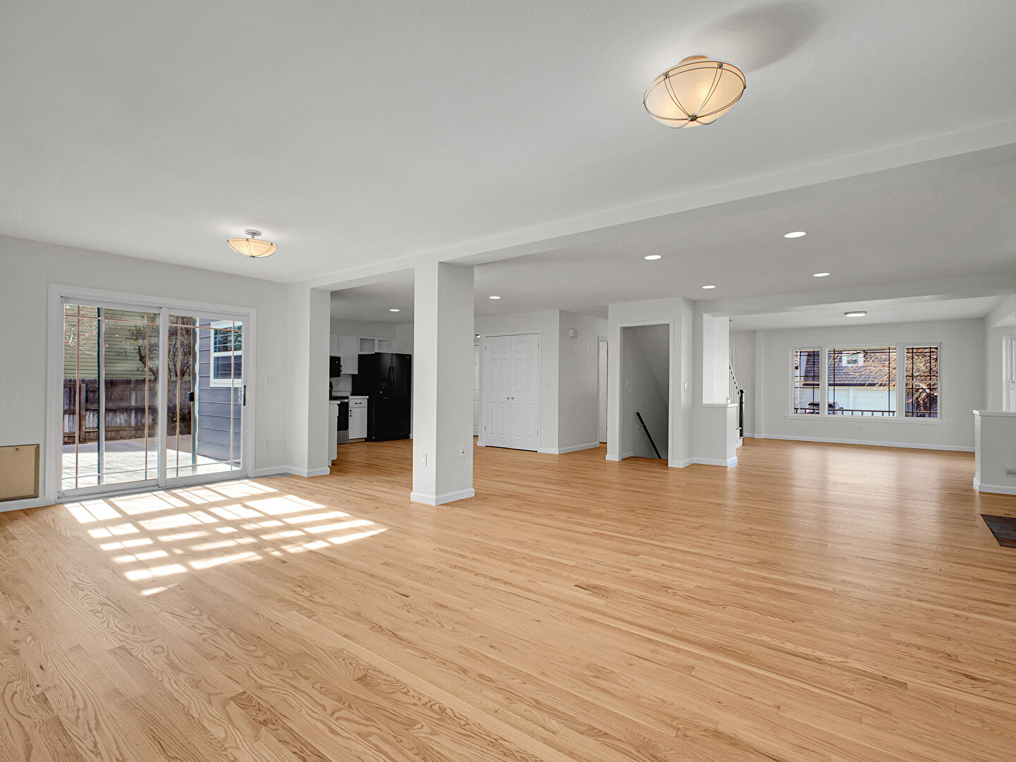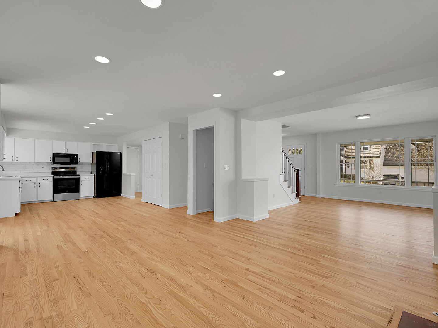 Baseboards Wall, Drywall, Fireplace, L Shaped Kitchen, Natural Light, Recessed Lighting, Stairs, Wood Finish Floor, Drywall, Fireplace, Natural Light, Stairs, Wood Finish Floor