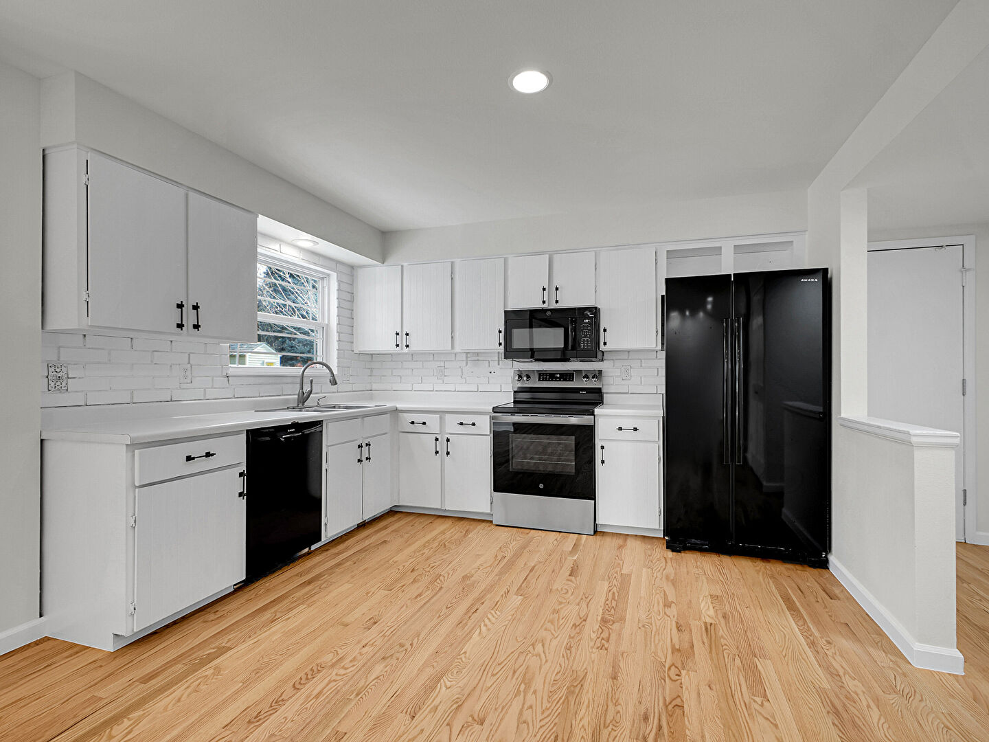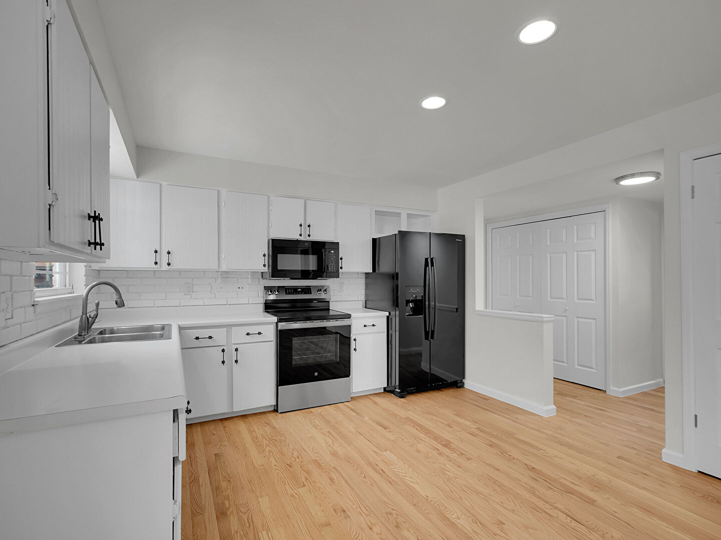 Baseboards Wall, Drywall, L Shaped Kitchen, Natural Light, Opens To Living Area, Recessed Lighting, Visible Hinge Cabinets, Wood Finish Floor, L Shaped Kitchen, Natural Light, Recessed Lighting