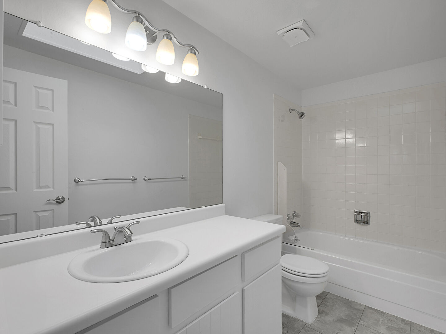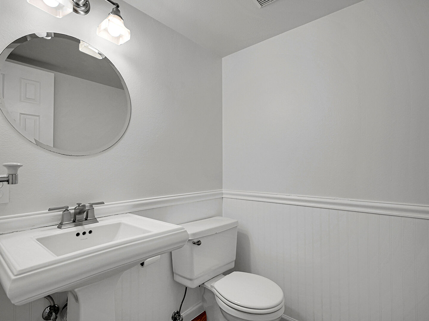 Combined Bath Shower, Drywall, Half Bathroom, Tile Floor, Vanity, Vent, Full Bathroom, Wainscot Wall