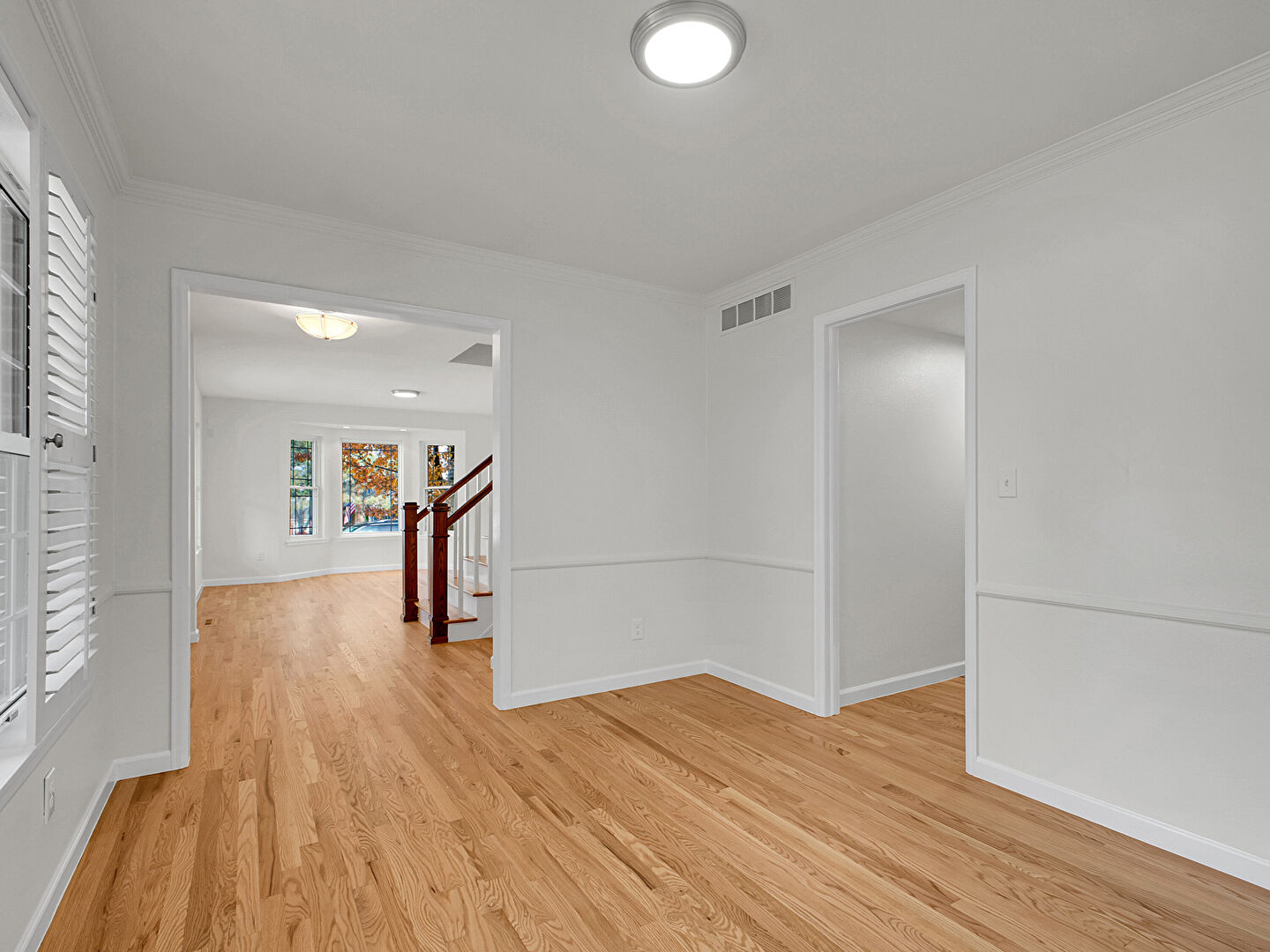 Baseboards Wall, Crown Molding, Drywall, Natural Light, Stairs, Vent, Wood Finish Floor, Drywall, Vent