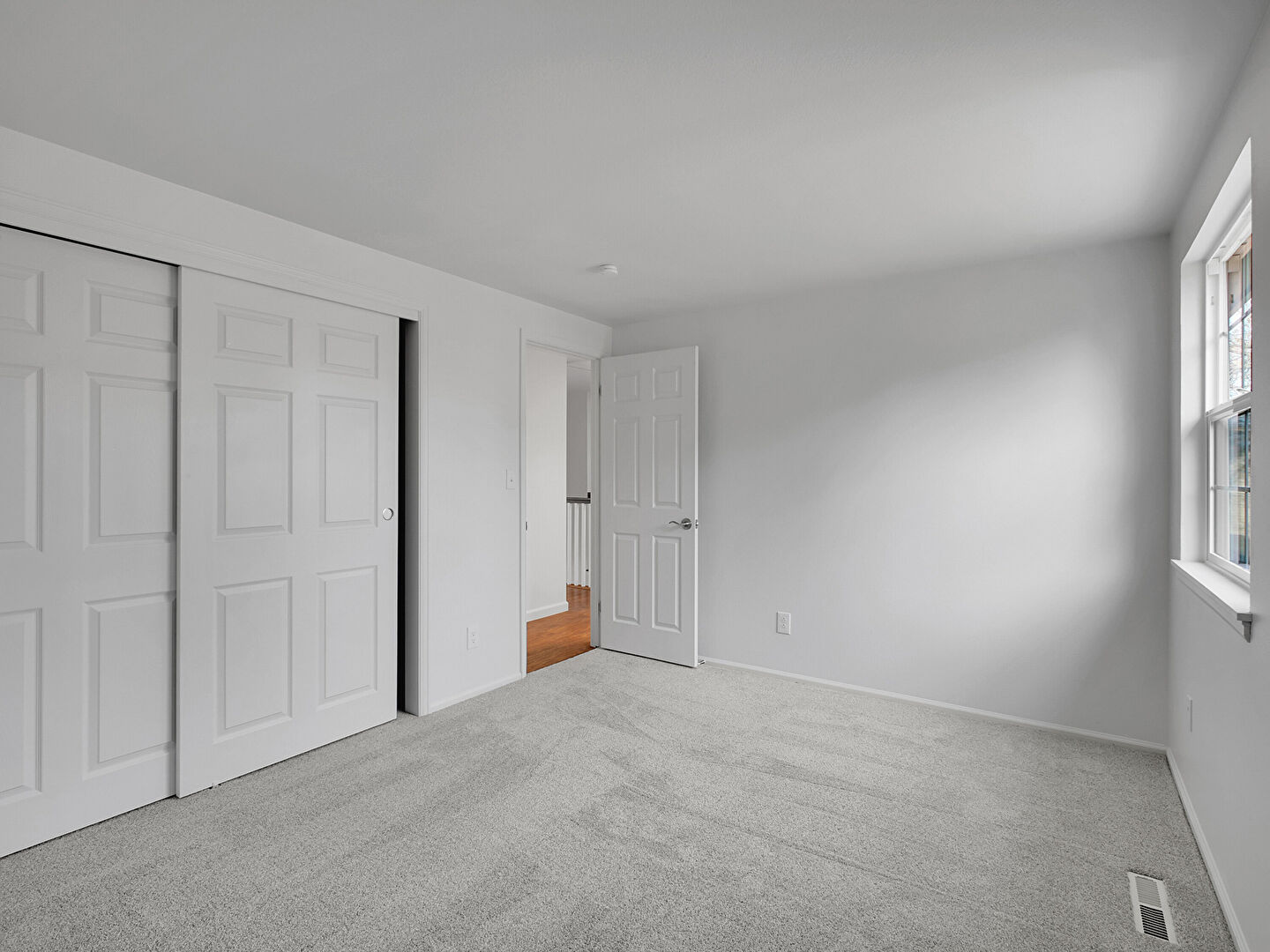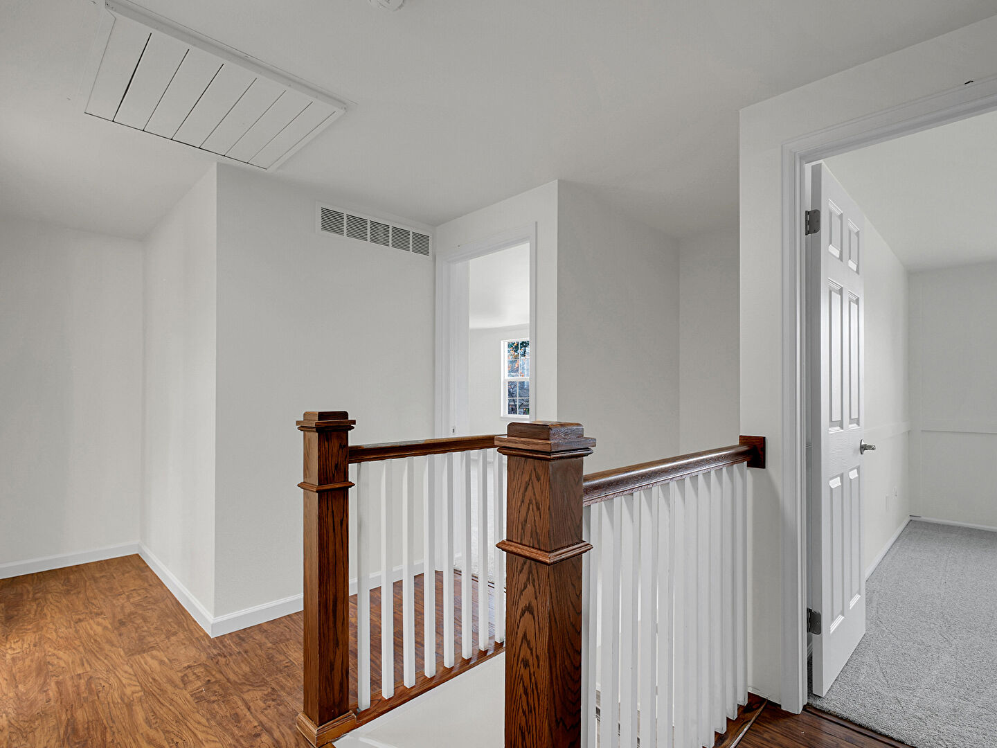 Baseboards Wall, Carpet, Drywall, Natural Light, Vent, Wood Finish Floor, Upstairs Landing