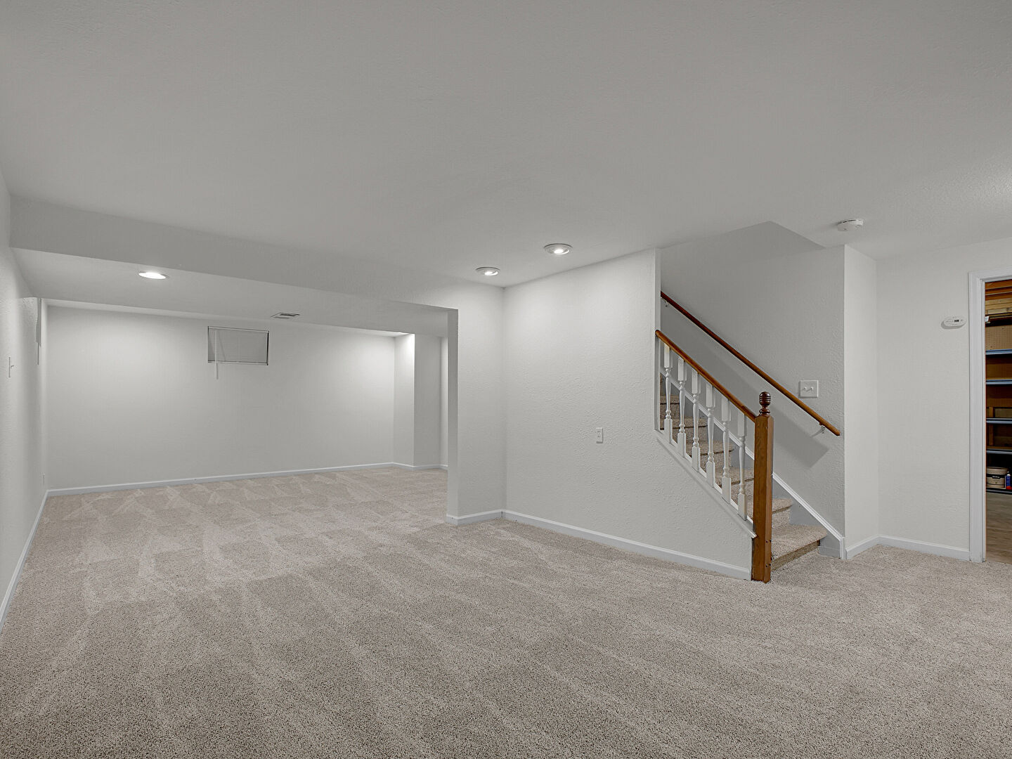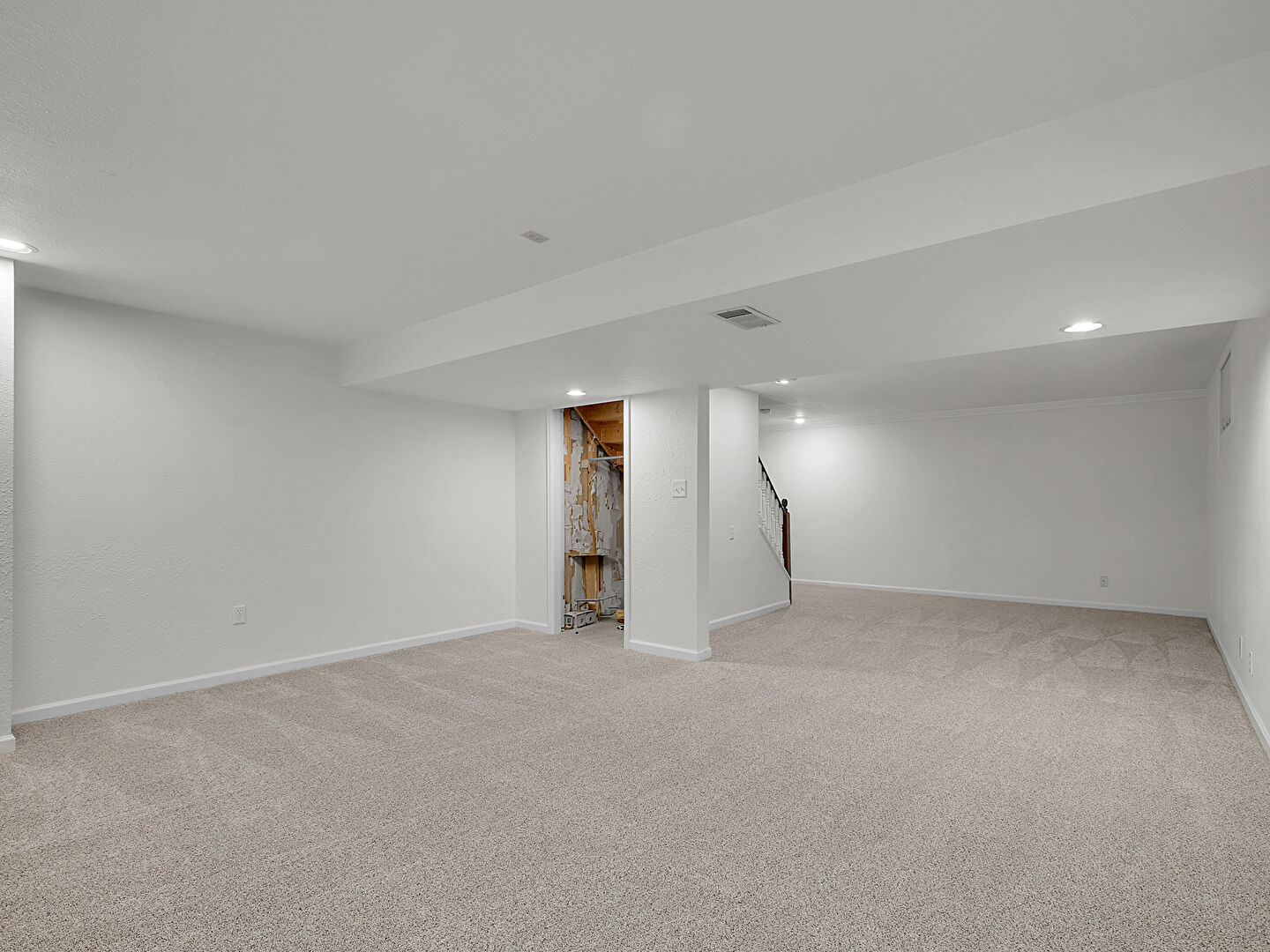 Baseboards Wall, Carpet, Drywall, Recessed Lighting, Stairs, Vent, Basement