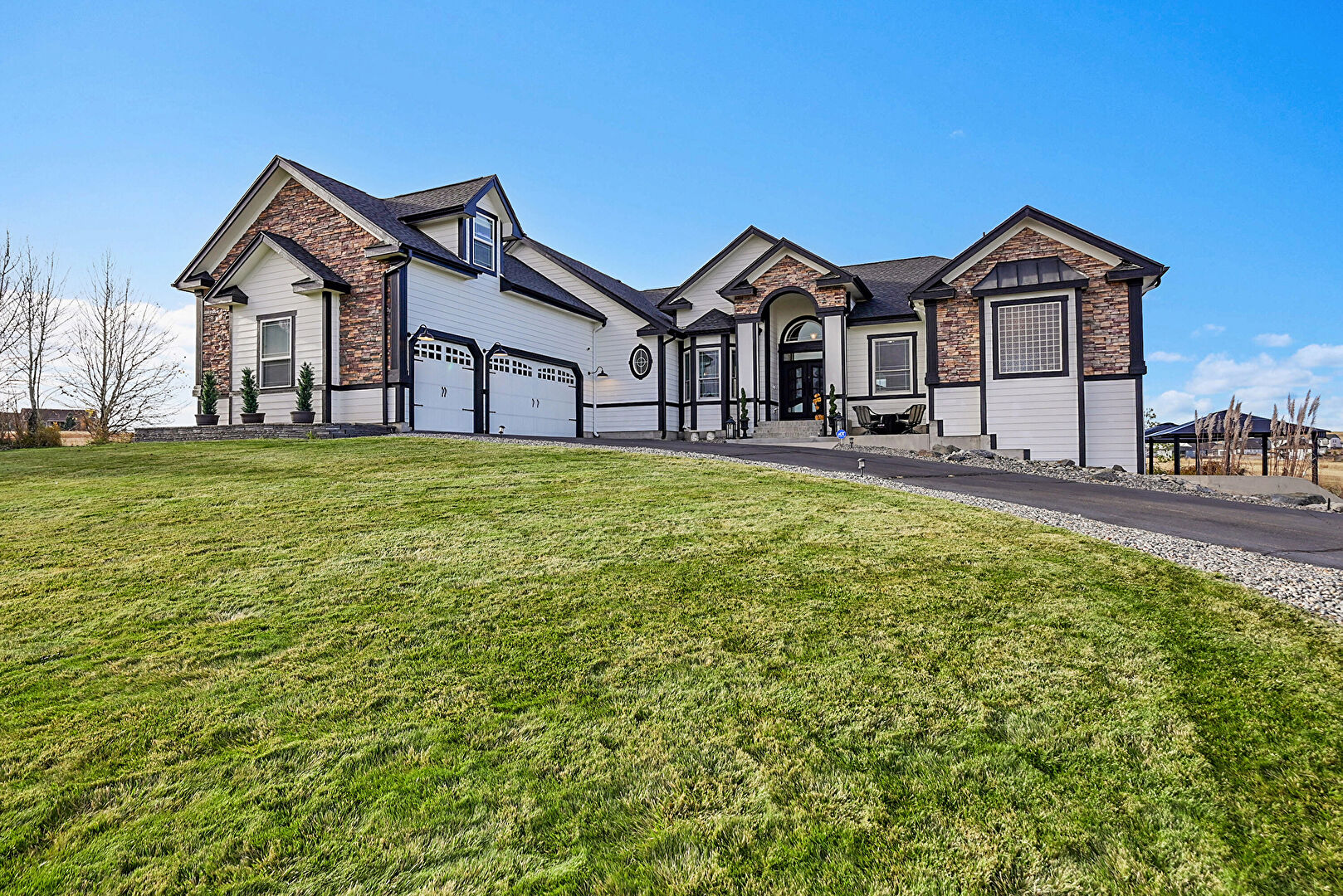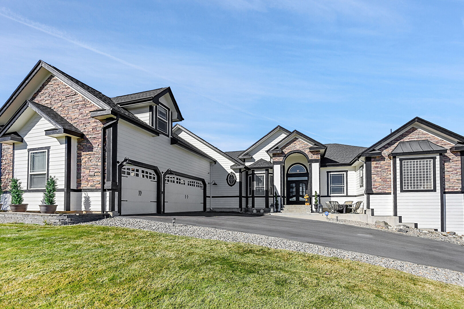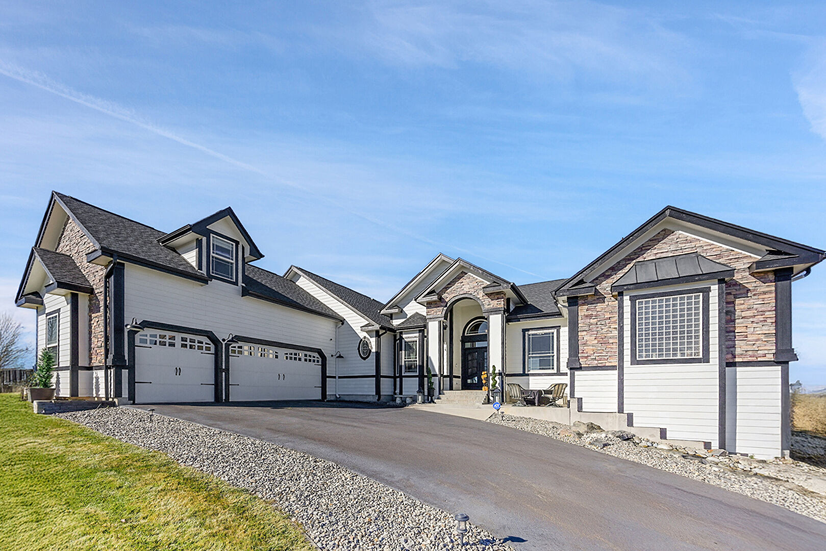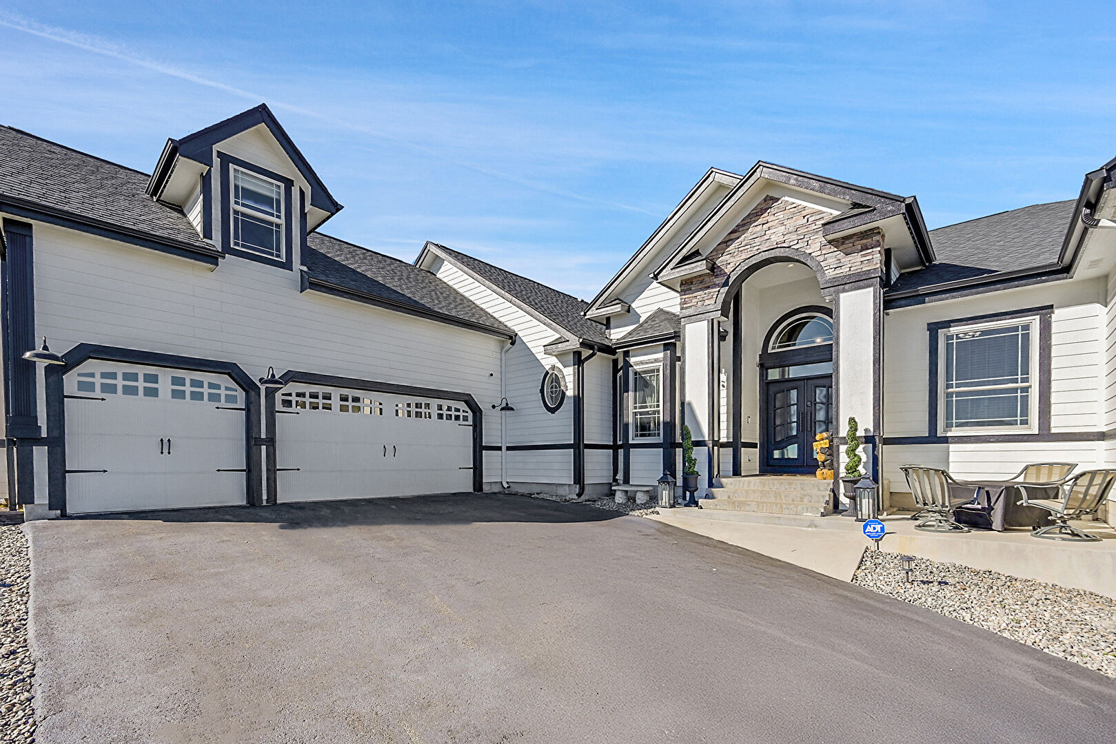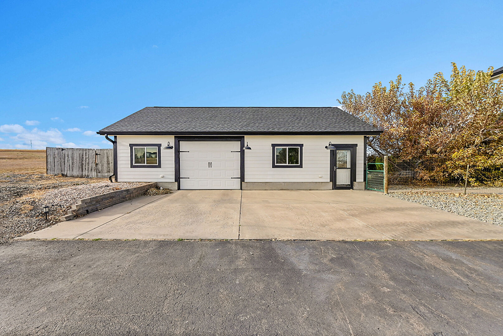 Concrete Foundation, Downspout, Driveway, Fence, Garage, Gutters, Horizontal Siding, Lawn, Outdoor Structure, Parking Pad, Porch, Rural View, Shingle Roof, Stone Siding, Stucco Siding, Concrete Foundation, Downspout, Driveway, Fence, Garage, Lawn, Stucco Siding