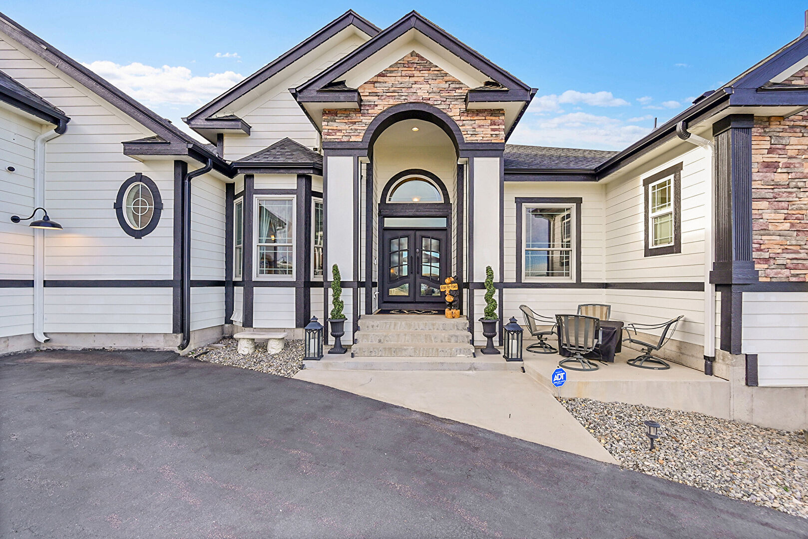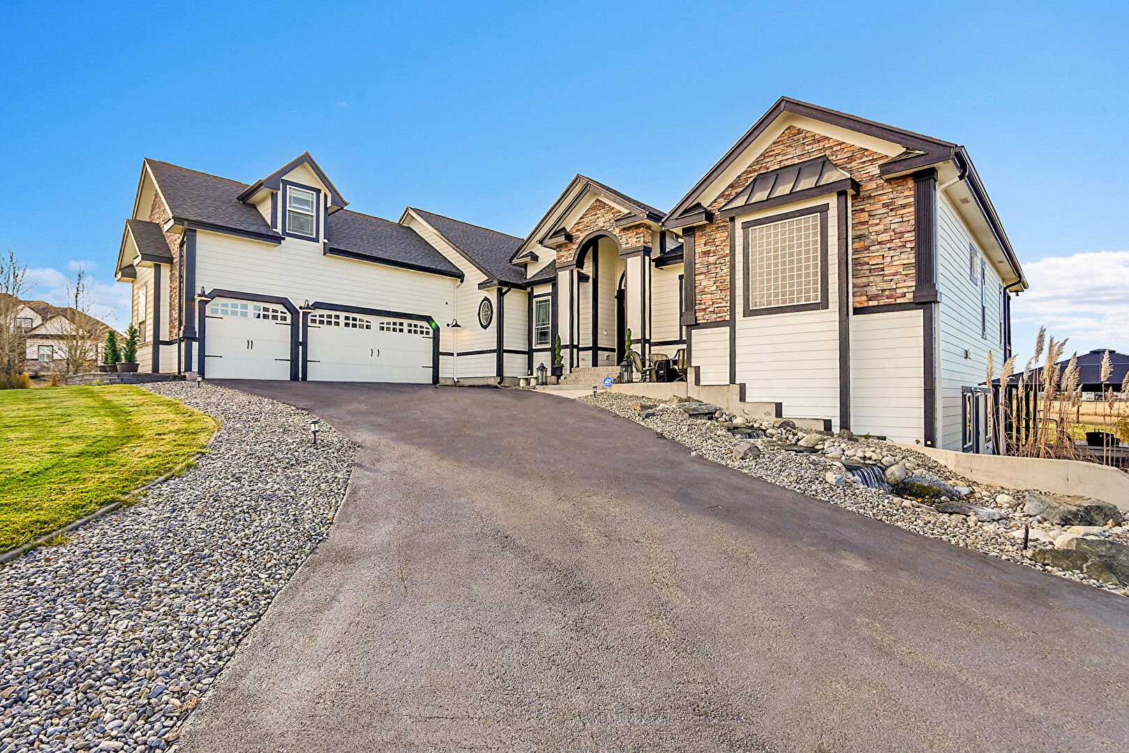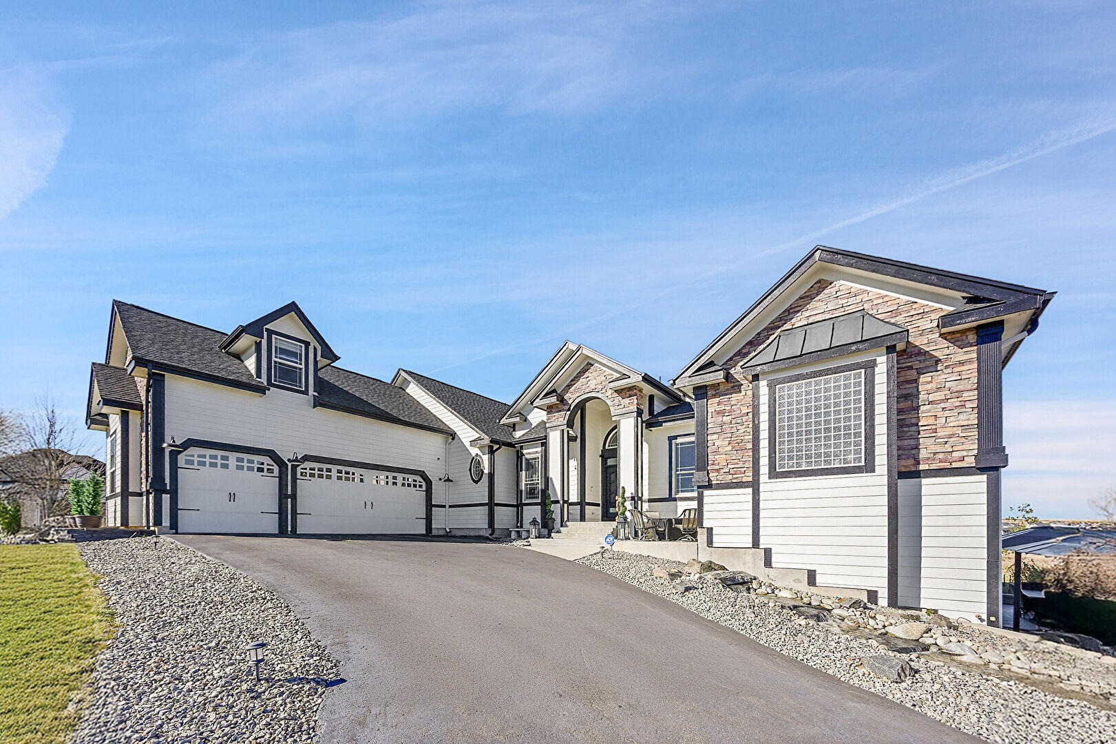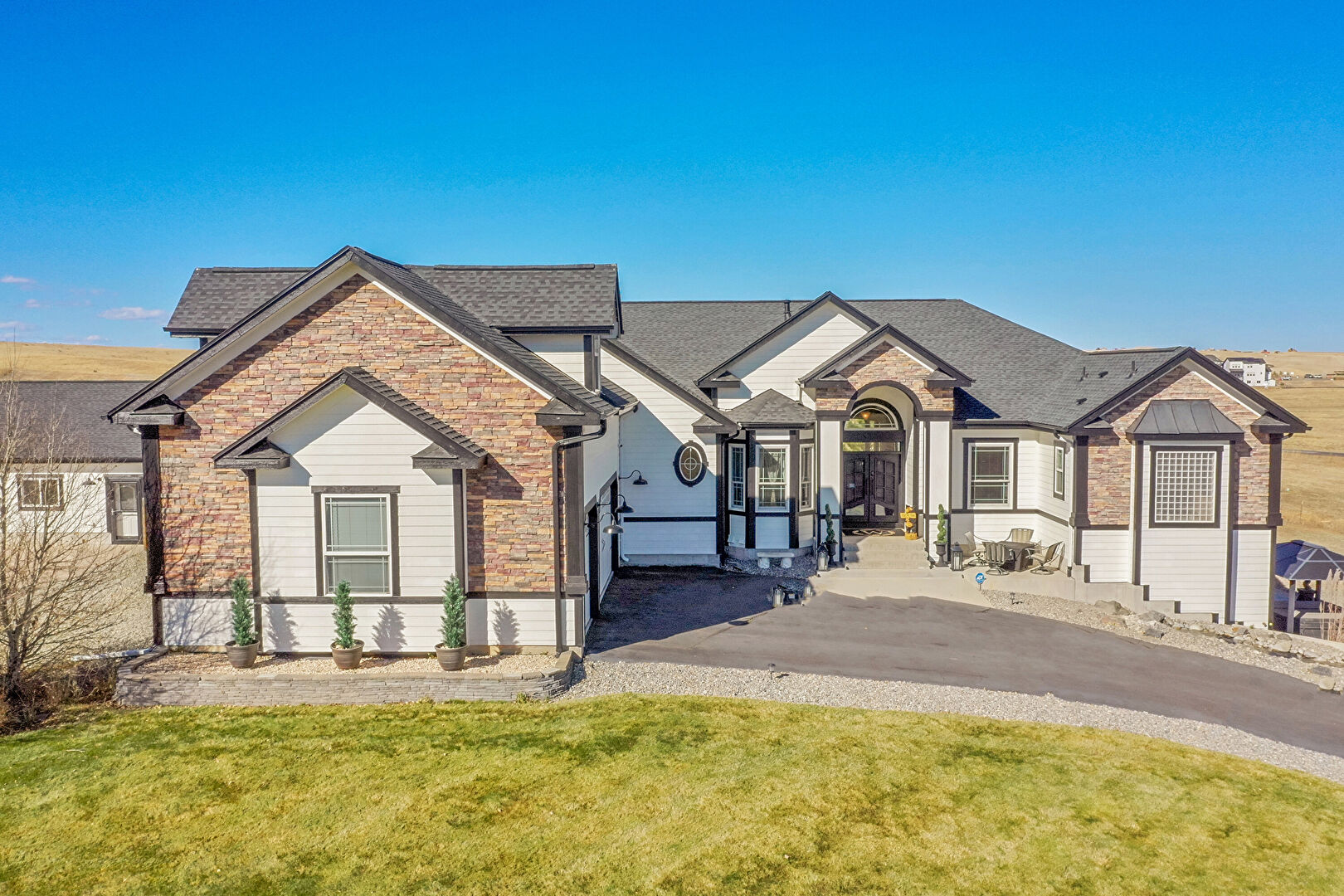 Concrete Foundation, Downspout, Driveway, Fence, Garage, Gutters, Horizontal Siding, Lawn, Outdoor Structure, Parking Pad, Porch, Rural View, Shingle Roof, Stone Siding, Stucco Siding, Concrete Foundation, Downspout, Driveway, Fence, Garage, Lawn, Stucco Siding
