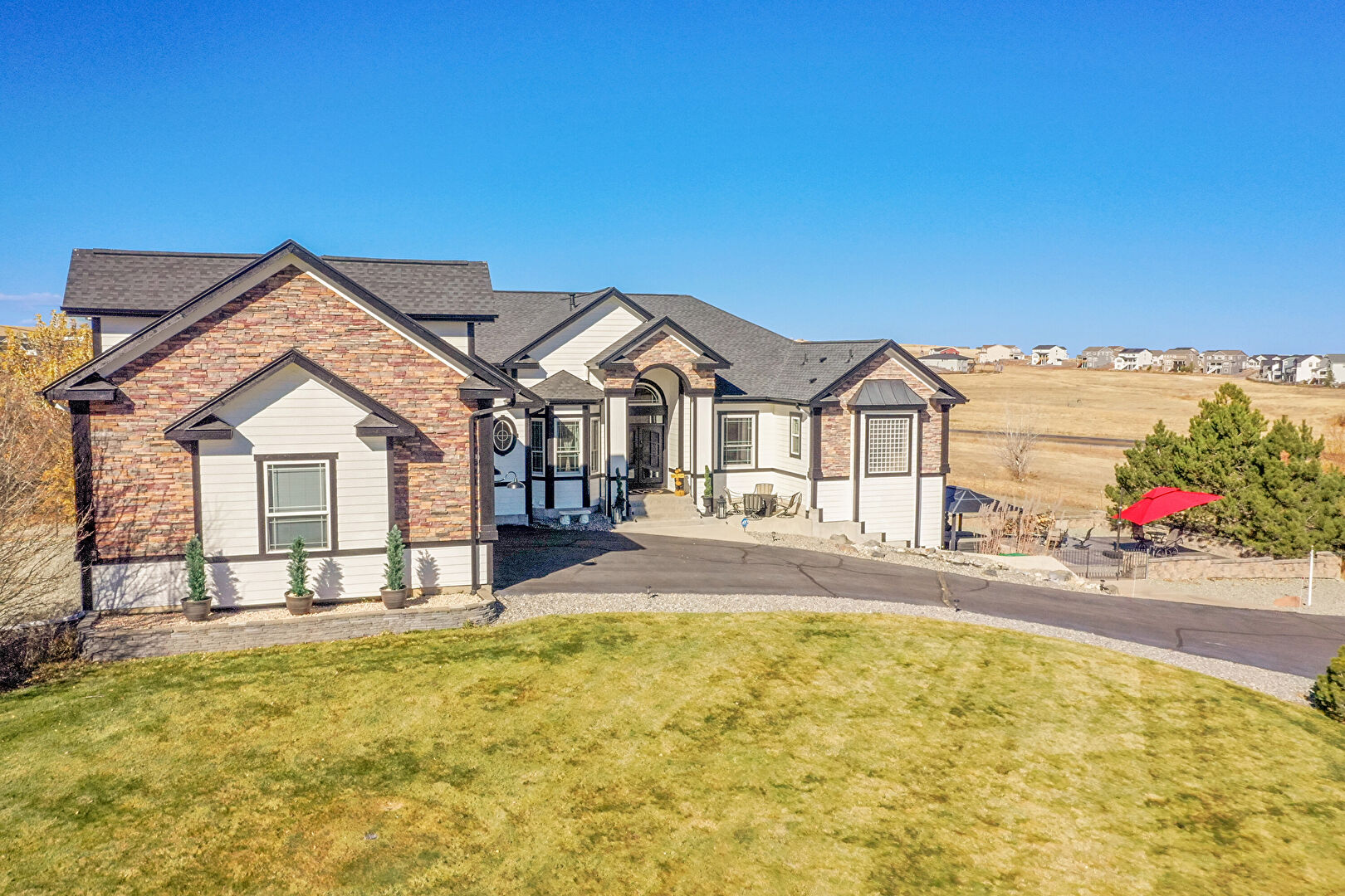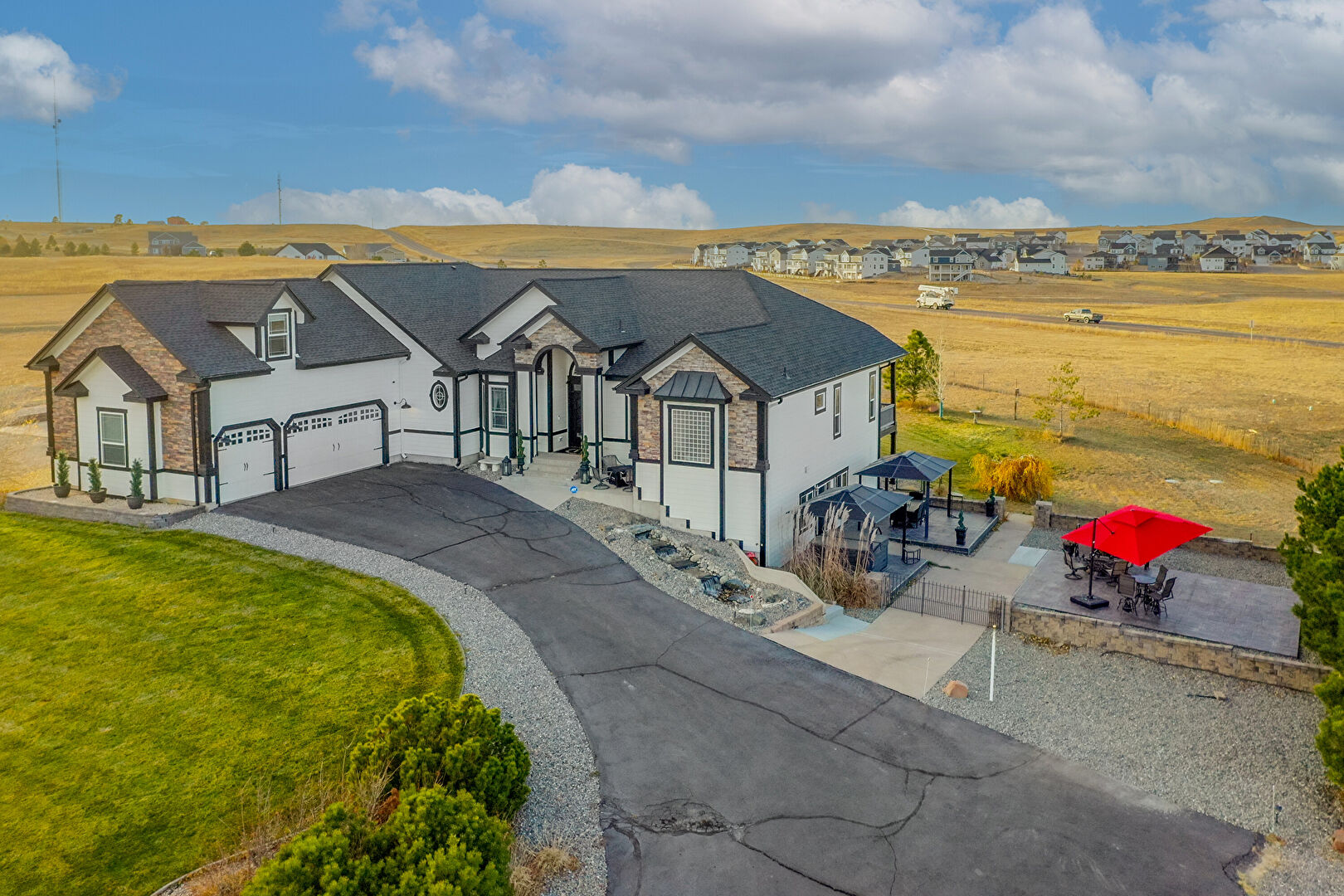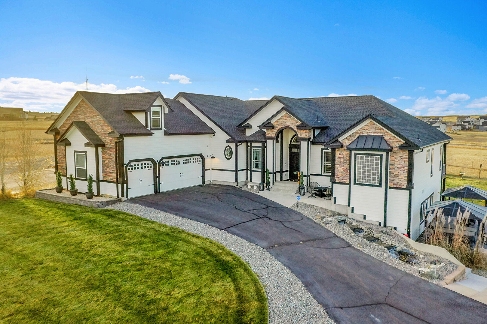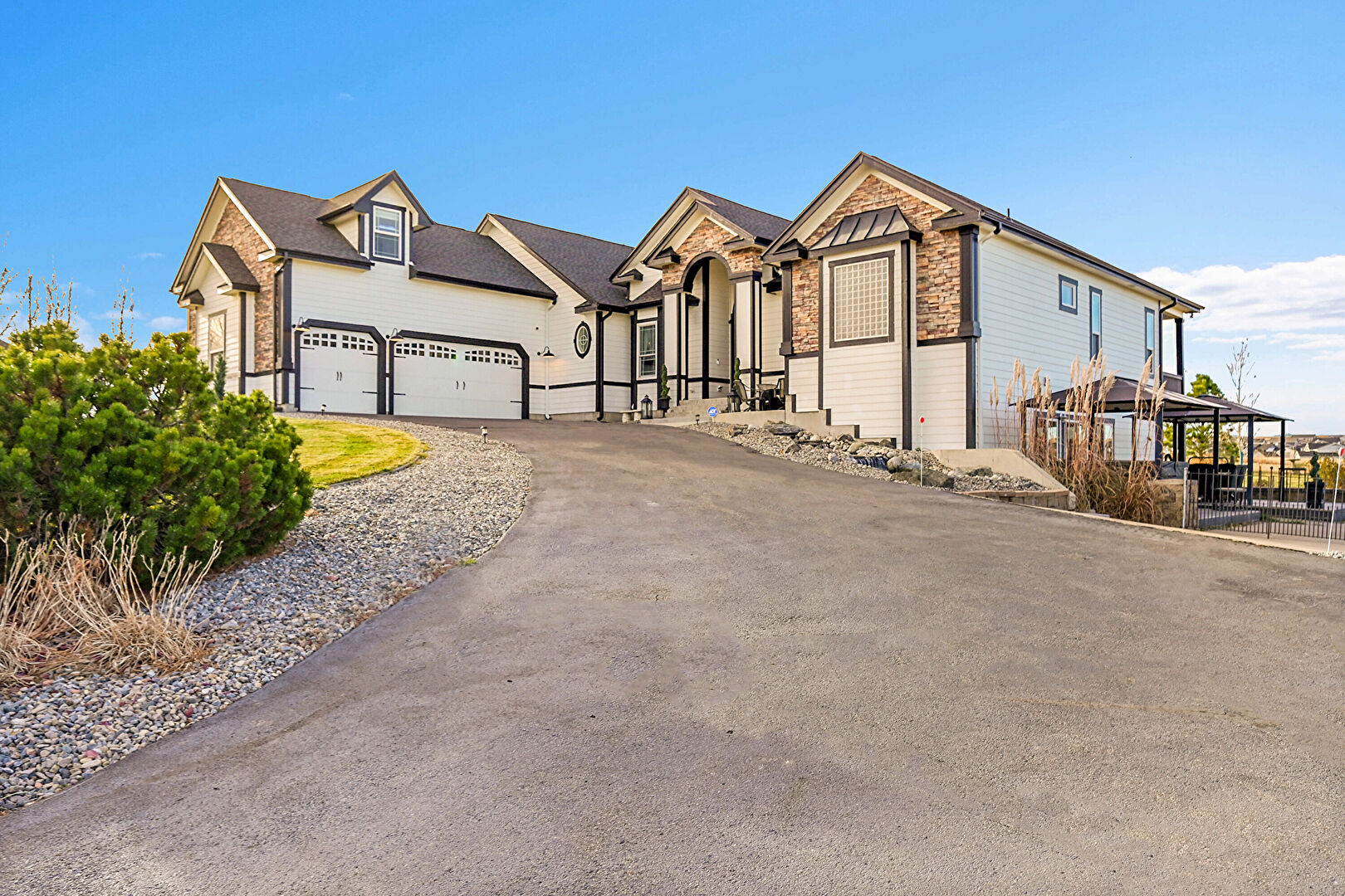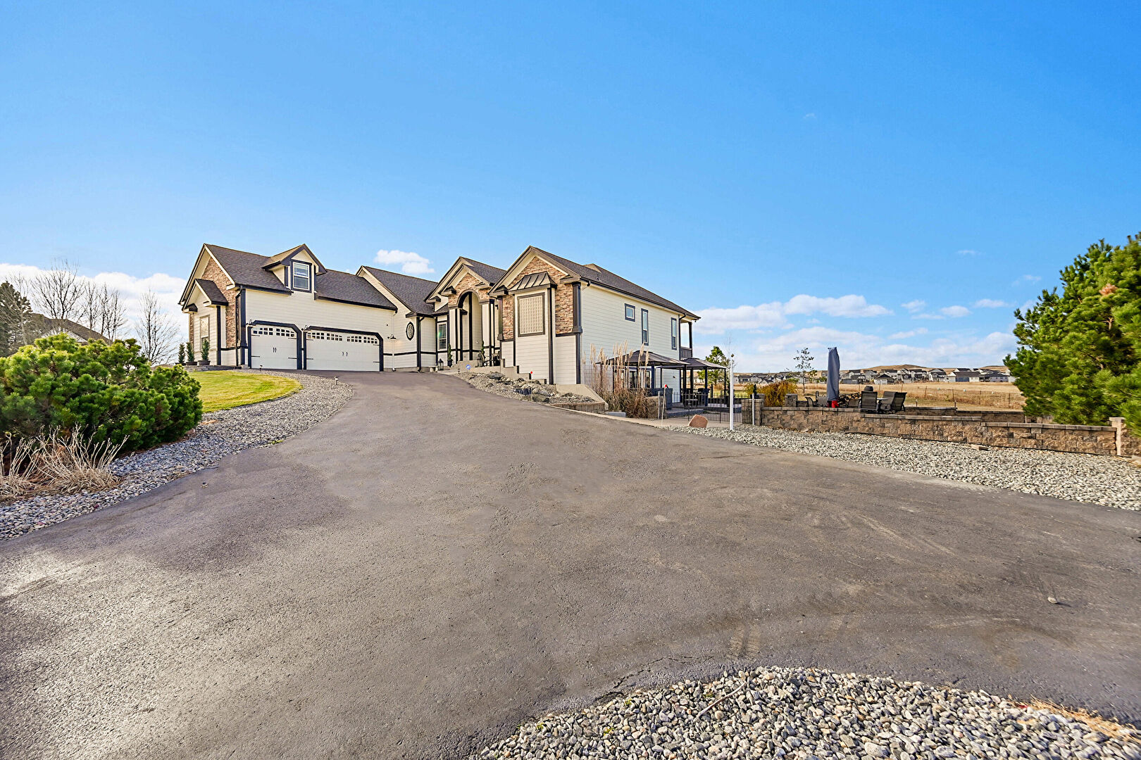 Concrete Foundation, Downspout, Driveway, Fence, Garage, Gutters, Horizontal Siding, Lawn, Outdoor Structure, Parking Pad, Porch, Rural View, Shingle Roof, Stone Siding, Stucco Siding, Concrete Foundation, Downspout, Driveway, Fence, Garage, Lawn, Stucco Siding