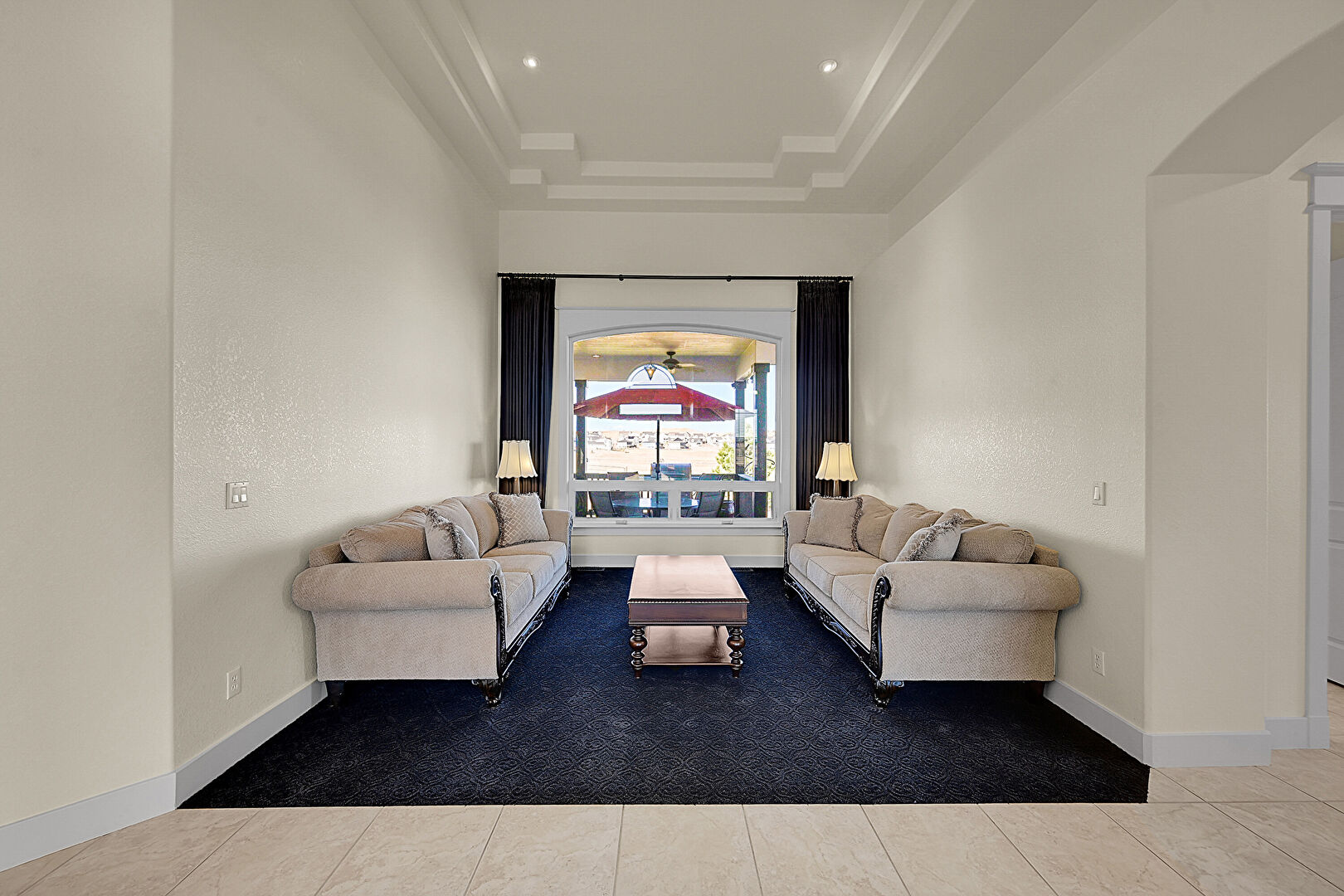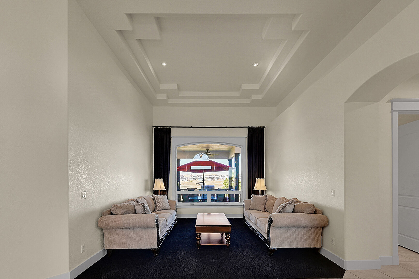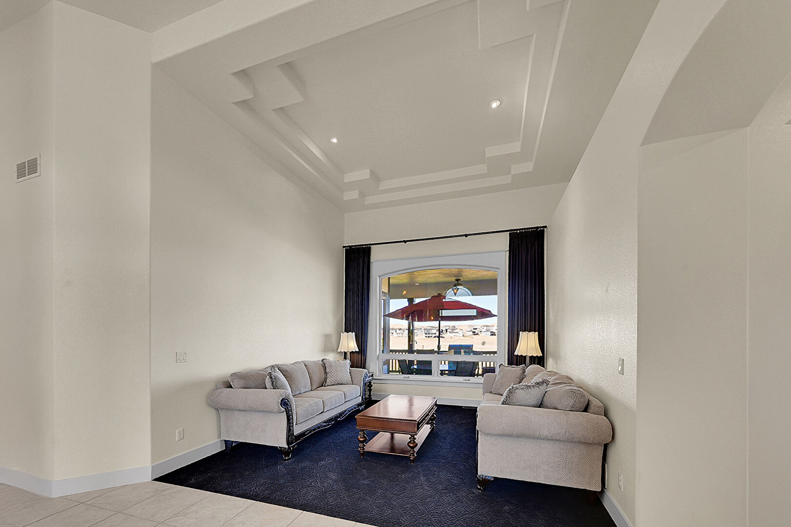 Arched Walkways, Baseboards Wall, Ceiling Fan, Drywall, French Doors, High Ceiling, Natural Light, Notable Chandelier, Recessed Lighting, Textured Wall, Tile Floor, Tray Ceiling, Vent, Baseboards Wall, Natural Light, Recessed Lighting, Tile Floor, Tray Ceiling
