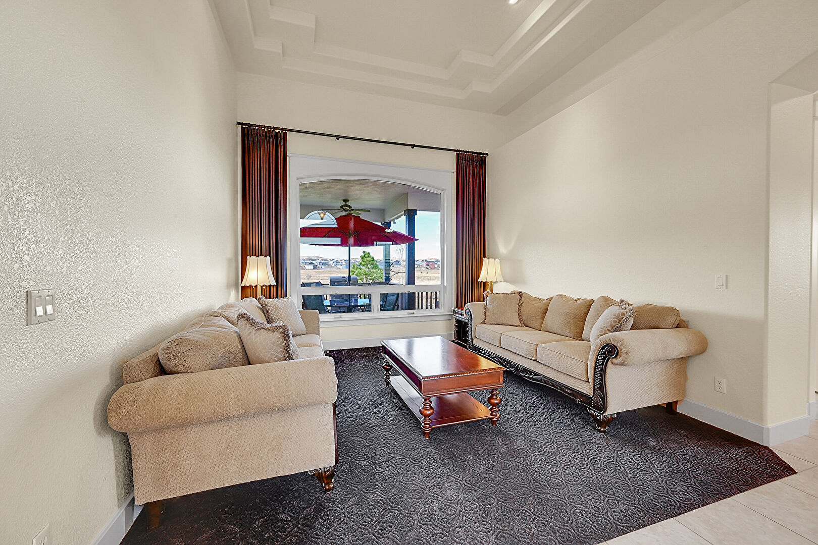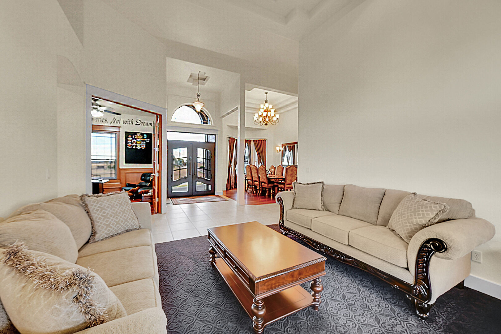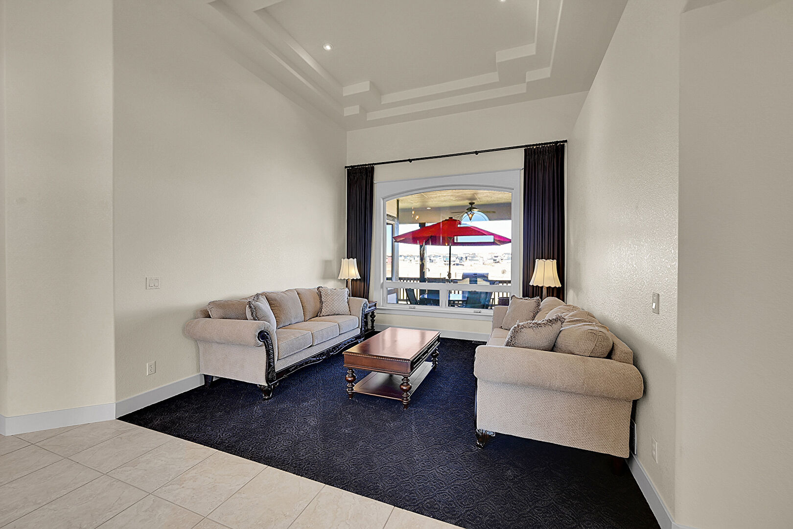 Arched Walkways, Baseboards Wall, Ceiling Fan, Drywall, French Doors, High Ceiling, Natural Light, Notable Chandelier, Recessed Lighting, Textured Wall, Tile Floor, Tray Ceiling, Vent, Baseboards Wall, Natural Light, Recessed Lighting, Tile Floor, Tray Ceiling
