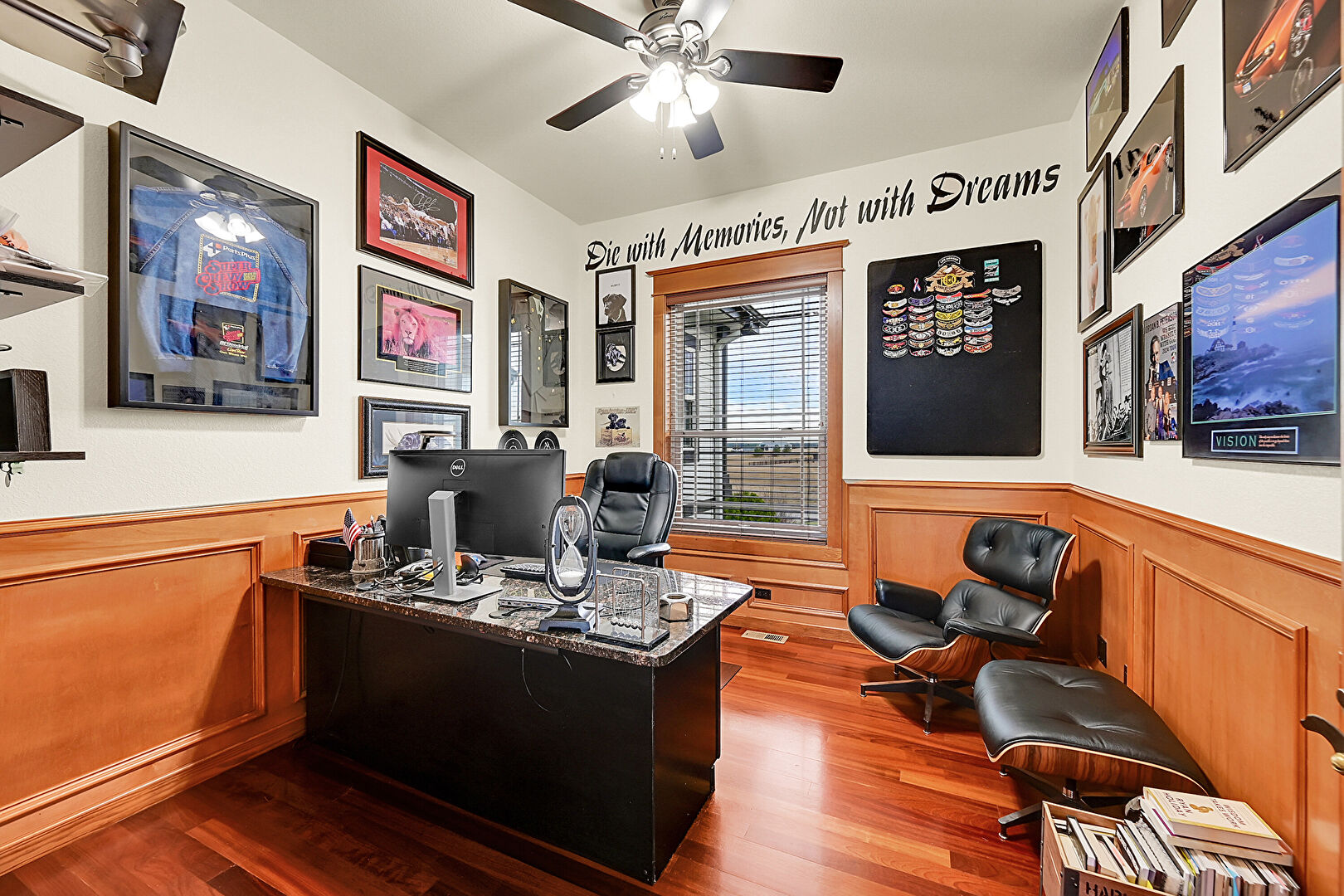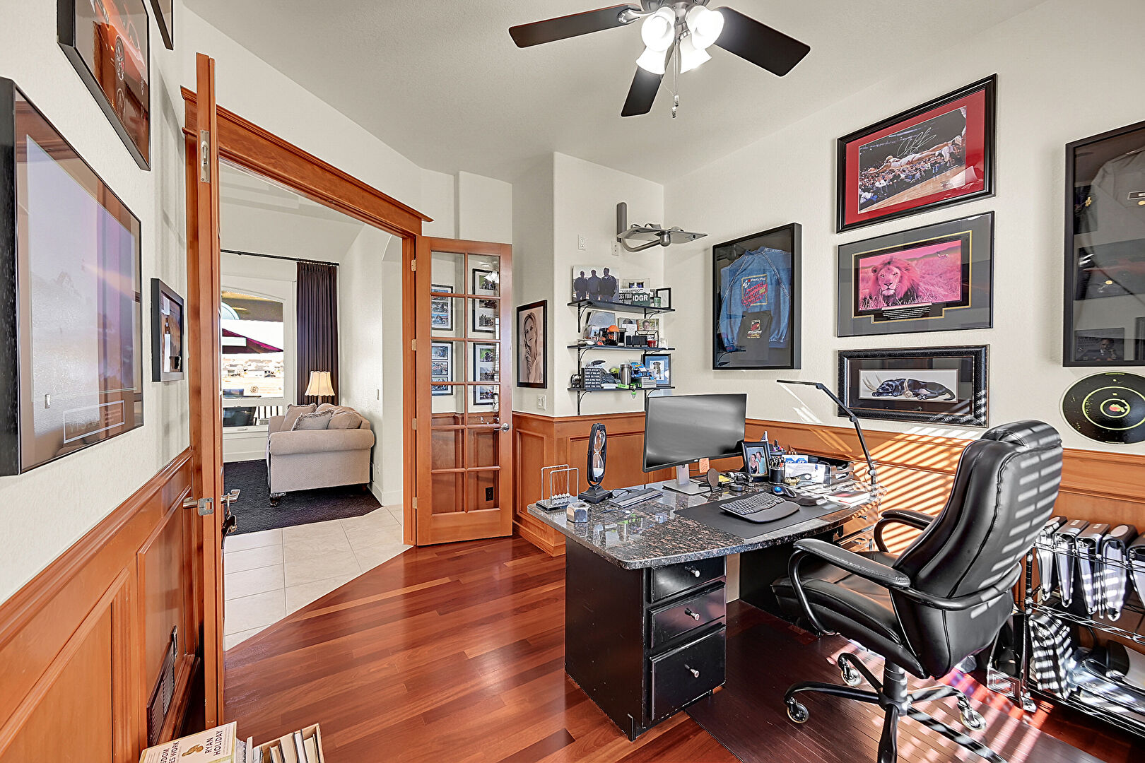 Ceiling Fan, Drywall, Natural Light, Office Area, Paneling Wall, Vent, Wainscot Wall, Wood Finish Floor, French Doors, Tile Floor, Wood Finish Floor