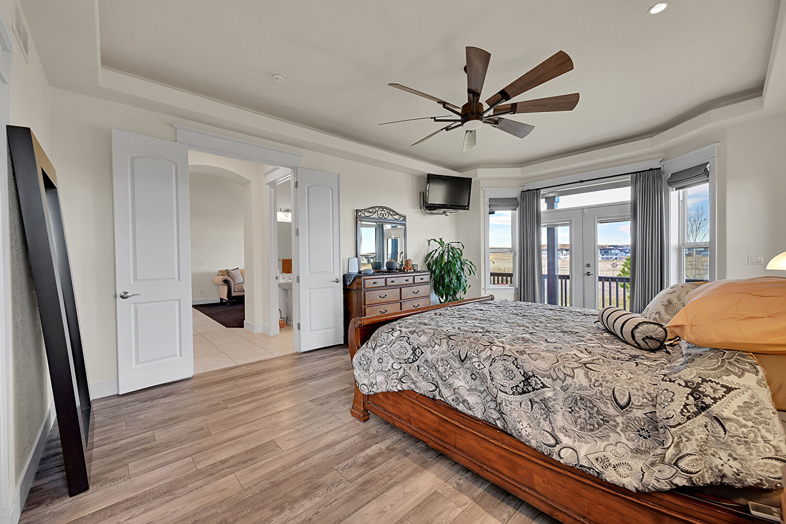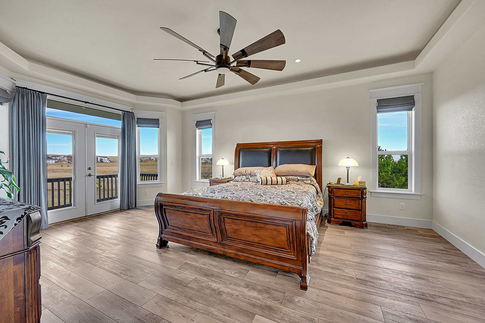Access To Exterior, Arched Walkways, Baseboards Wall, Ceiling Fan, Drywall, Ensuite Bathroom, French Doors, Natural Light, Recessed Lighting, Tray Ceiling, Vent, Wood Finish Floor, Access To Exterior, Baseboards Wall, Recessed Lighting