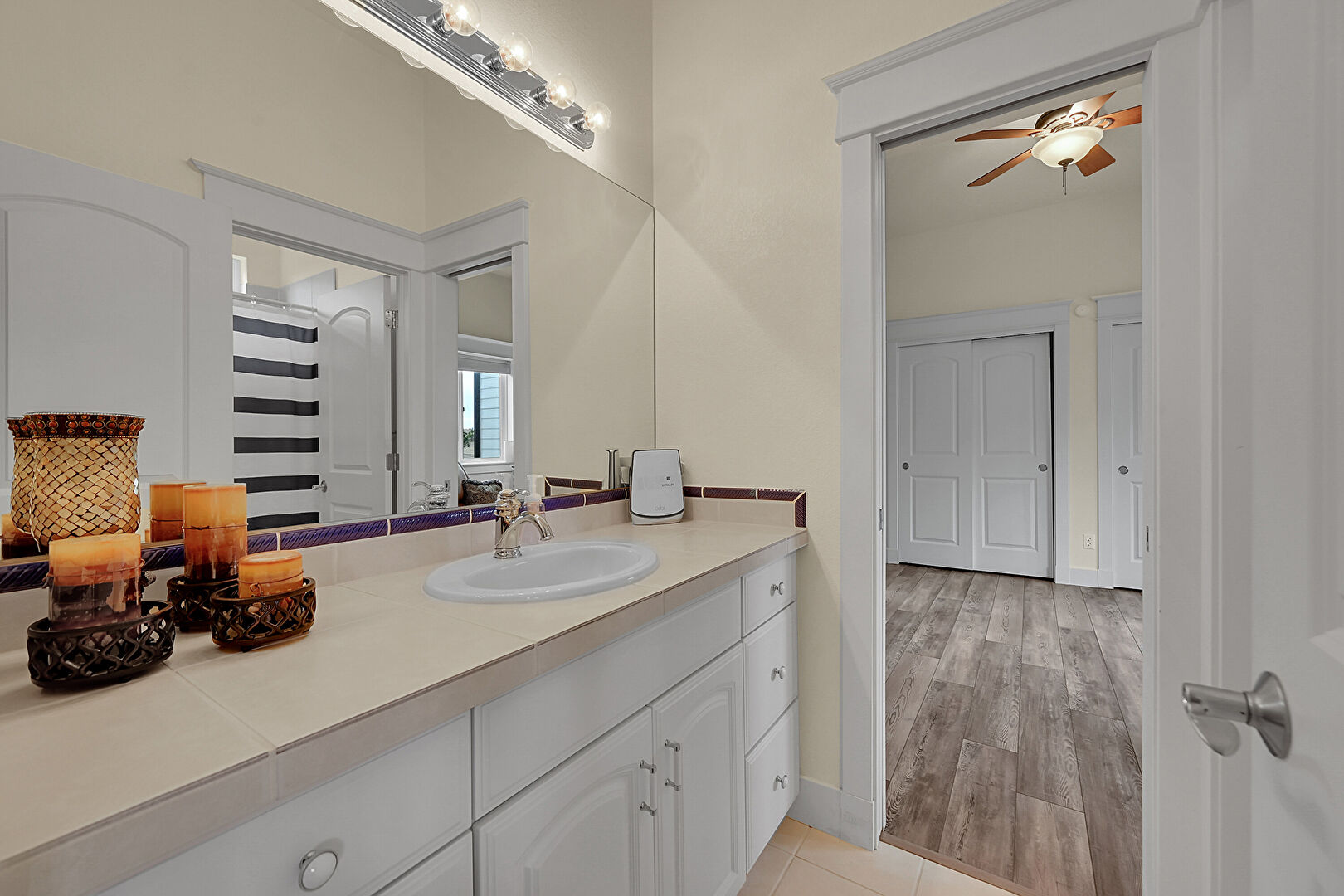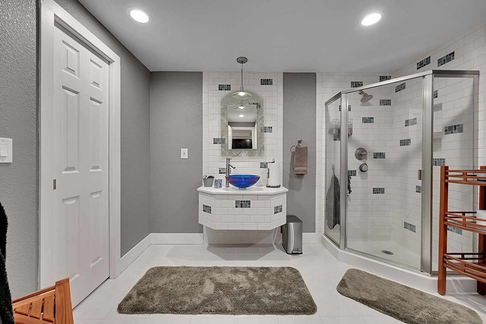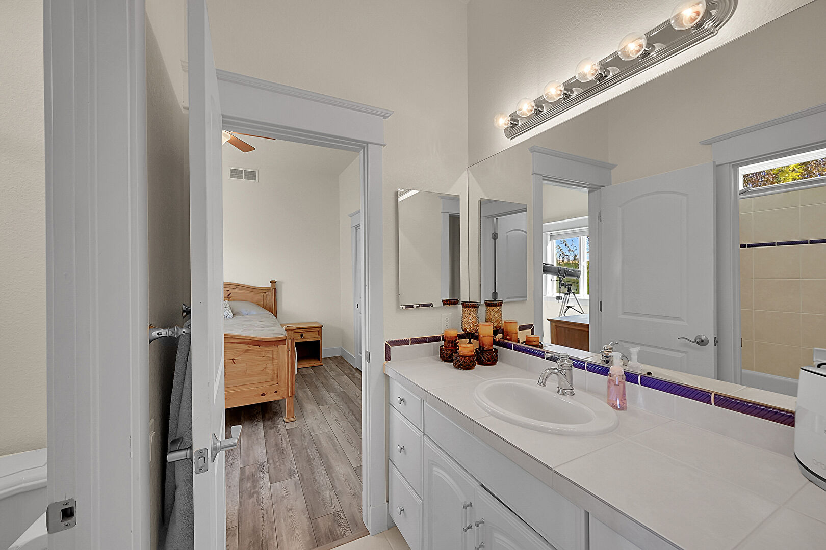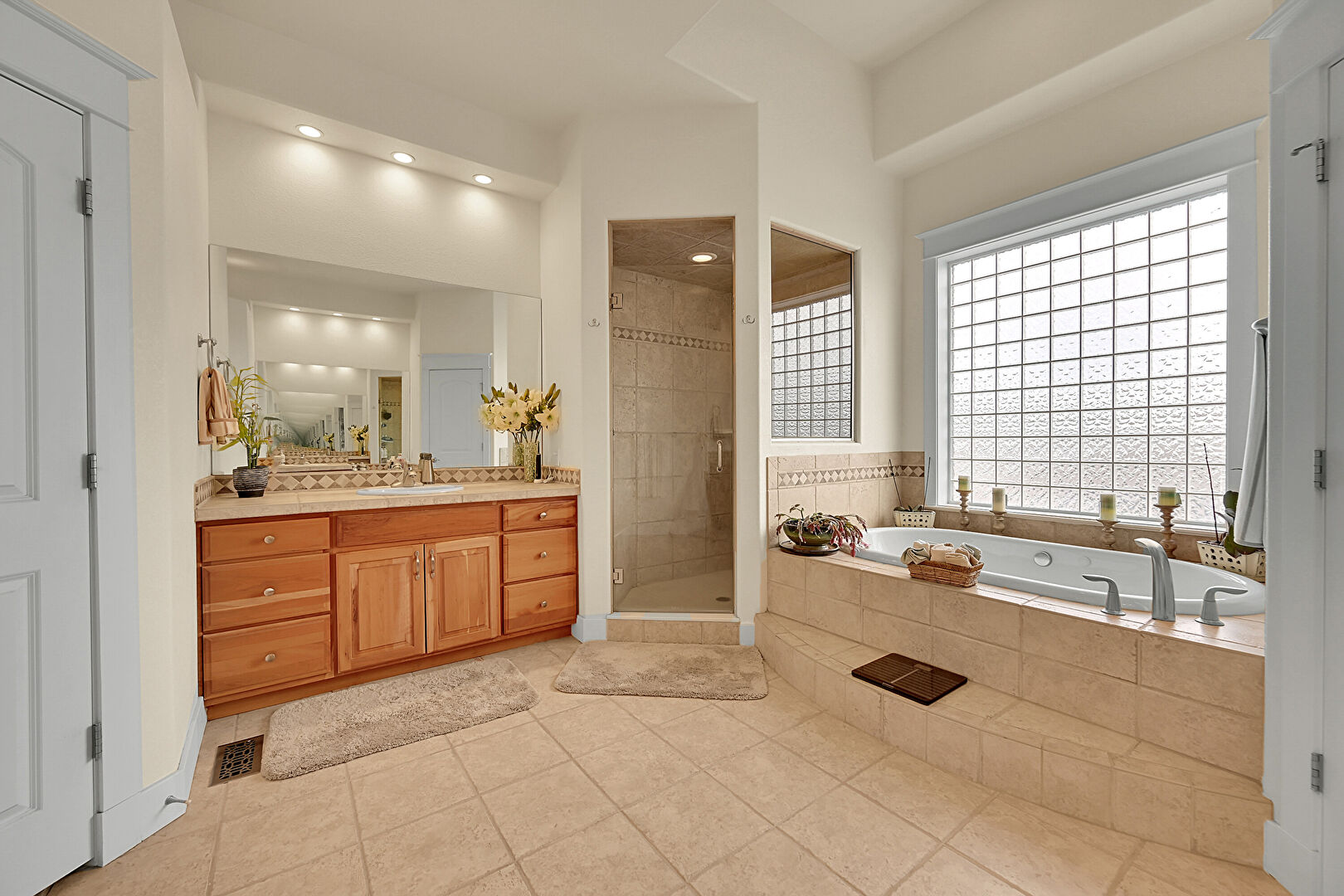 Baseboards Wall, Built In Shelves, Ceiling Fan, Closet, Combined Bath Shower, Drywall, Ensuite Bathroom, Full Bathroom, Half Bathroom, Natural Light, Notable Chandelier, Recessed Lighting, Tile Floor, Two Single Vanities, Vanity, Vaulted Ceiling, Vent, Wood Finish Floor, Baseboards Wall, Combined Bath Shower, Drywall, Natural Light, Tile Floor, Vanity