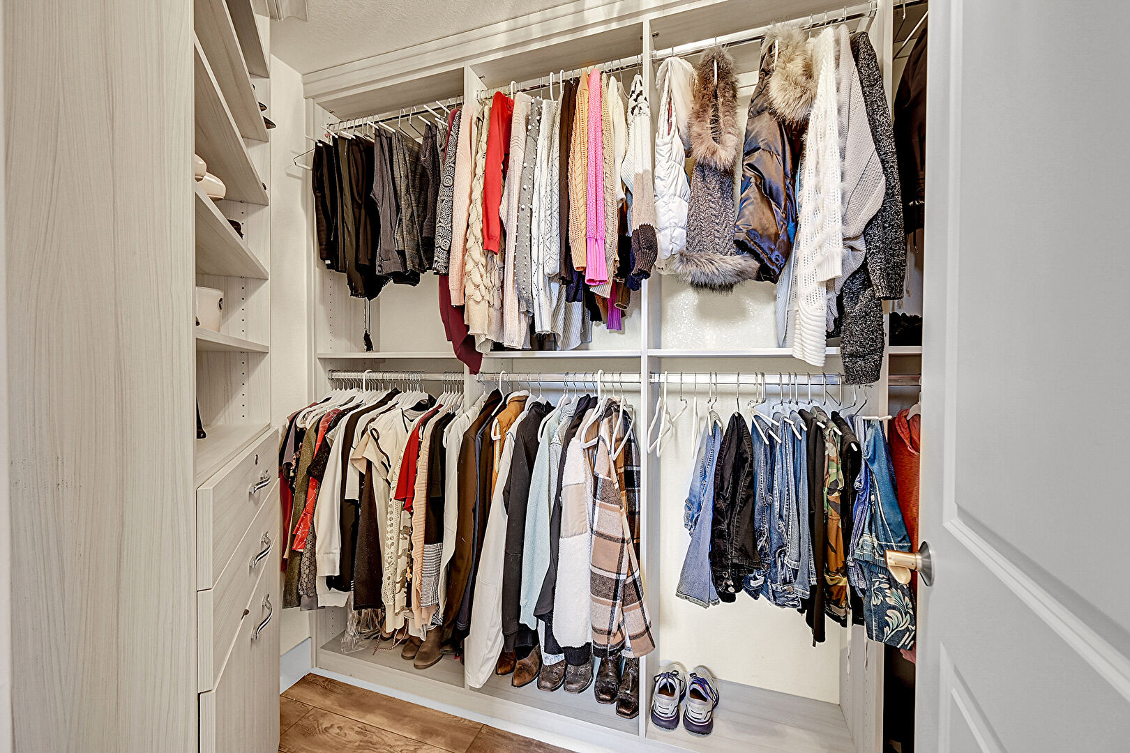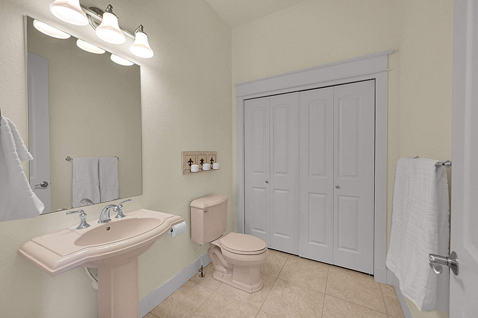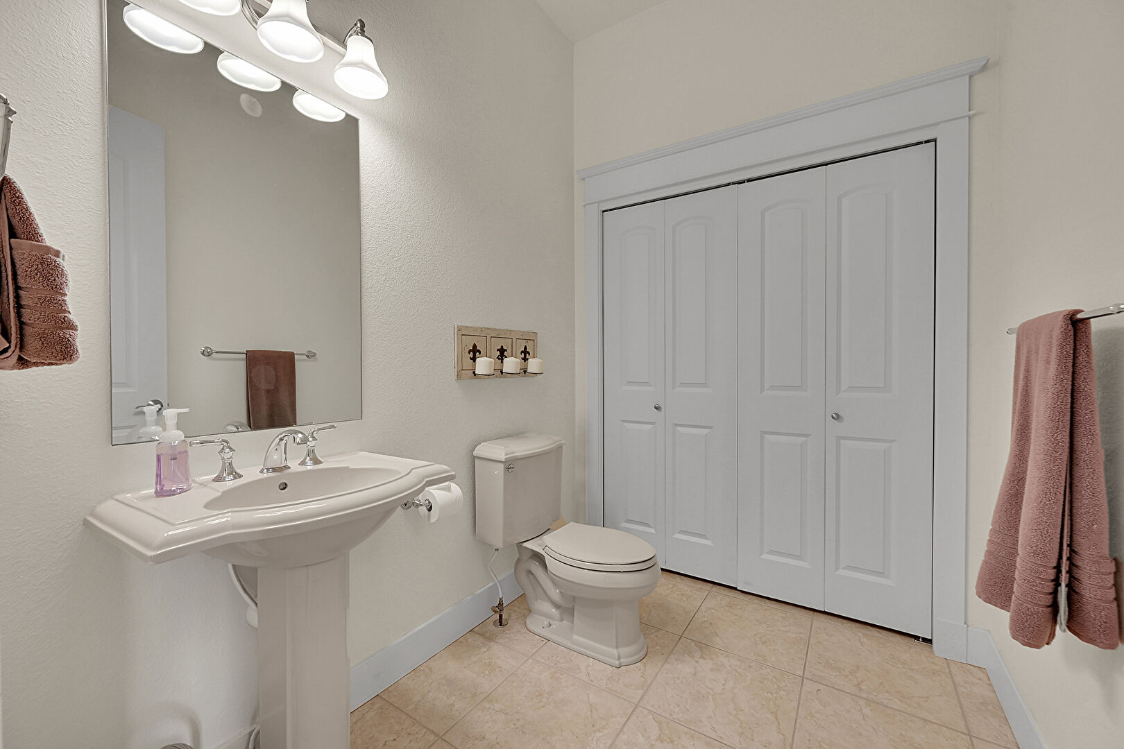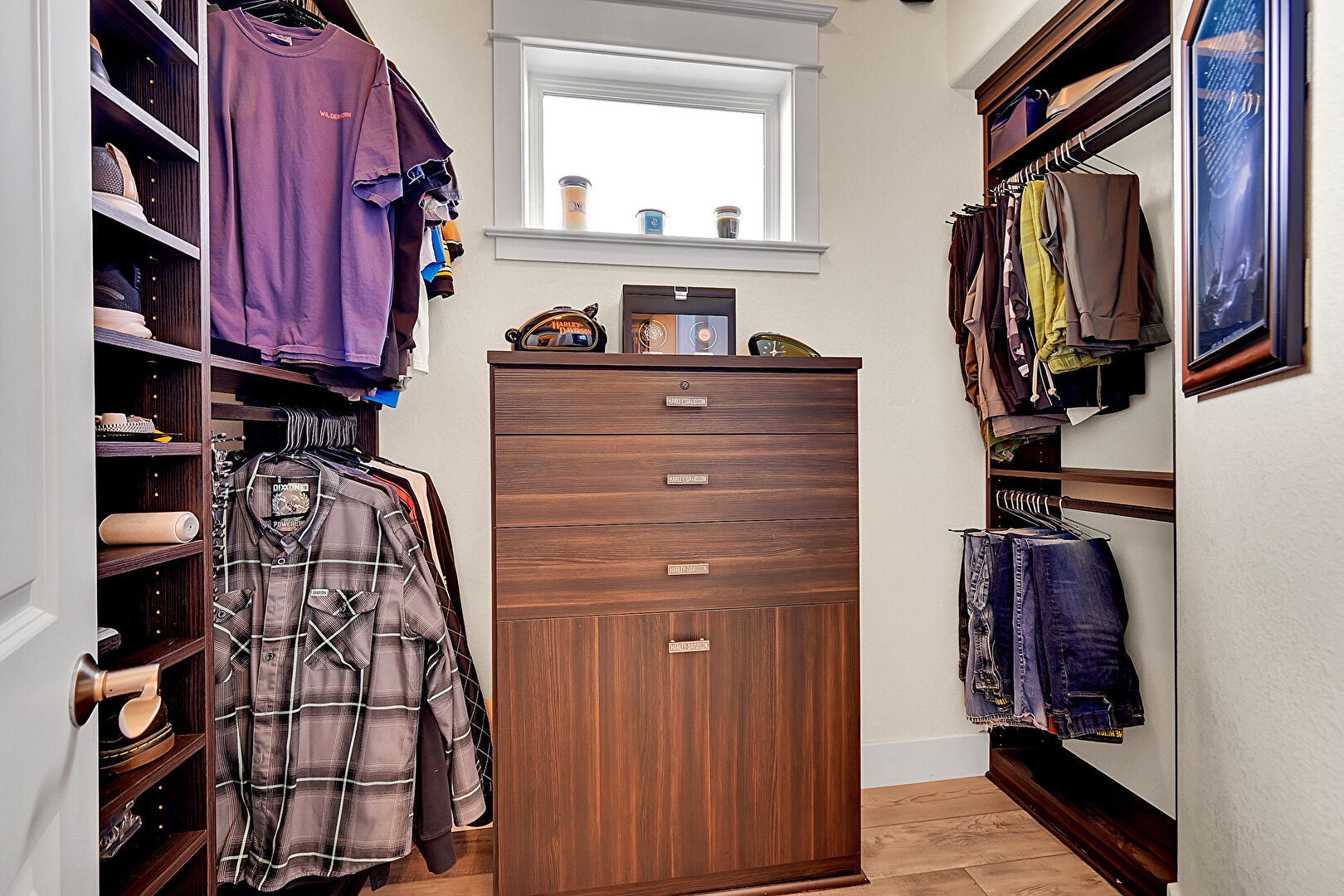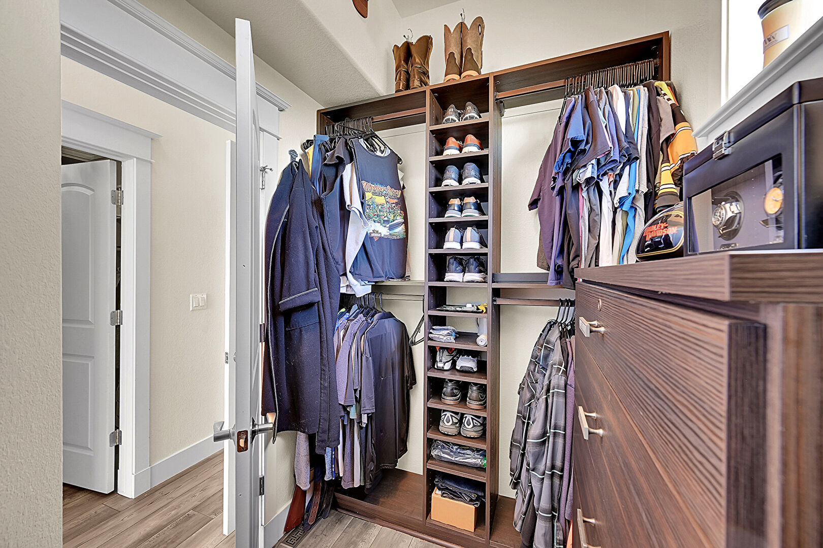Baseboards Wall, Built In Shelves, Ceiling Fan, Closet, Combined Bath Shower, Drywall, Ensuite Bathroom, Full Bathroom, Half Bathroom, Natural Light, Notable Chandelier, Recessed Lighting, Tile Floor, Two Single Vanities, Vanity, Vaulted Ceiling, Vent, Wood Finish Floor, Baseboards Wall, Combined Bath Shower, Drywall, Natural Light, Tile Floor, Vanity