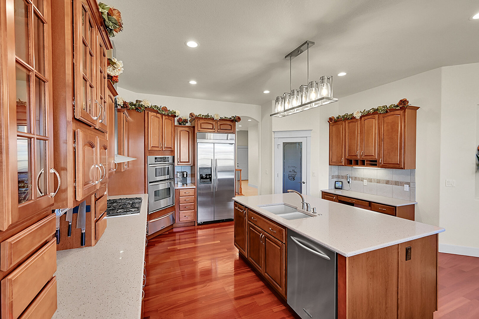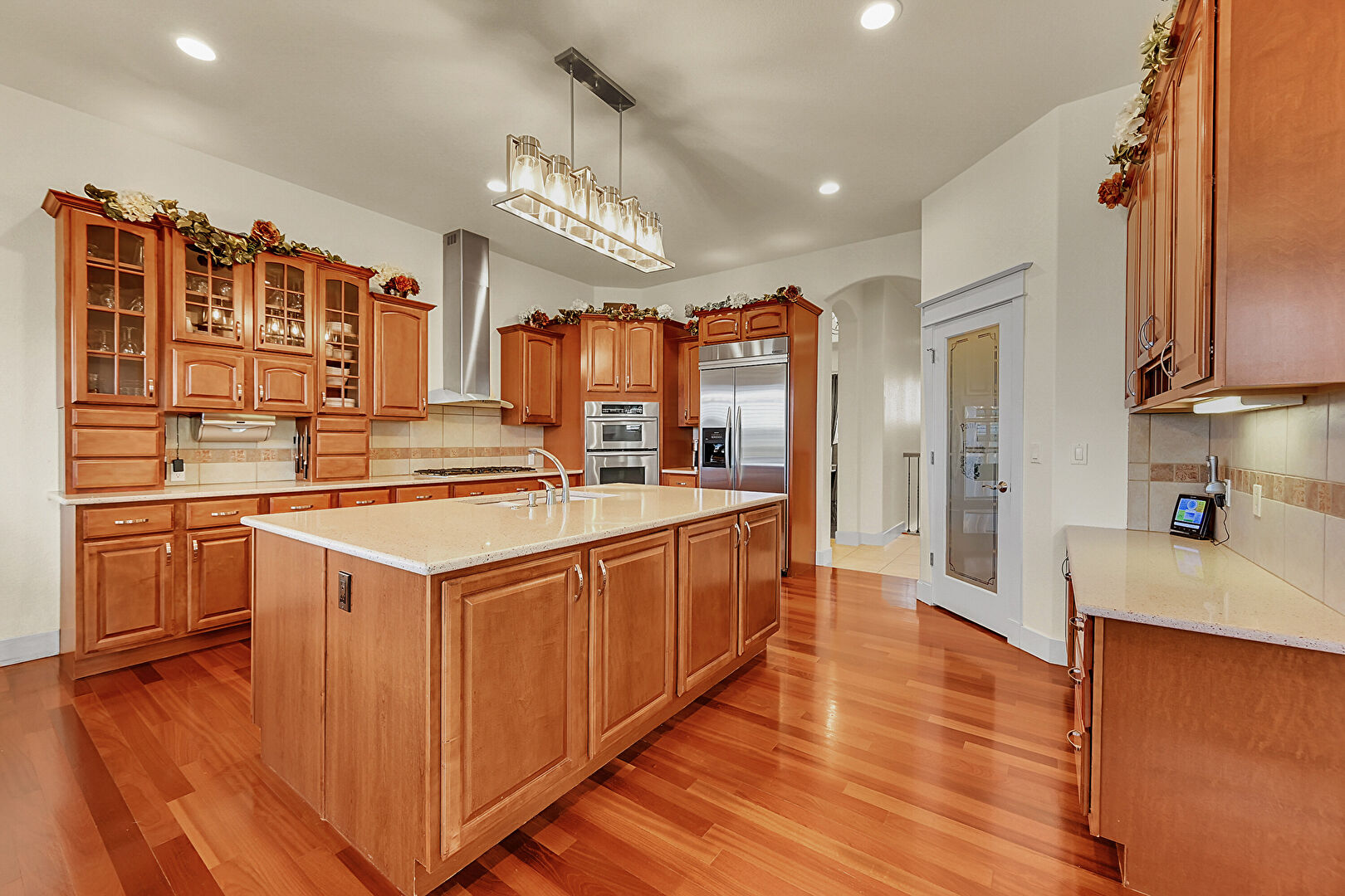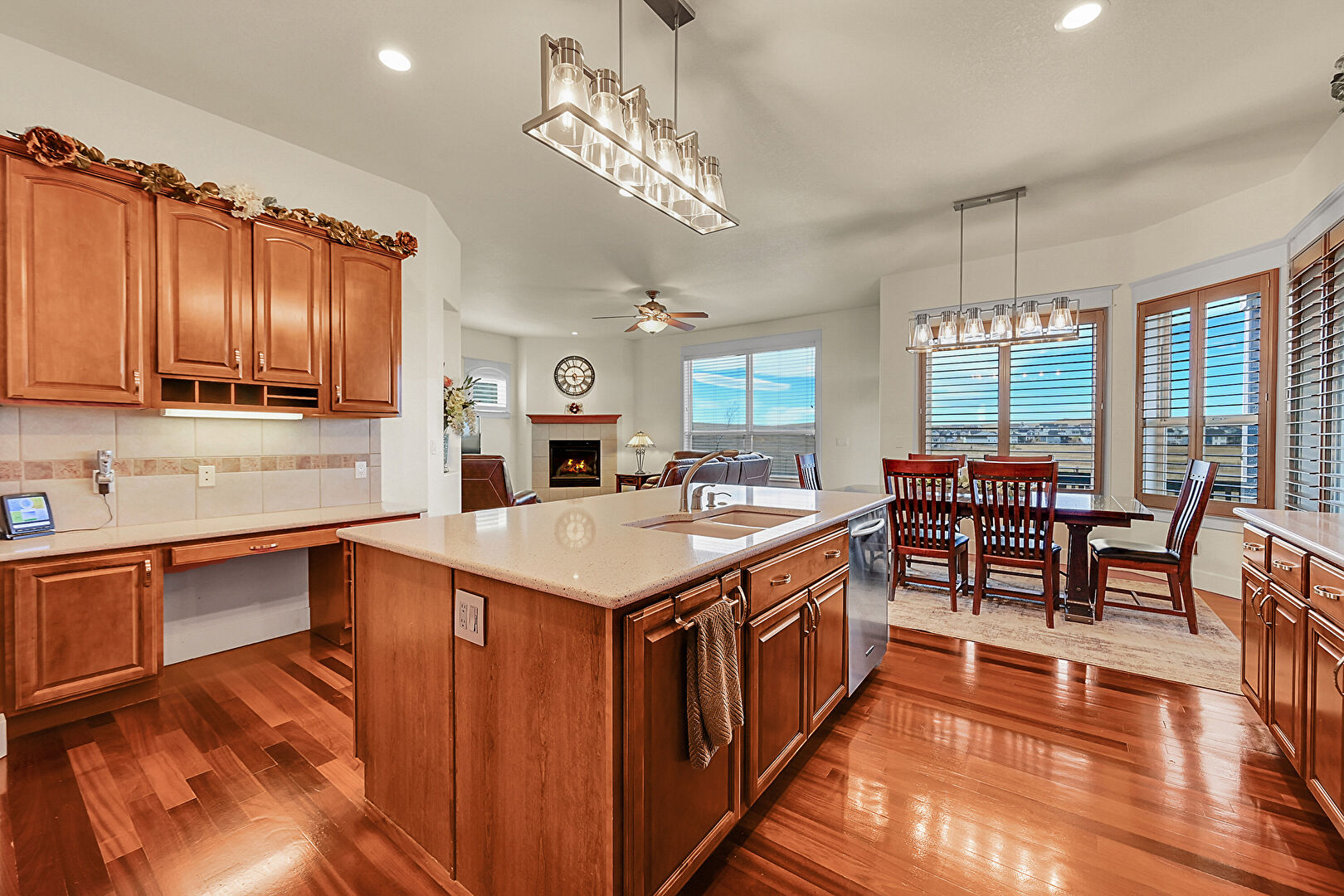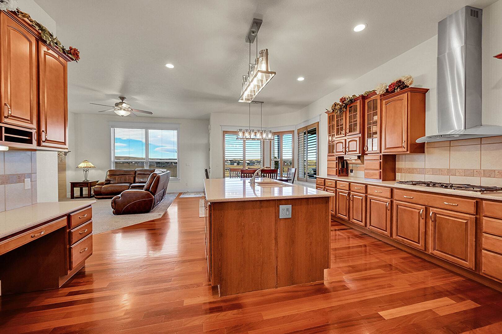 Arched Cabinets, Arched Walkways, Baseboards Wall, Built In Desk, Ceiling Fan, Crown Molding Cabinets, Dark Brown Cabinets, Double Oven, Drywall, Fireplace, Flat Panel Cabinets, Glass Insert Cabinets, Kitchen Bar, Kitchen Island, Kitchen Peninsula, L Shaped Kitchen, Medium Brown Cabinets, Natural Light, Notable Chandelier, Office Area, Open Shelves, Opens To Living Area, Pendant Lighting, Raised Cabinets, Recessed Lighting, Stone Countertops, Textured Ceiling, Tile Floor, U Shaped Kitchen, Warming Drawer, Wood Finish Floor, Crown Molding Cabinets, Dark Brown Cabinets, Fireplace, Glass Insert Cabinets, Kitchen Island, Natural Light, Pendant Lighting, Wood Finish Floor