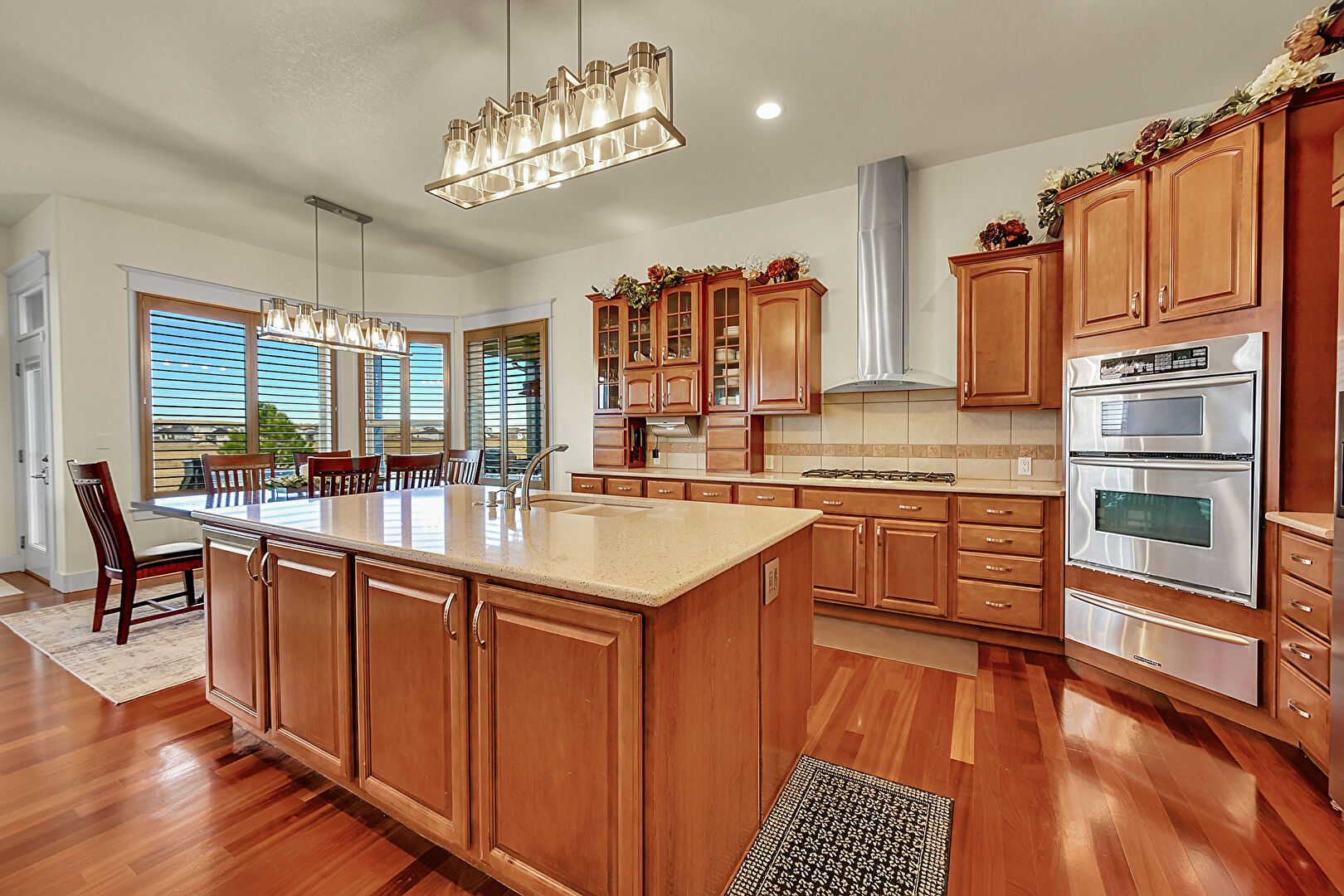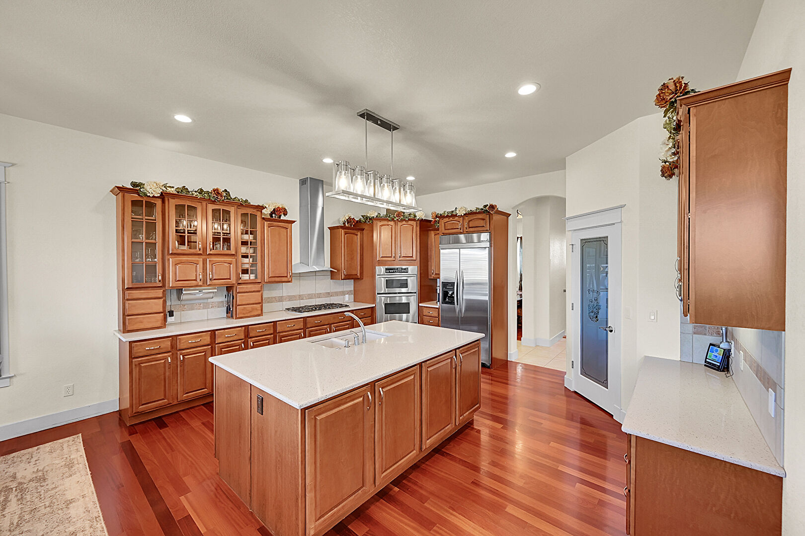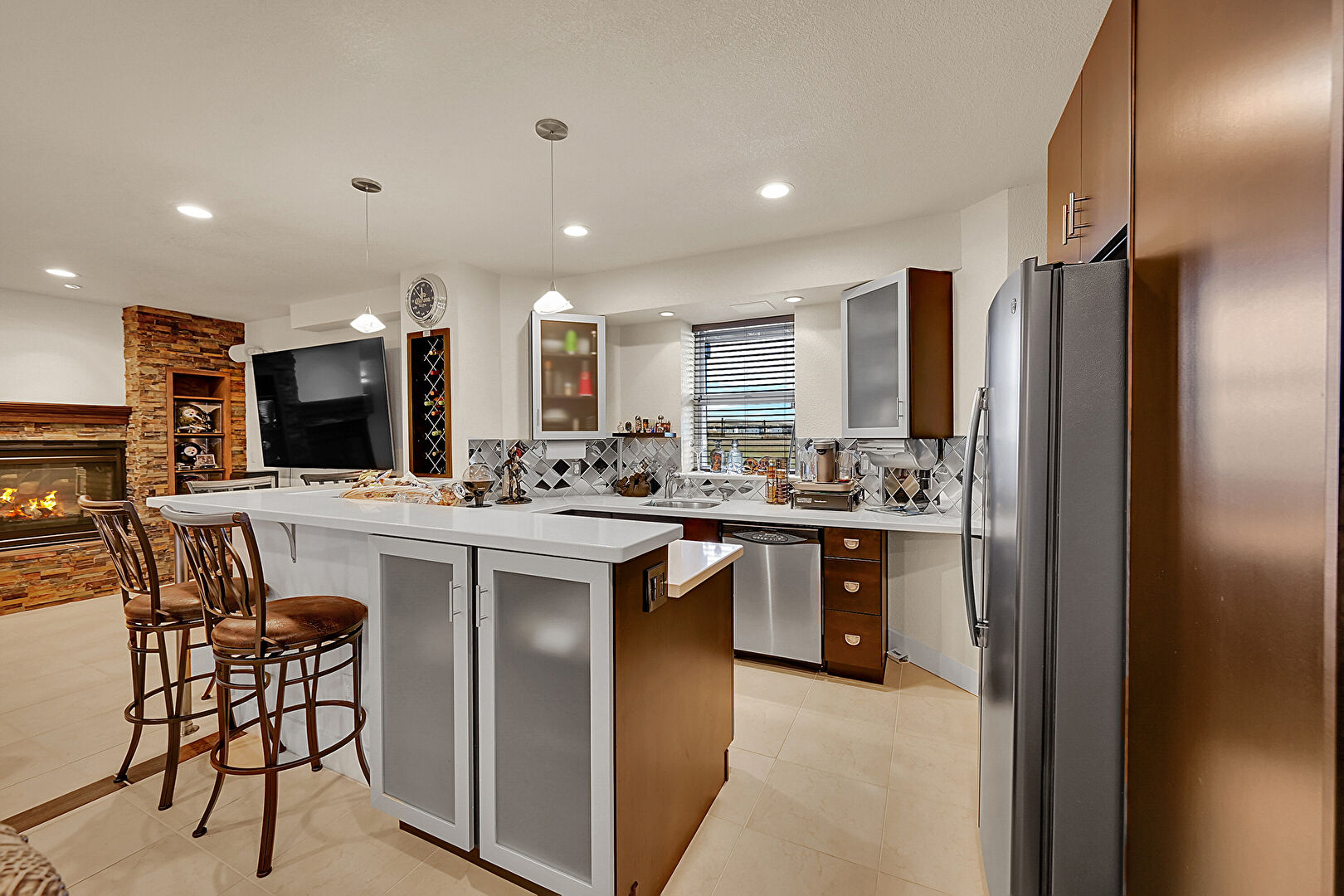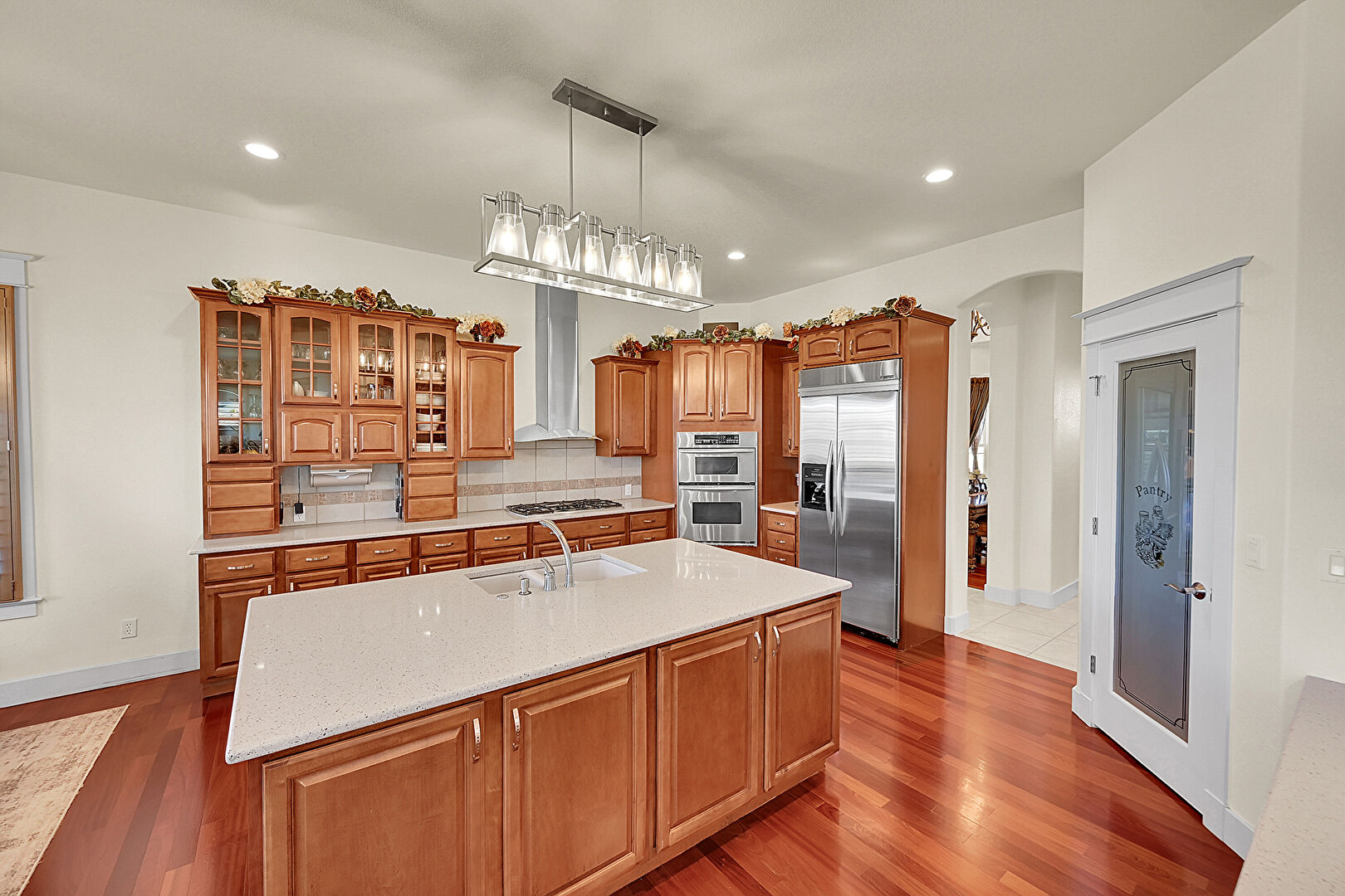 Arched Cabinets, Arched Walkways, Baseboards Wall, Built In Desk, Ceiling Fan, Crown Molding Cabinets, Dark Brown Cabinets, Double Oven, Drywall, Fireplace, Flat Panel Cabinets, Glass Insert Cabinets, Kitchen Bar, Kitchen Island, Kitchen Peninsula, L Shaped Kitchen, Medium Brown Cabinets, Natural Light, Notable Chandelier, Office Area, Open Shelves, Opens To Living Area, Pendant Lighting, Raised Cabinets, Recessed Lighting, Stone Countertops, Textured Ceiling, Tile Floor, U Shaped Kitchen, Warming Drawer, Wood Finish Floor, Crown Molding Cabinets, Dark Brown Cabinets, Fireplace, Glass Insert Cabinets, Kitchen Island, Natural Light, Pendant Lighting, Wood Finish Floor