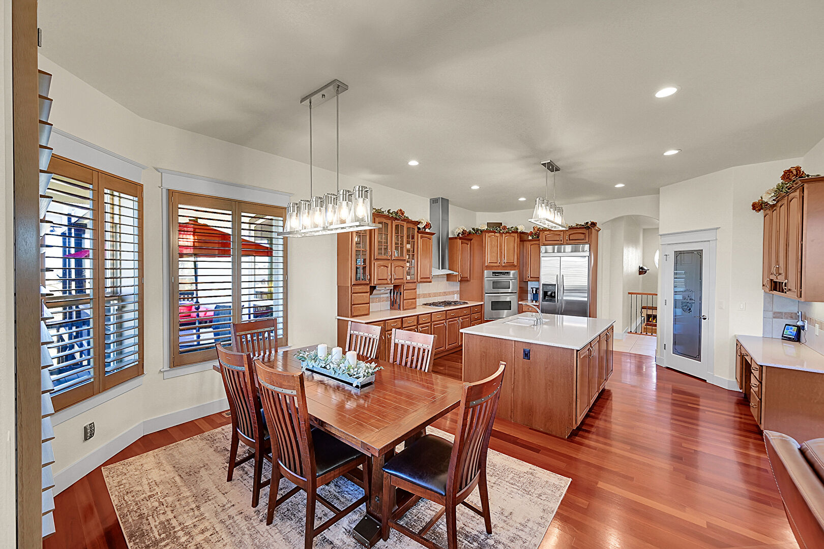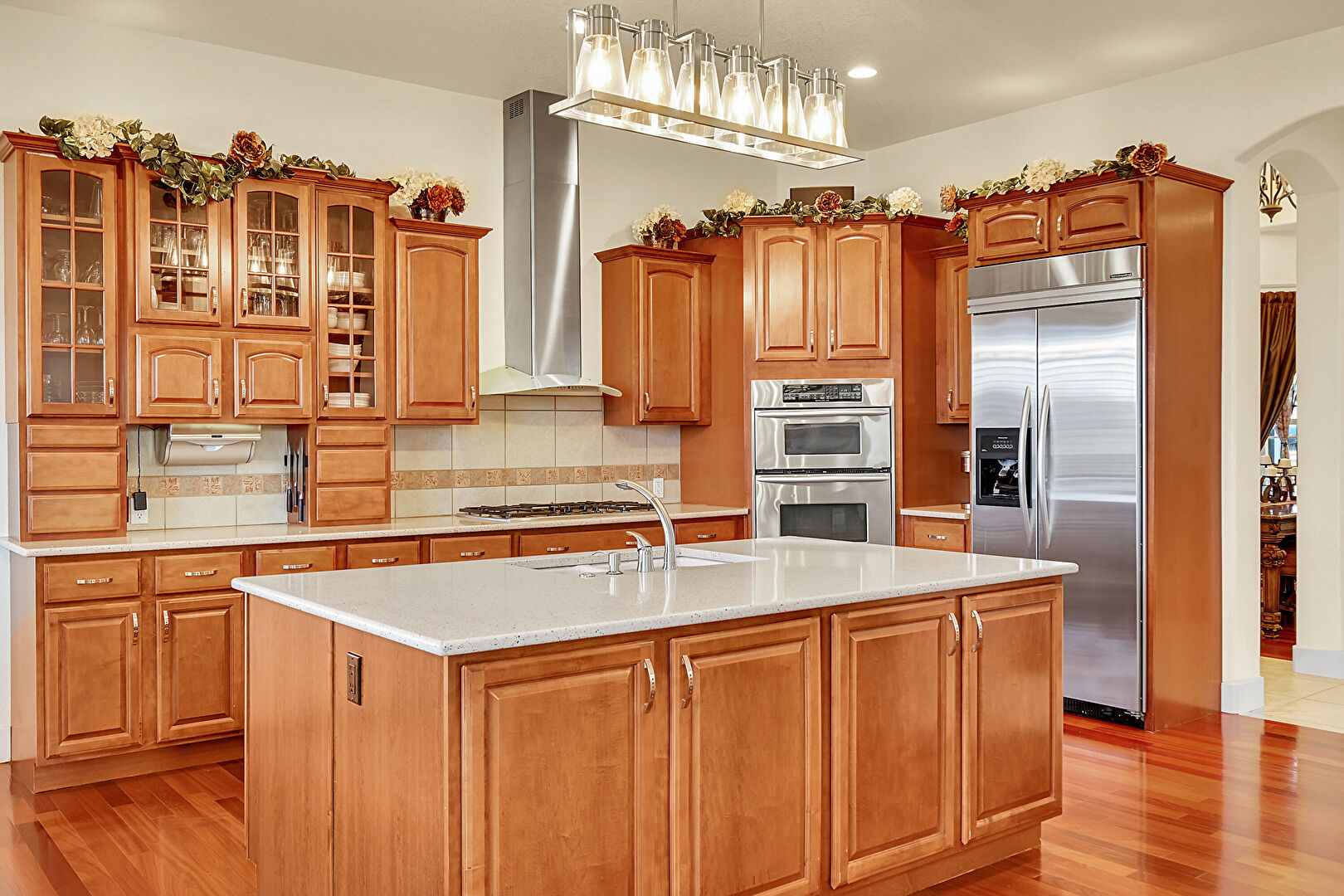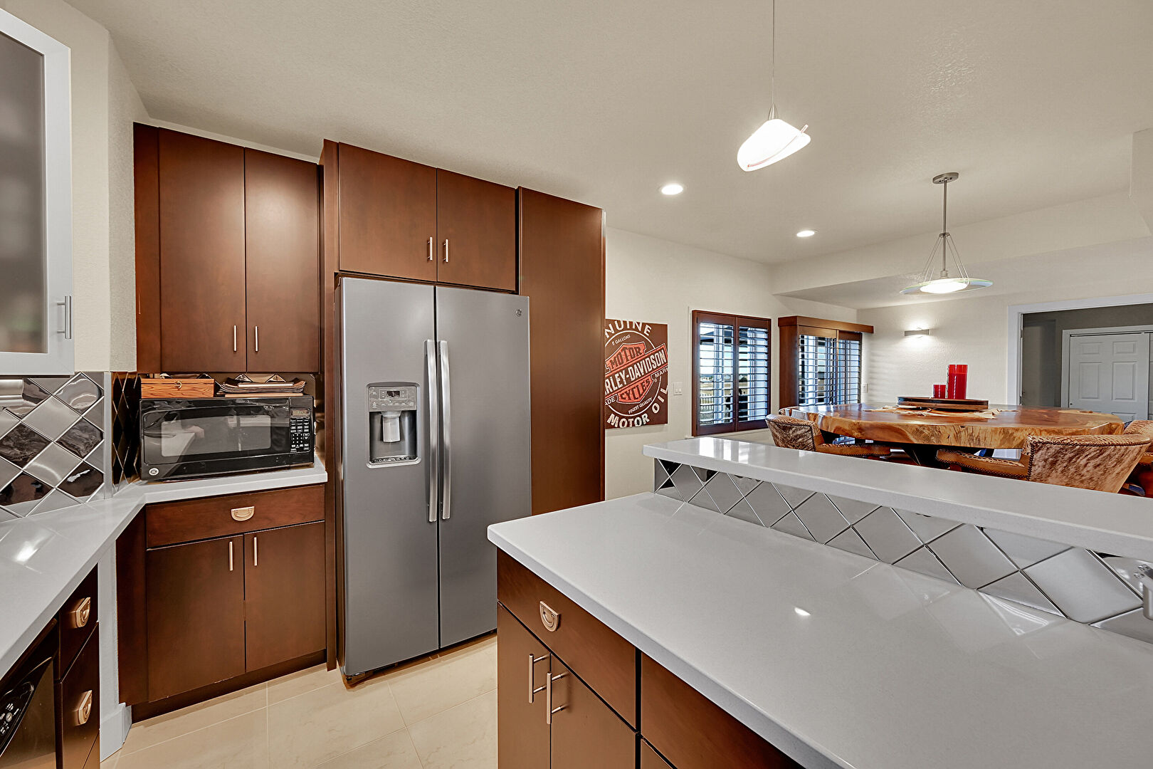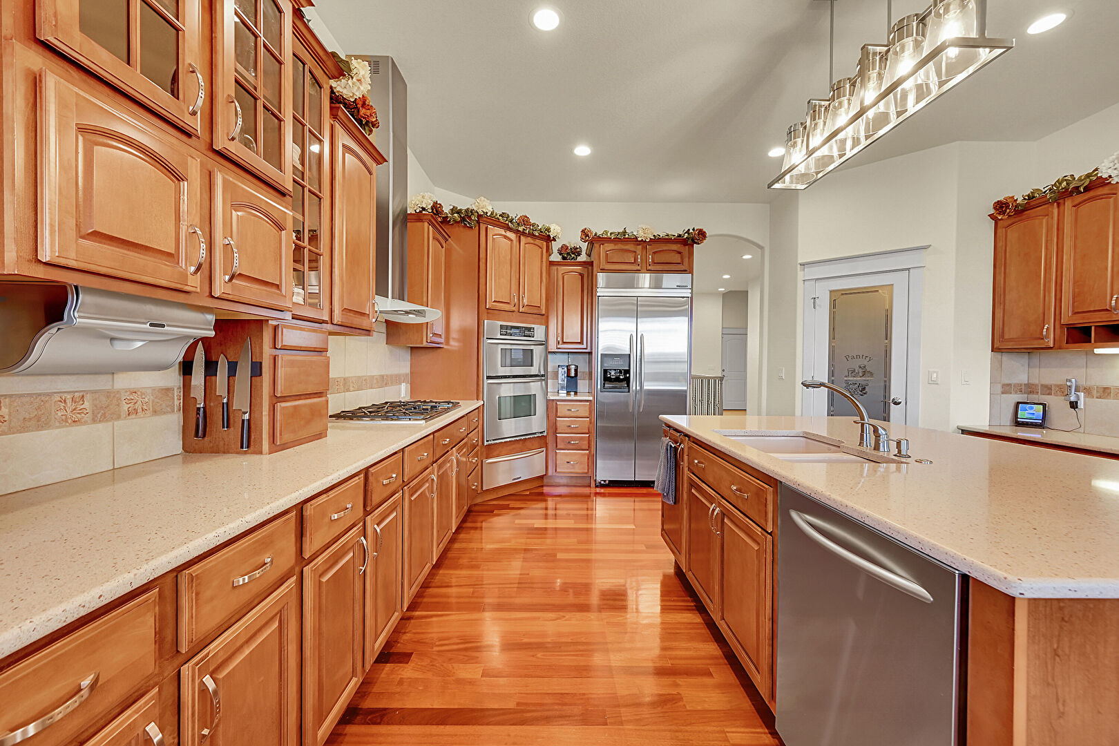 Arched Cabinets, Arched Walkways, Baseboards Wall, Built In Desk, Ceiling Fan, Crown Molding Cabinets, Dark Brown Cabinets, Double Oven, Drywall, Fireplace, Flat Panel Cabinets, Glass Insert Cabinets, Kitchen Bar, Kitchen Island, Kitchen Peninsula, L Shaped Kitchen, Medium Brown Cabinets, Natural Light, Notable Chandelier, Office Area, Open Shelves, Opens To Living Area, Pendant Lighting, Raised Cabinets, Recessed Lighting, Stone Countertops, Textured Ceiling, Tile Floor, U Shaped Kitchen, Warming Drawer, Wood Finish Floor, Crown Molding Cabinets, Dark Brown Cabinets, Fireplace, Glass Insert Cabinets, Kitchen Island, Natural Light, Pendant Lighting, Wood Finish Floor