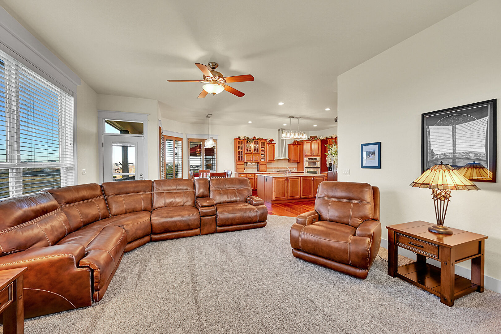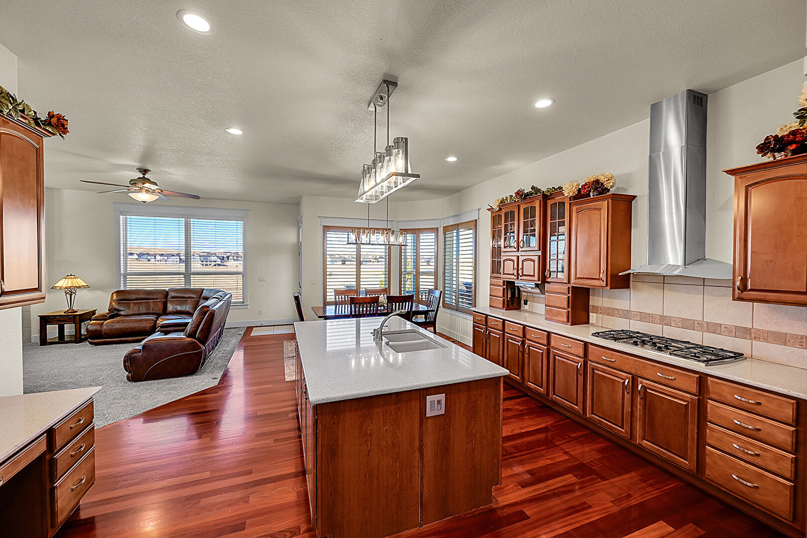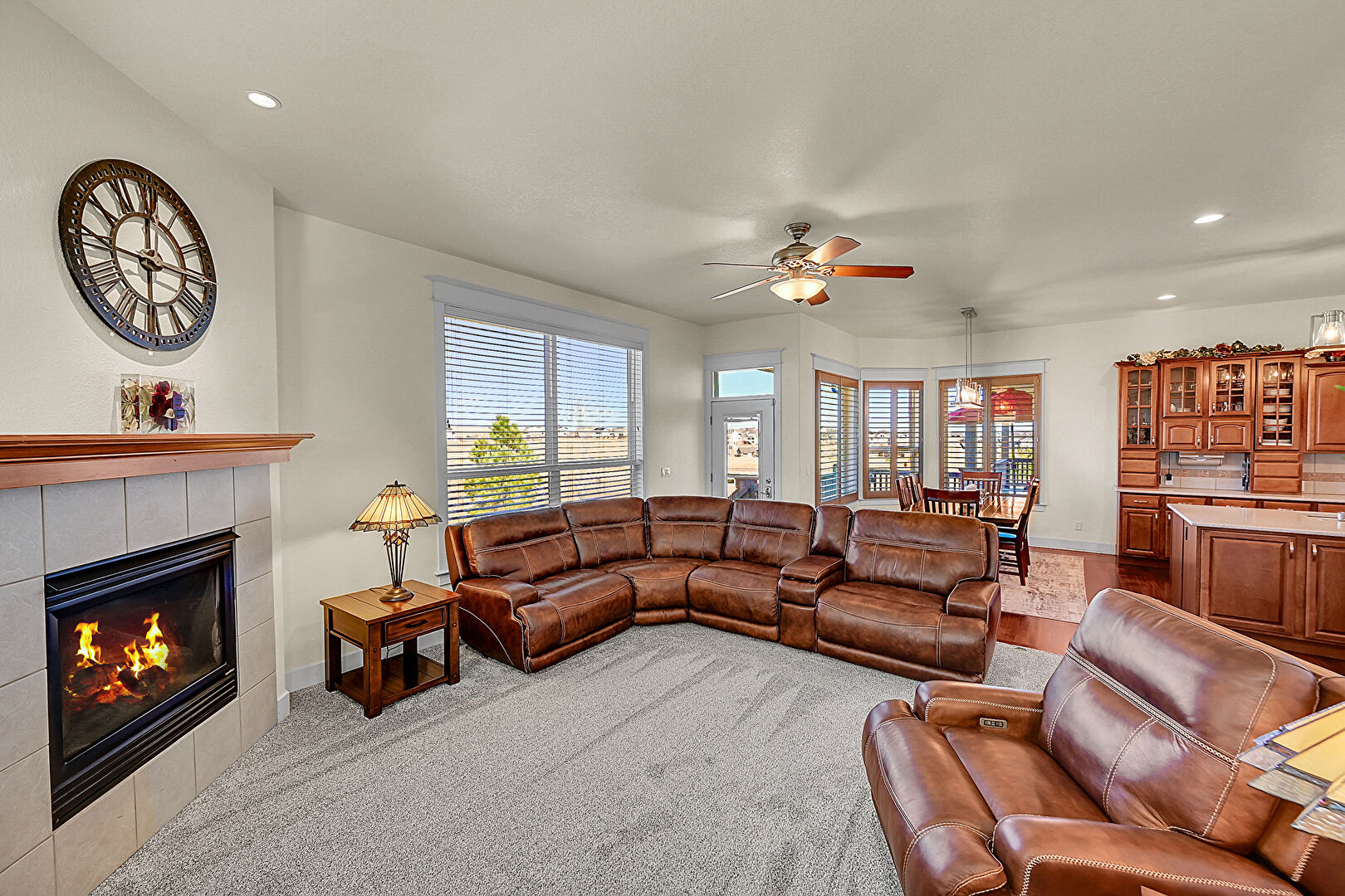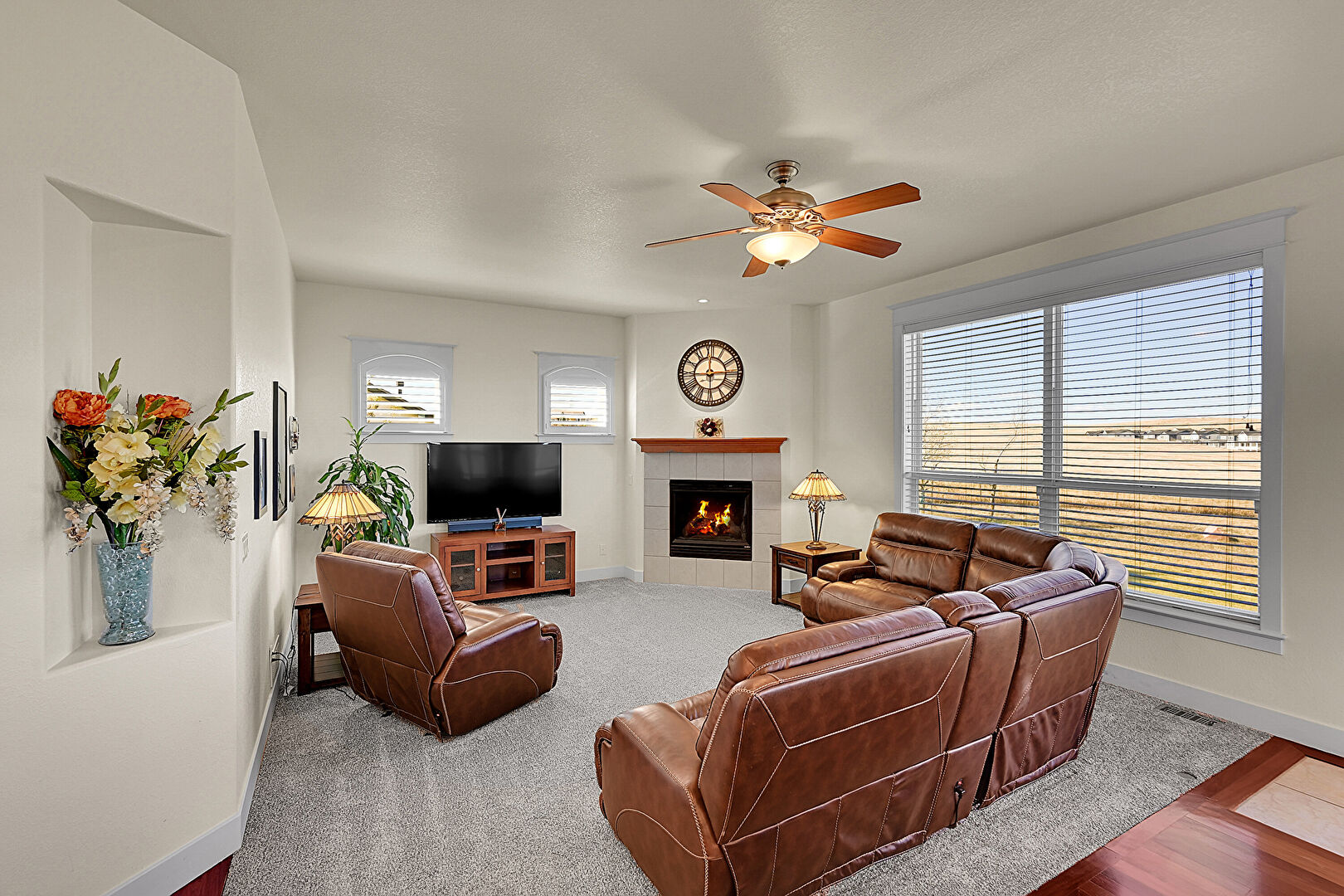 Baseboards Wall, Carpet, Ceiling Fan, Double Oven, Drywall, Fireplace, L Shaped Kitchen, Natural Light, Recessed Lighting, Vent, Ceiling Fan, Drywall, Fireplace