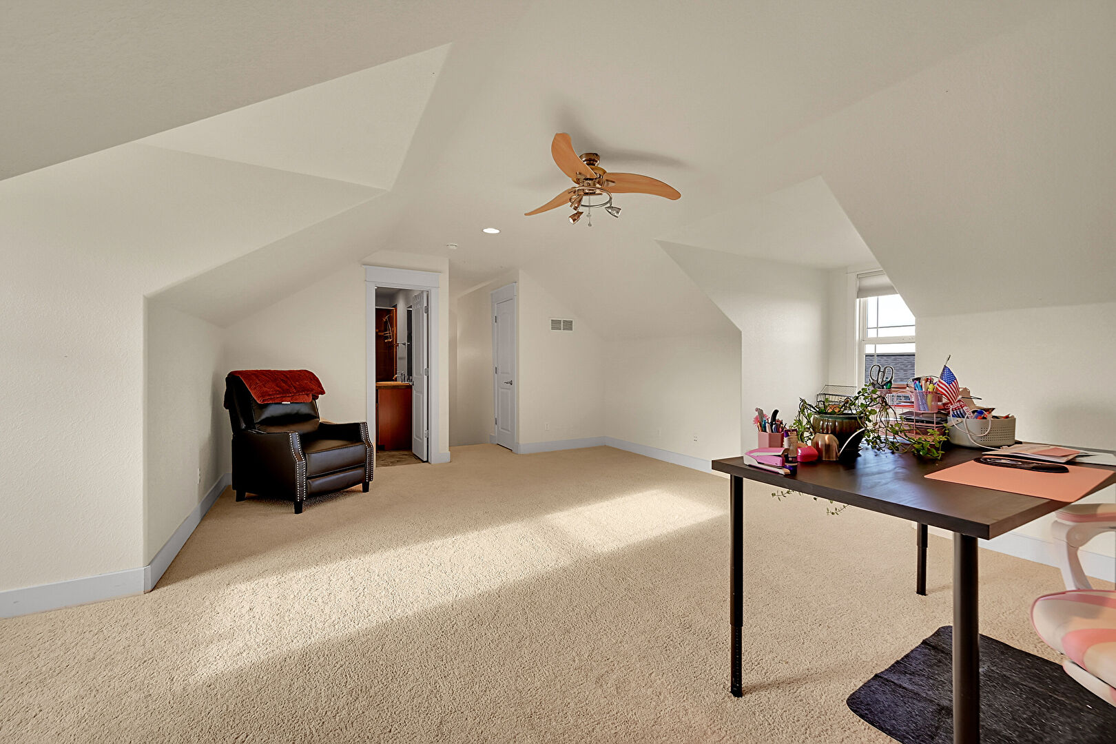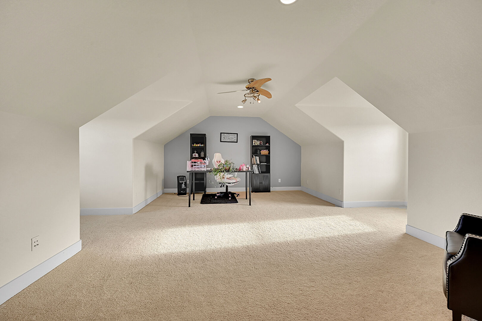 Baseboards Wall, Bonus Room, Carpet, Ceiling Fan, Drywall, Natural Light, Vaulted Ceiling, Vent, Baseboards Wall, Drywall