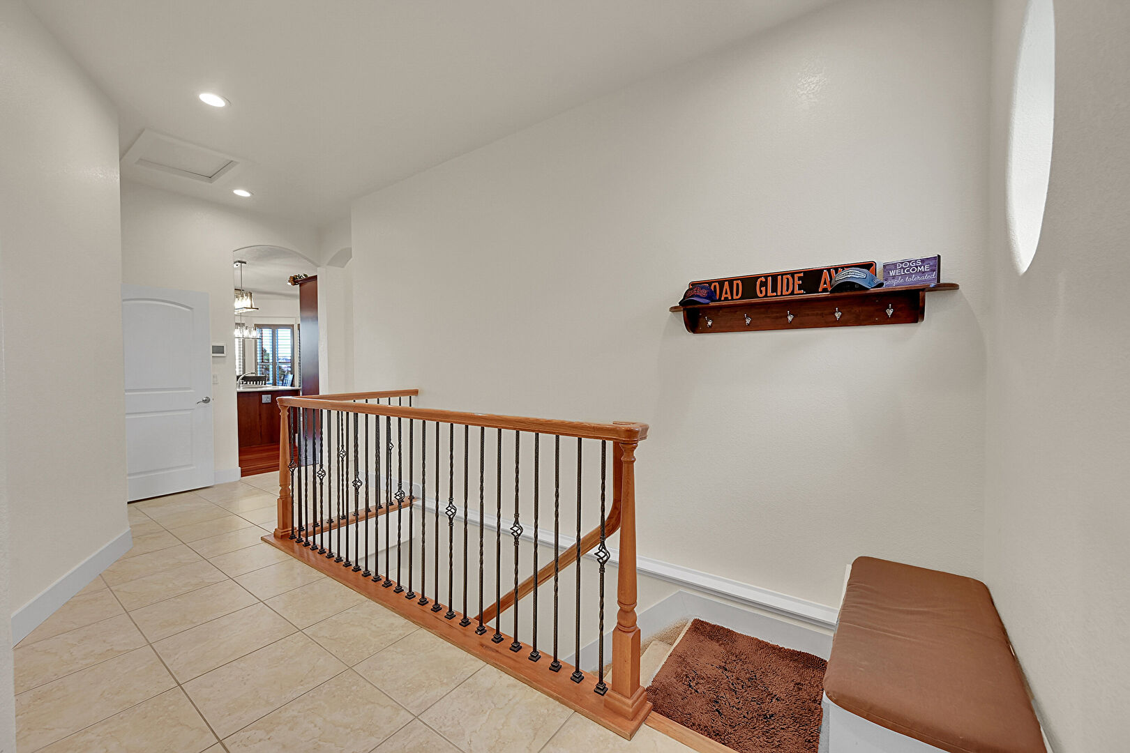 Arched Walkways, Baseboards Wall, Drywall, Natural Light, Recessed Lighting, Scuttle, Tile Floor, Upstairs Landing