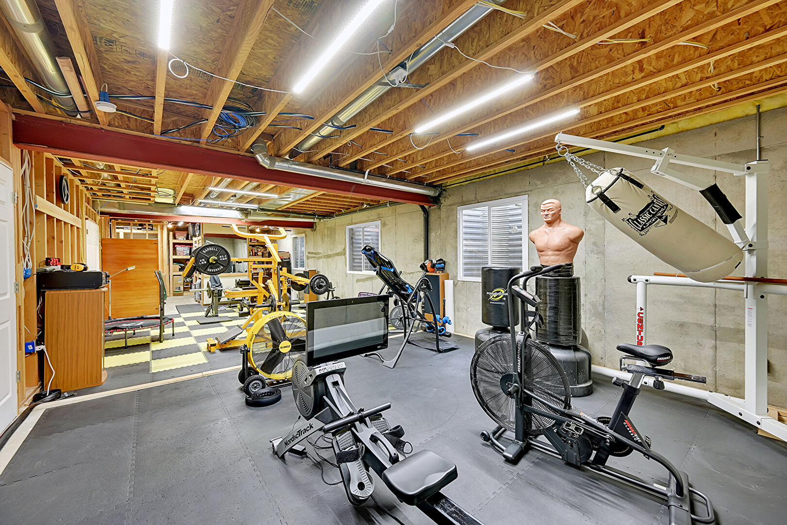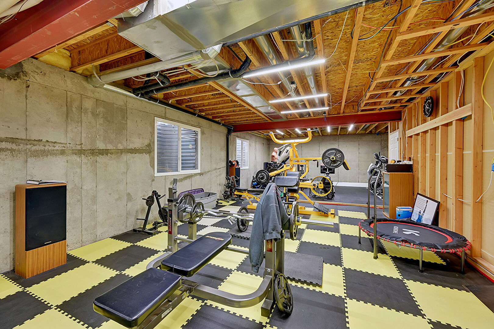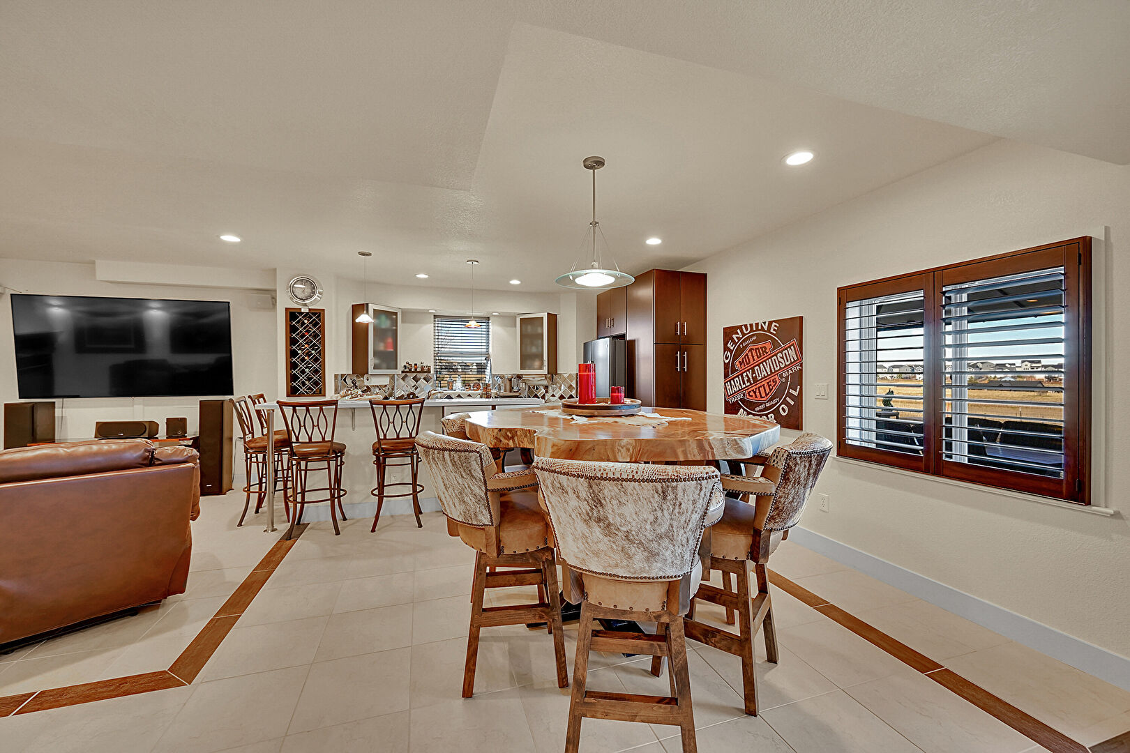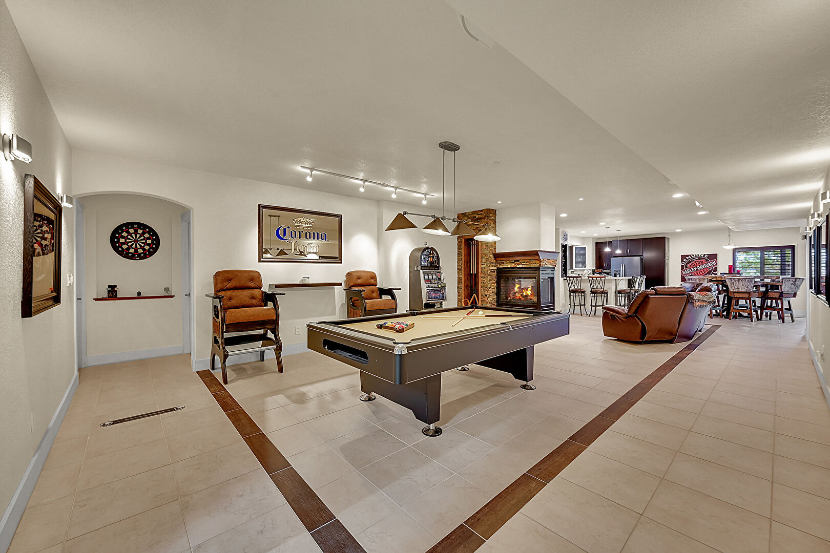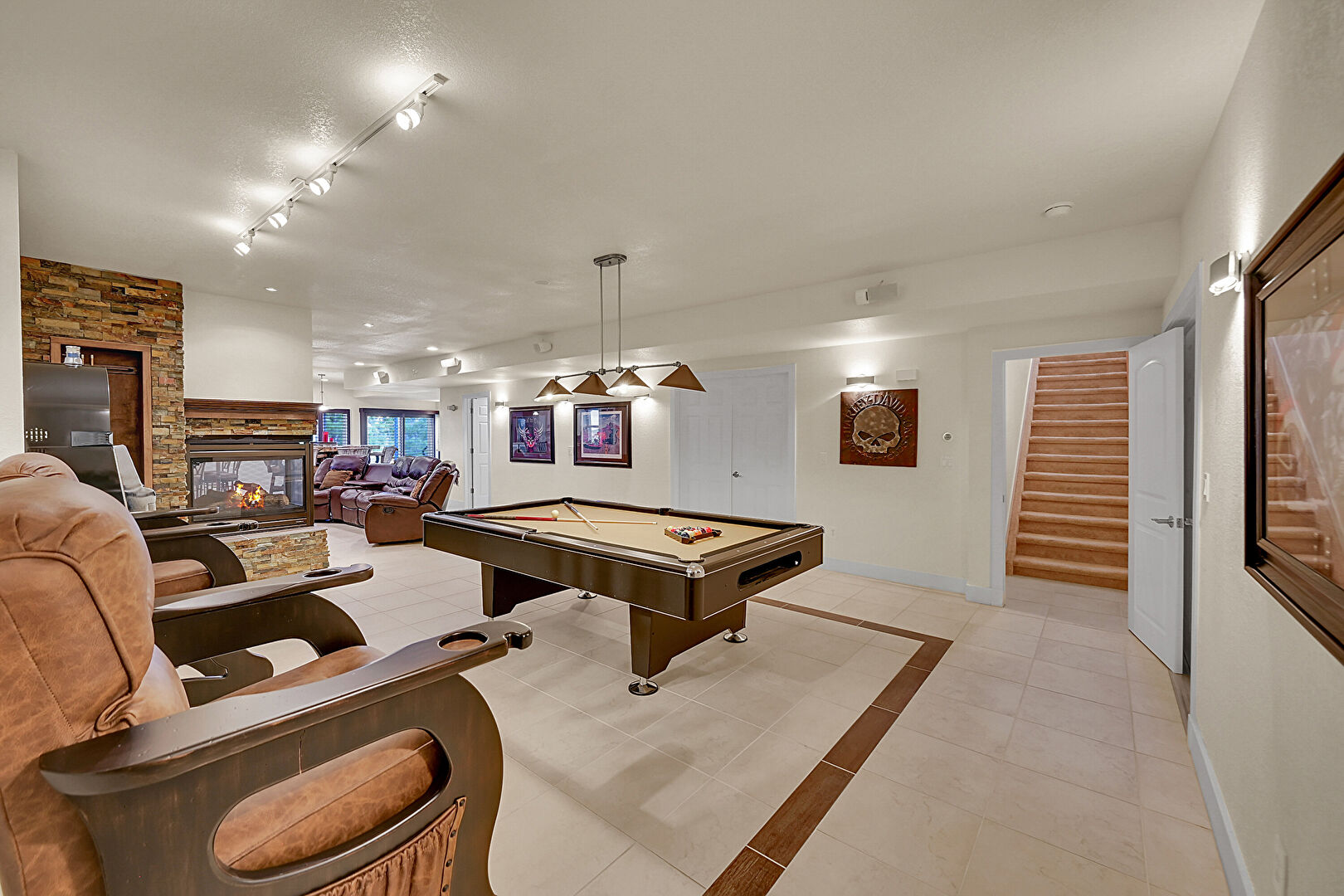 Baseboards Wall, Basement, Billiards, Drywall, Fireplace, Inlaid Floor, L Shaped Kitchen, Natural Light, Recessed Lighting, Stone Wall, Tile Floor, Track Lighting, Billiards, Drywall, Tile Floor