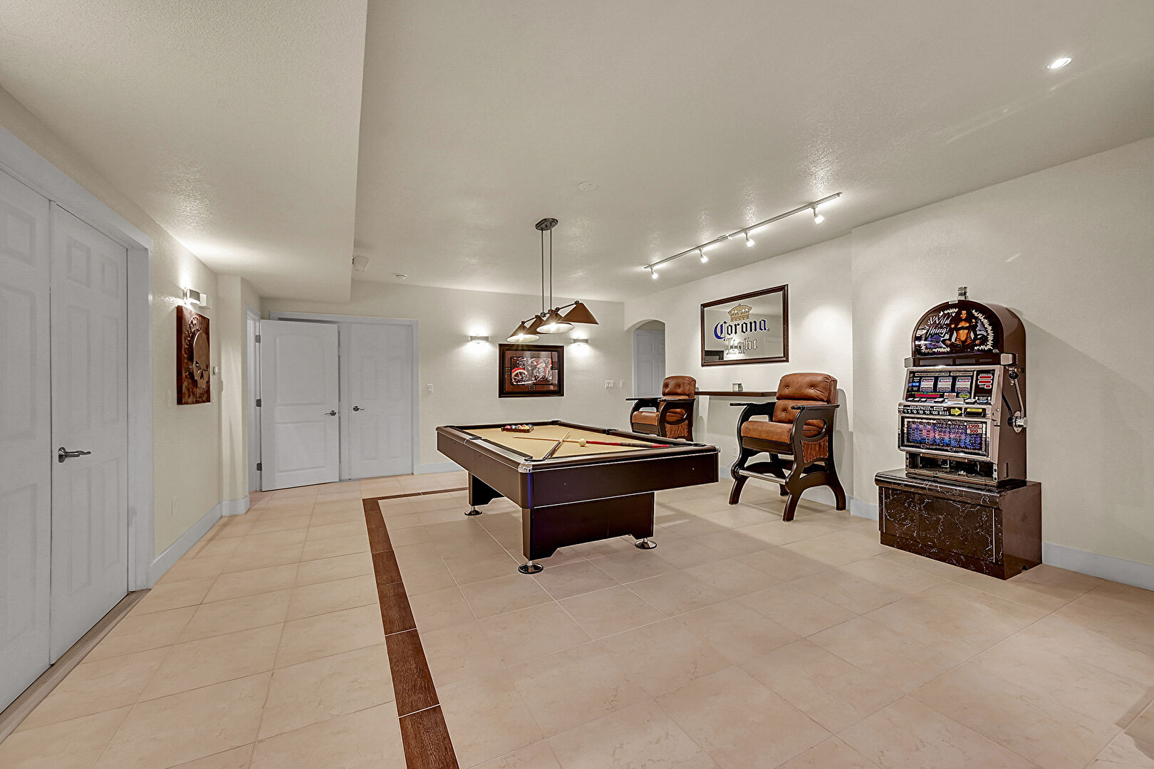 Arched Walkways, Baseboards Wall, Billiards, Drywall, Tile Floor, Track Lighting