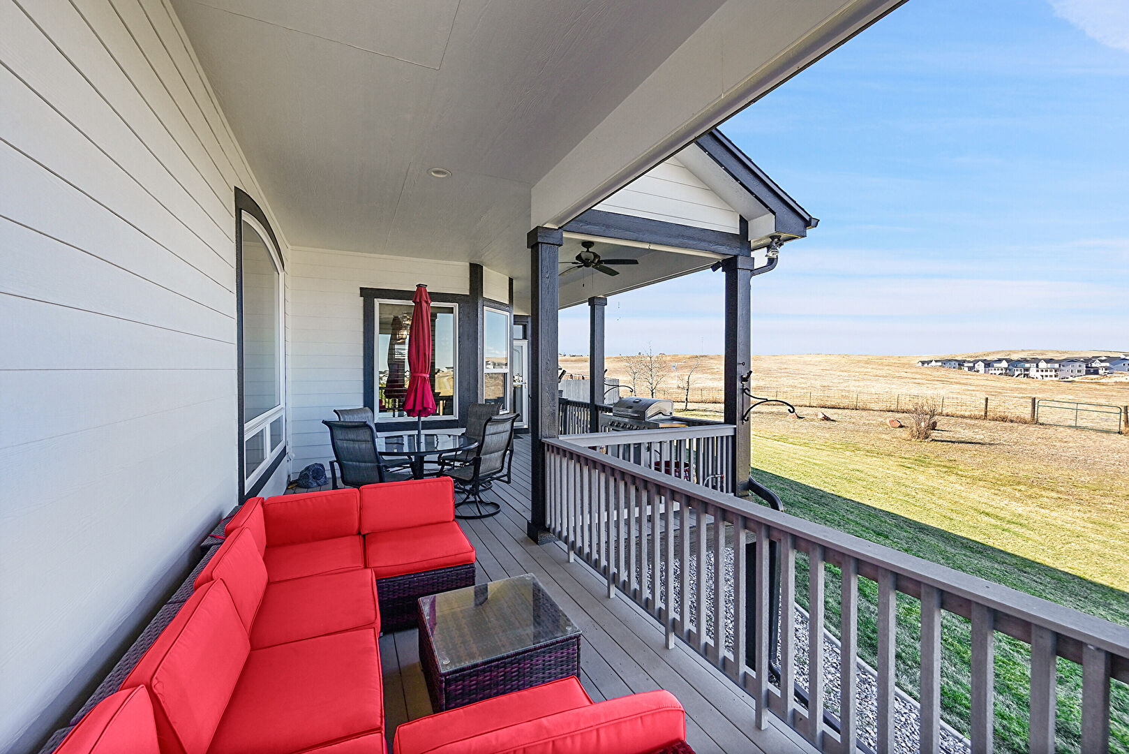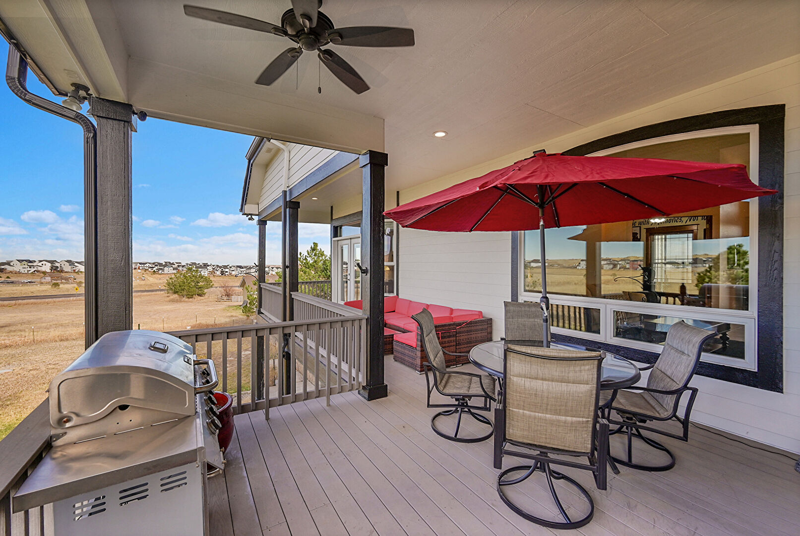 Ceiling Fan, Deck, Fence, Grill, Lawn, Outdoor Dining Area, Outdoor Living Space, Porch, Rural View, Ceiling Fan, Deck, Outdoor Dining Area