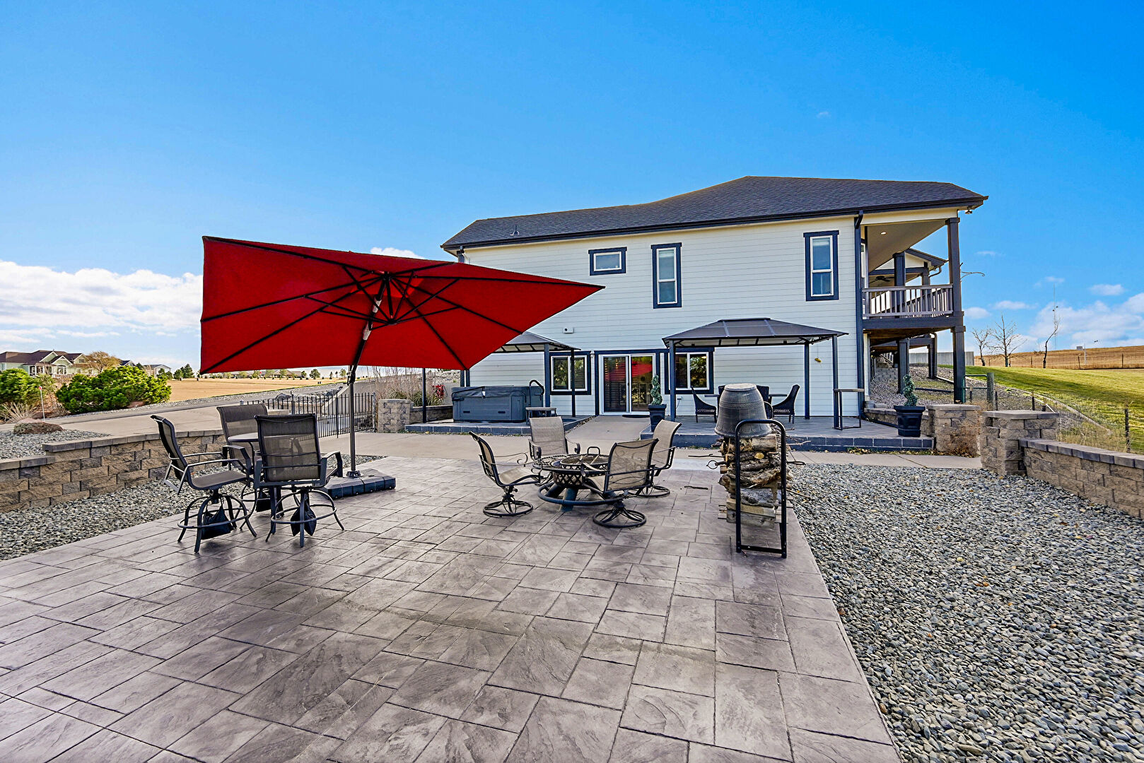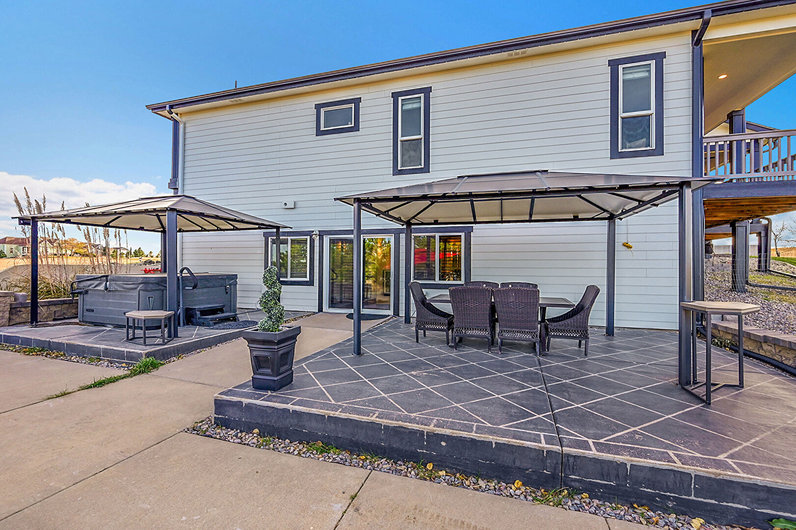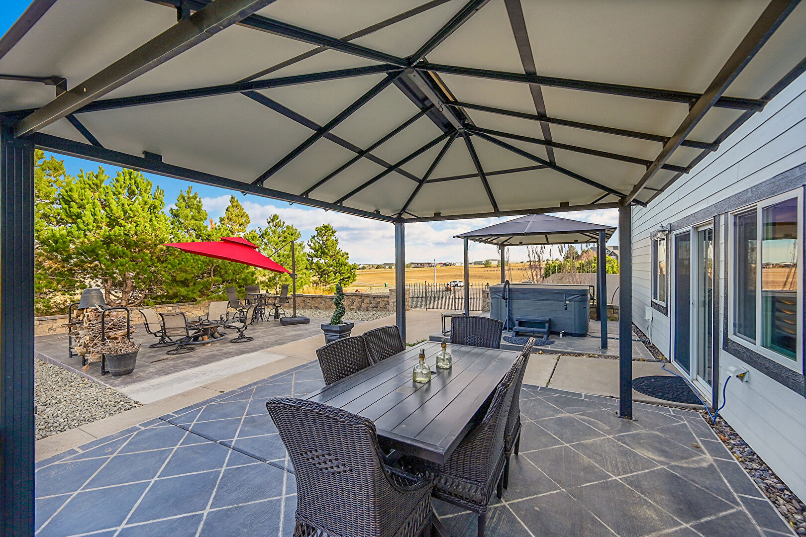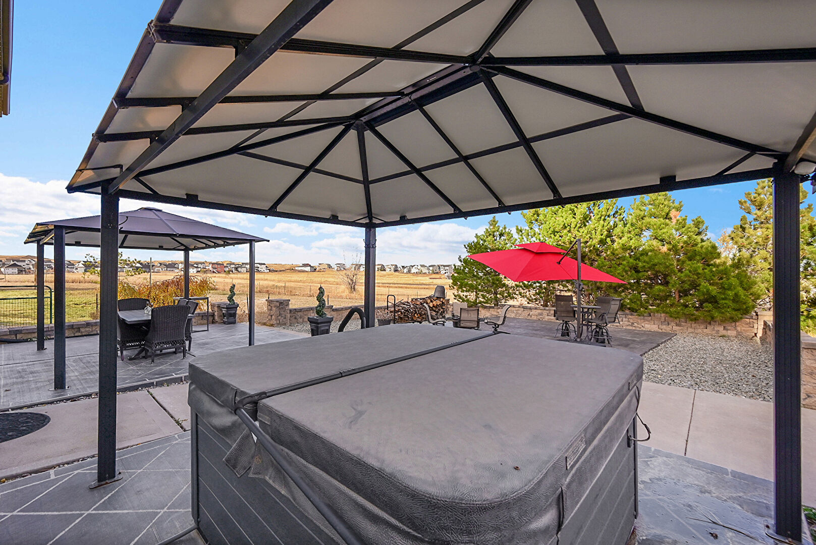Balcony, Fence, Fire Pit, Gate, Gazebo, Hot Tub, Outdoor Dining Area, Outdoor Kitchen, Patio, Residential View, Fence, Outdoor Dining Area, Patio