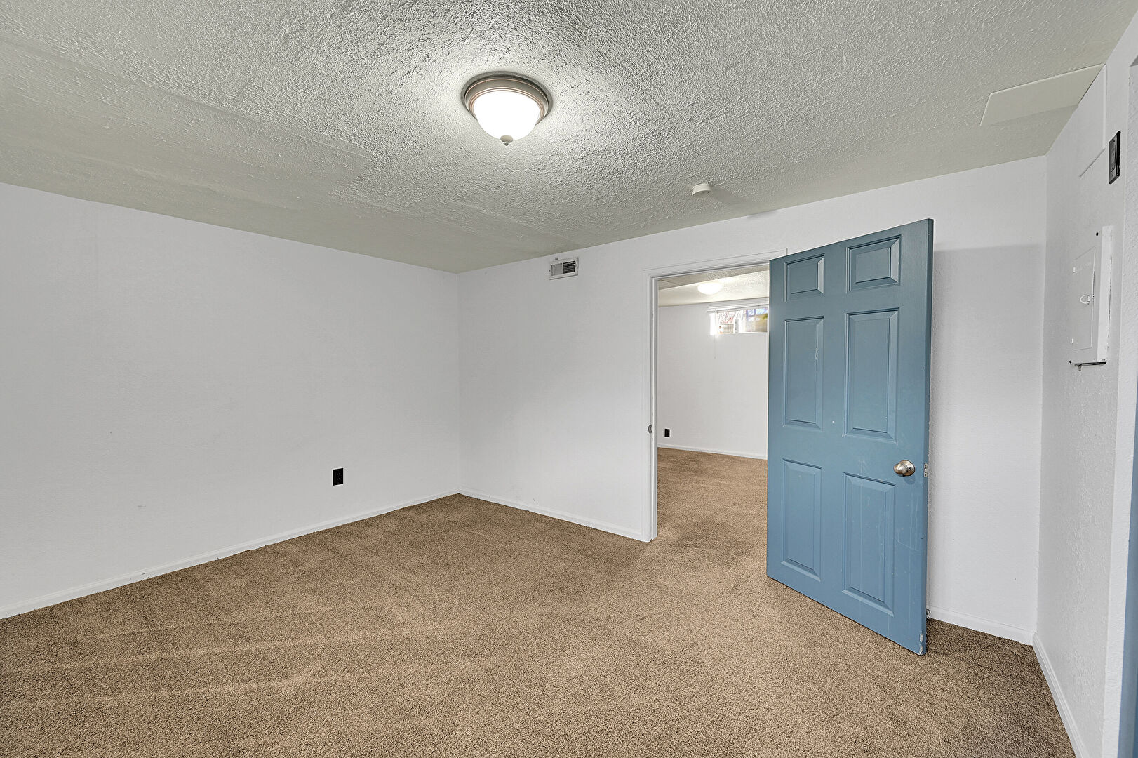 Baseboards Wall, Basement, Carpet, Drywall, Textured Ceiling, Vent, Carpet, Drywall