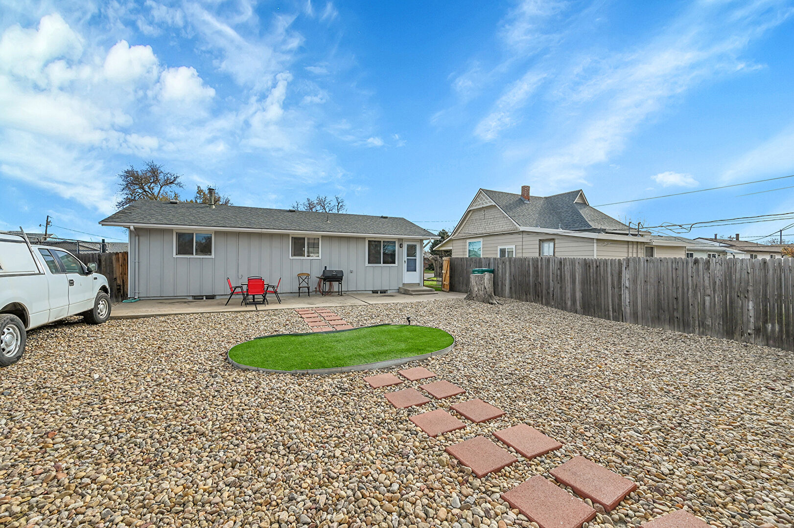 Board Batten Siding, Concrete Foundation, Downspout, Fence, Grill, Gutters, Patio, Shingle Roof, Vertical Siding, Grill, Gutters