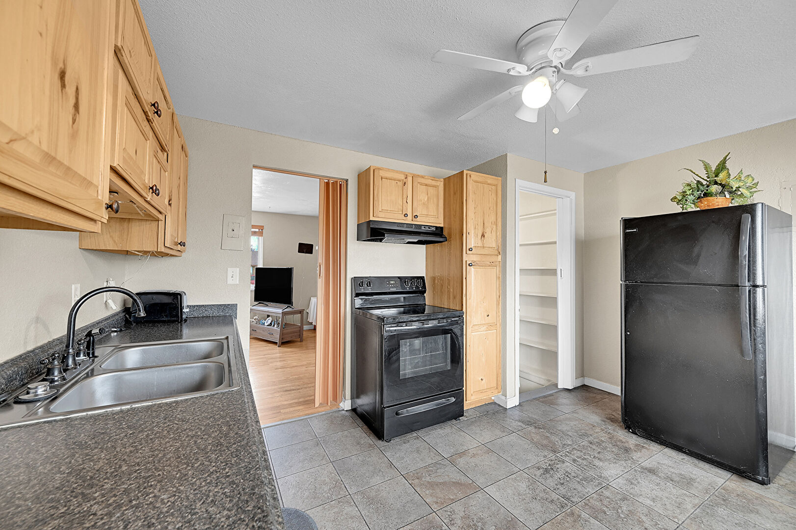Baseboards Wall, Ceiling Fan, Drywall, Natural Light, Raised Cabinets, Stone Countertops, Textured Ceiling, Tile Floor, Toaster, Vent, Baseboards Wall, Raised Cabinets, Textured Ceiling