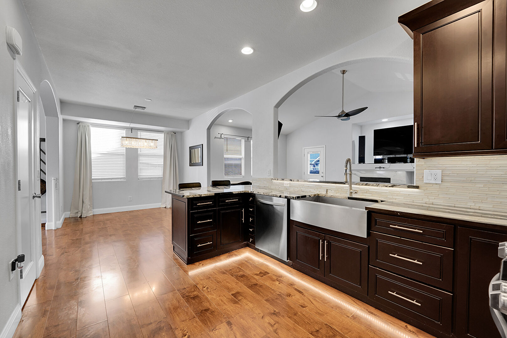 Arched Walkways, Baseboards Wall, Ceiling Fan, Crown Molding Cabinets, Dark Brown Cabinets, Drywall, Fireplace, G Shaped Kitchen, Glass Insert Cabinets, Kitchen Bar, Kitchen Peninsula, Natural Light, Opens To Living Area, Pass Through Window, Pendant Lighting, Raised Cabinets, Recessed Lighting, Shaker Cabinets, Stone Countertops, Vaulted Ceiling, Wood Finish Floor, Crown Molding Cabinets, Kitchen Peninsula, Natural Light, Stone Countertops, Tile Floor