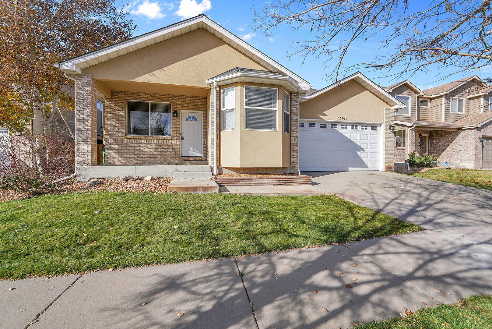 Brick Siding, Concrete Foundation, Downspout, Driveway, Gutters, Horizontal Siding, Lawn, Porch, Stoop, Stucco Siding, Brick Siding, Downspout, Gutters