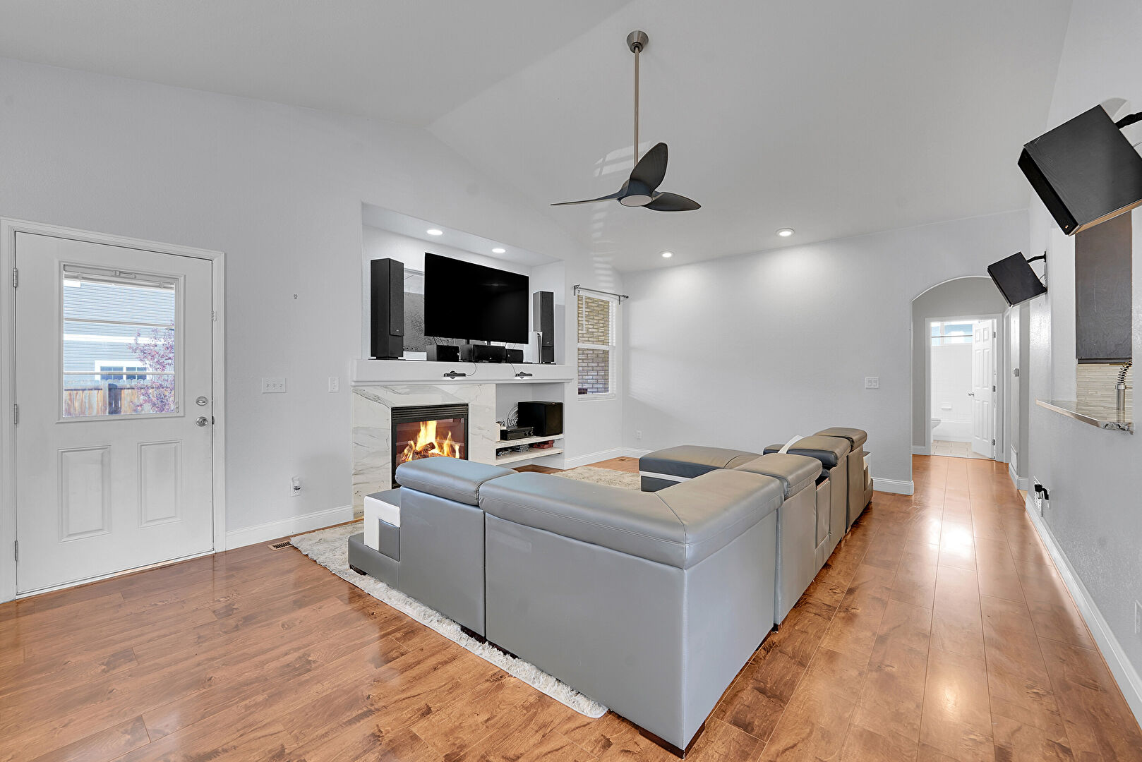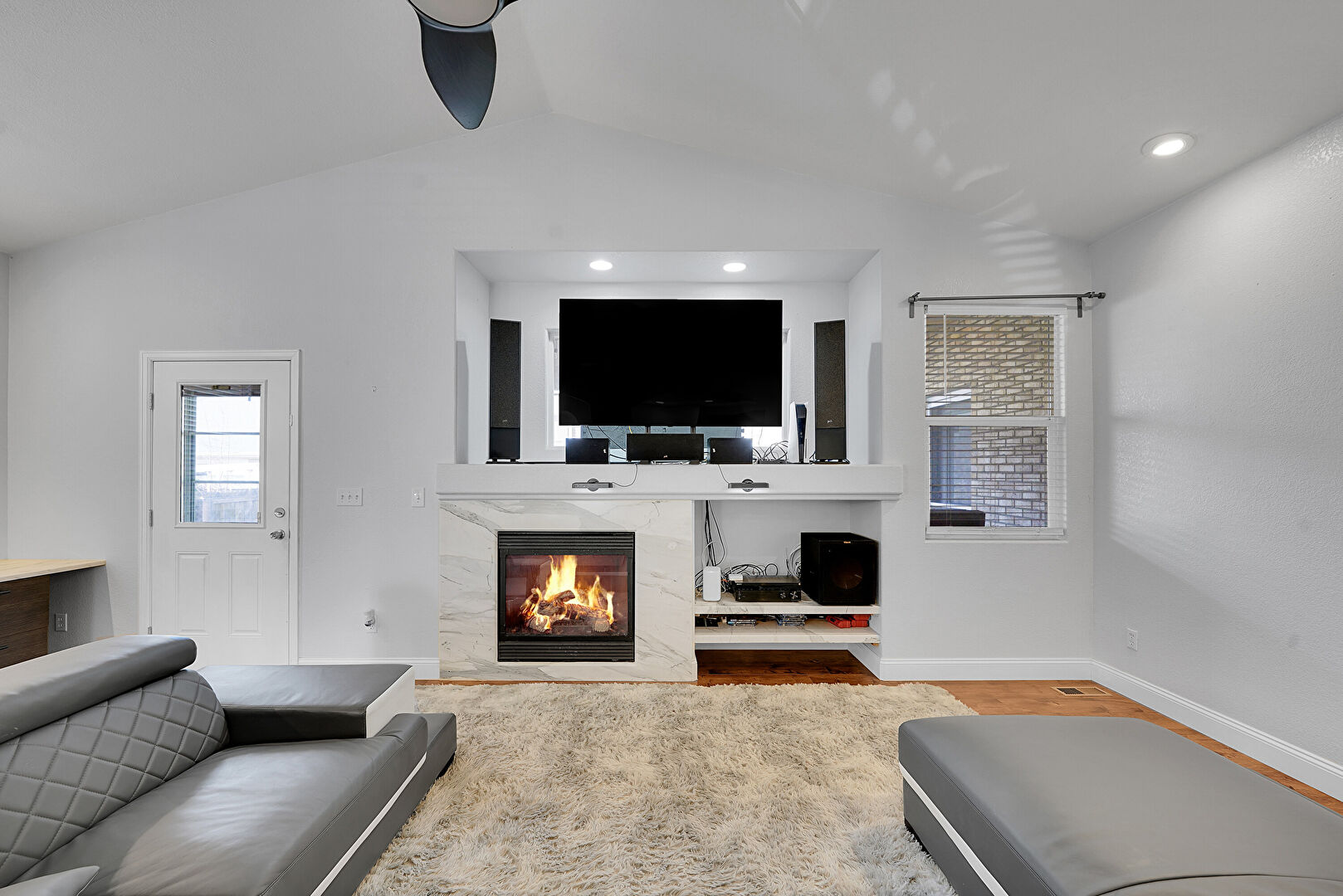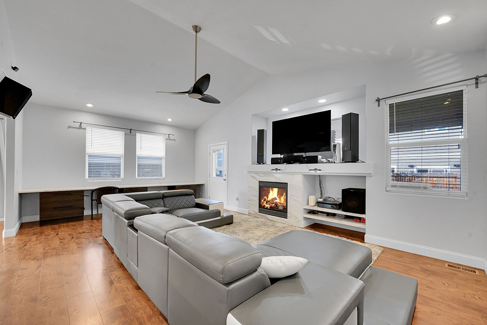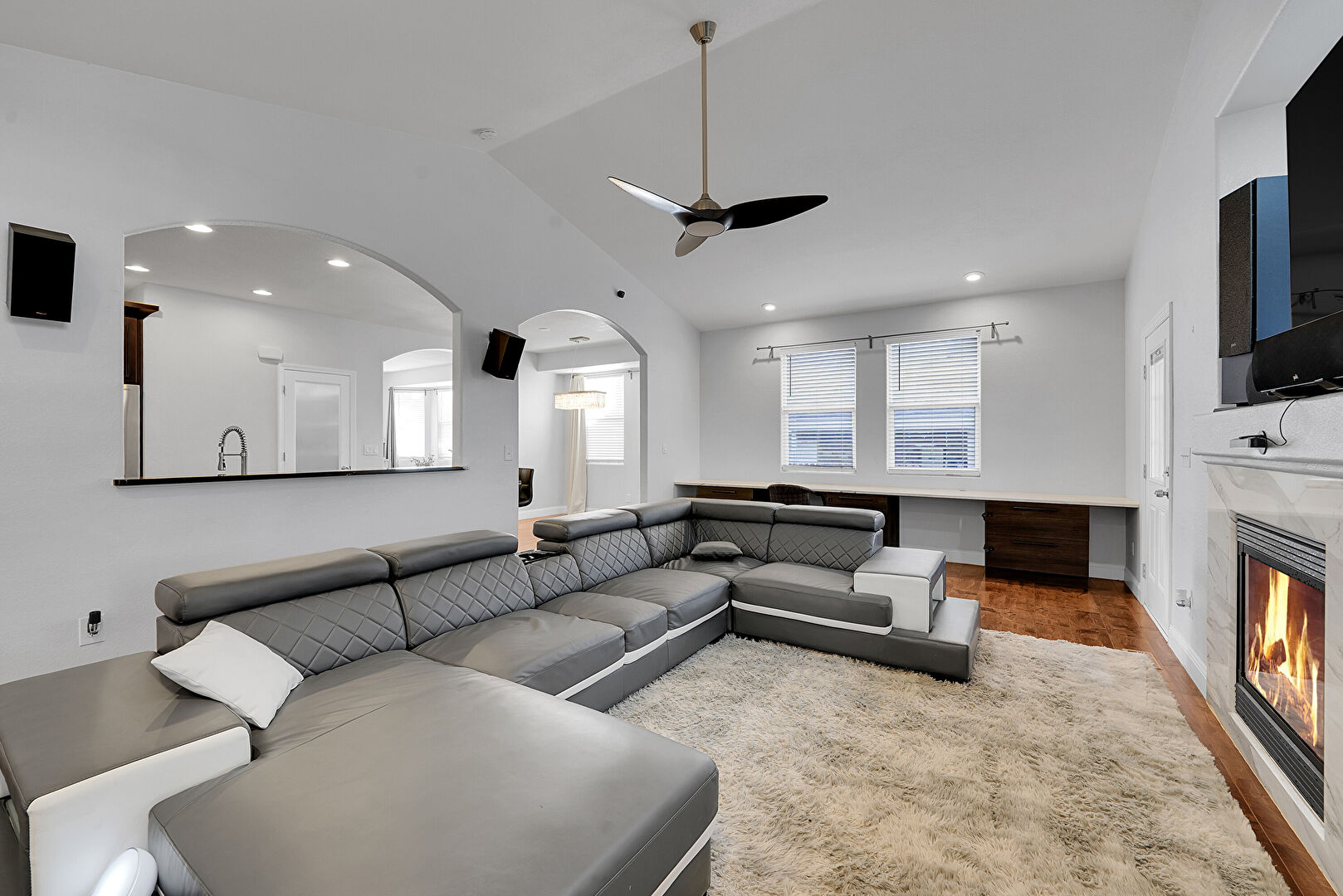 Arched Walkways, Baseboards Wall, Built In Desk, Cathedral Ceiling, Ceiling Fan, Drywall, Fireplace, Natural Light, Office Area, Recessed Lighting, Vaulted Ceiling, Vent, Wood Finish Floor, Arched Walkways, Drywall, Fireplace, Natural Light, Vaulted Ceiling, Wood Finish Floor