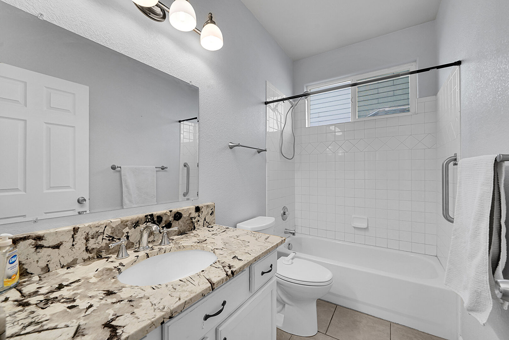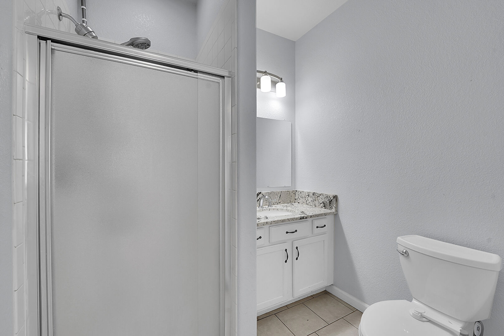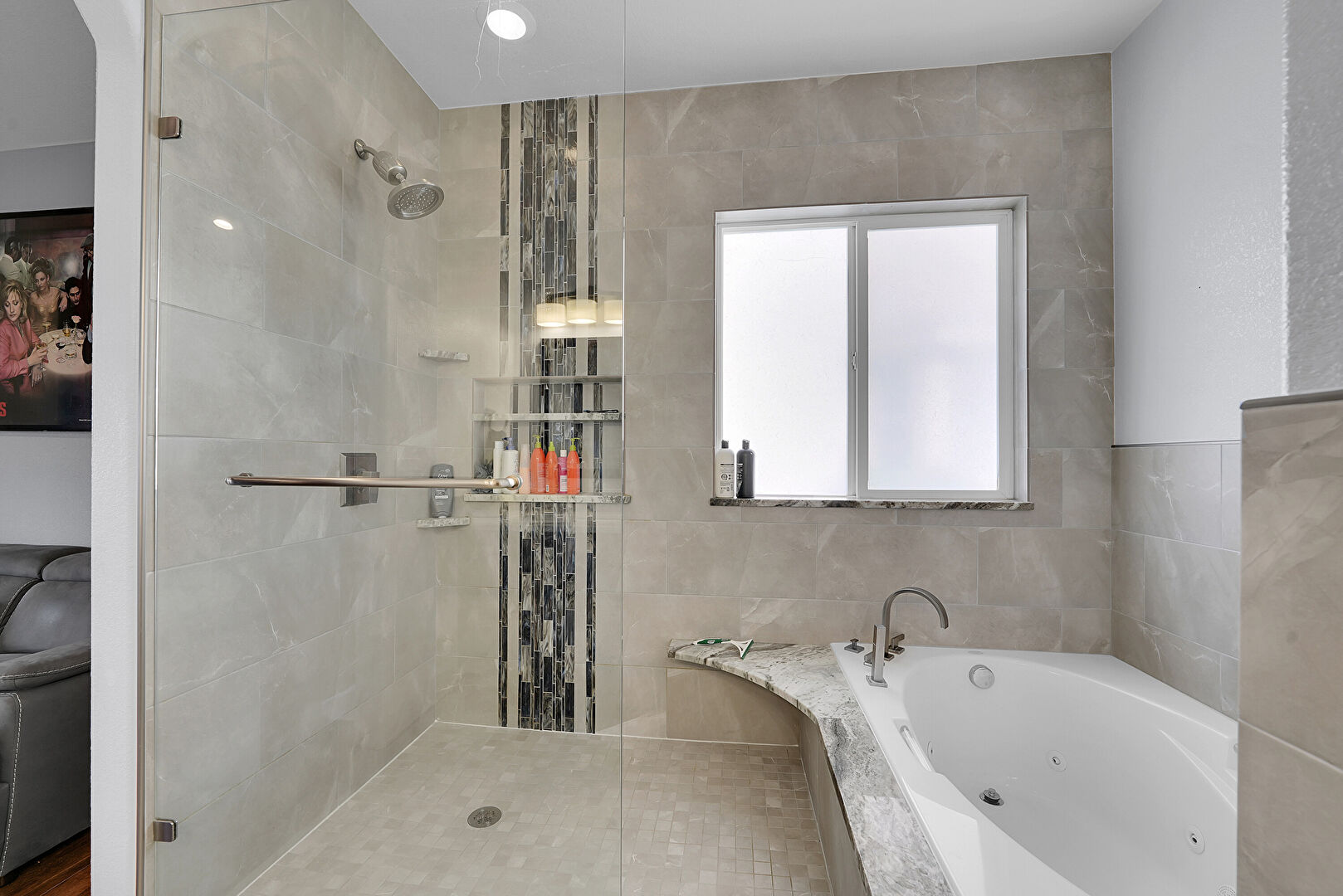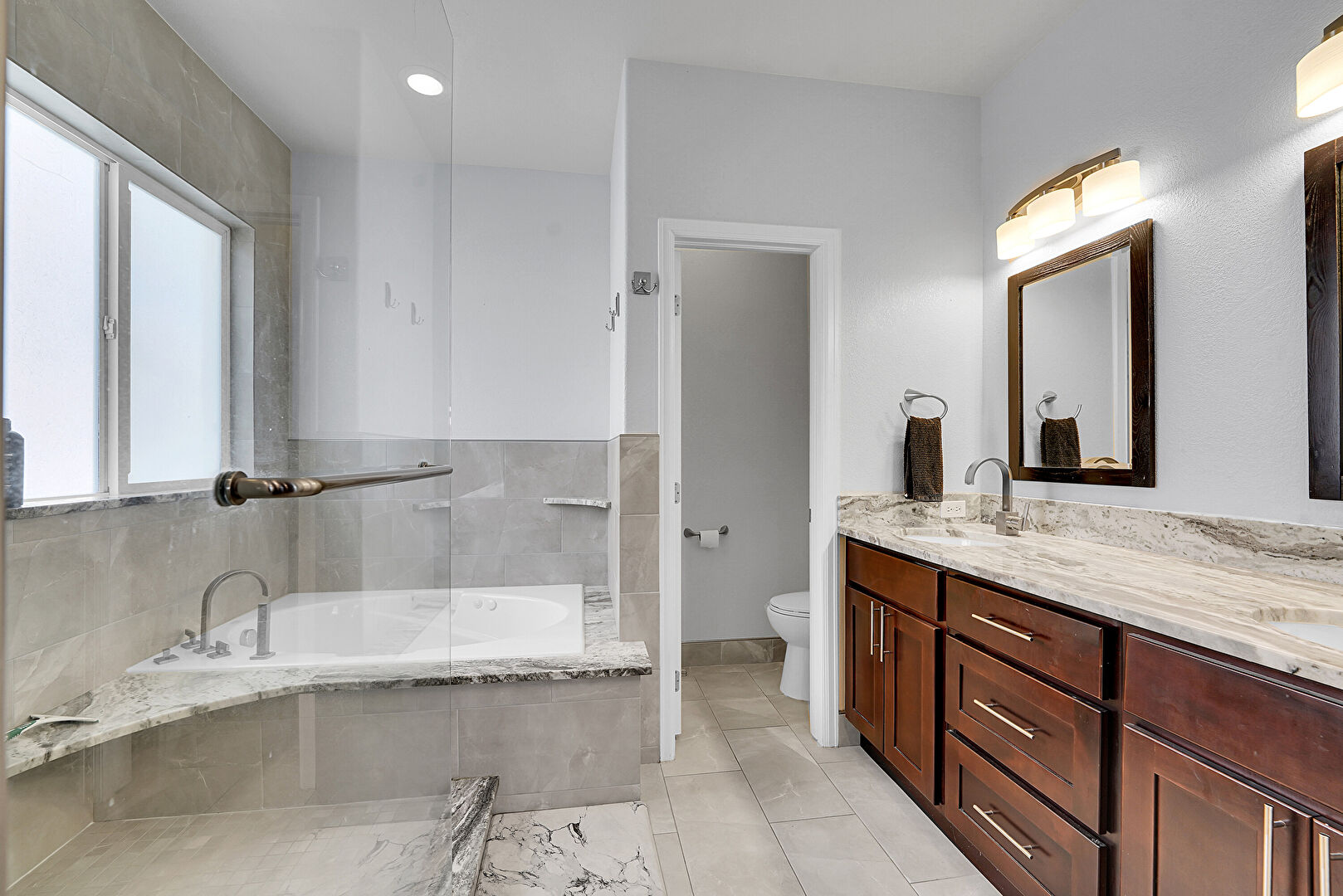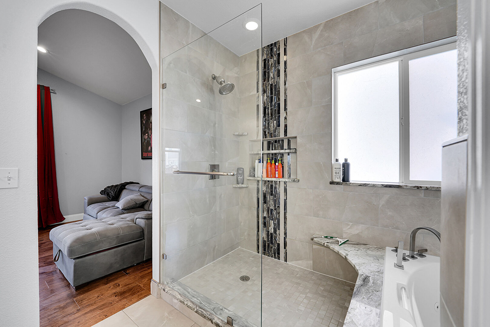 Baseboards Wall, Combined Bath Shower, Double Vanity, Drywall, Ensuite Bathroom, Full Bathroom, Natural Light, Recessed Lighting, Tile Floor, Tile Wall, Vanity, Water Closet, Wood Finish Floor, Drywall, Full Bathroom, Natural Light, Textured Wall