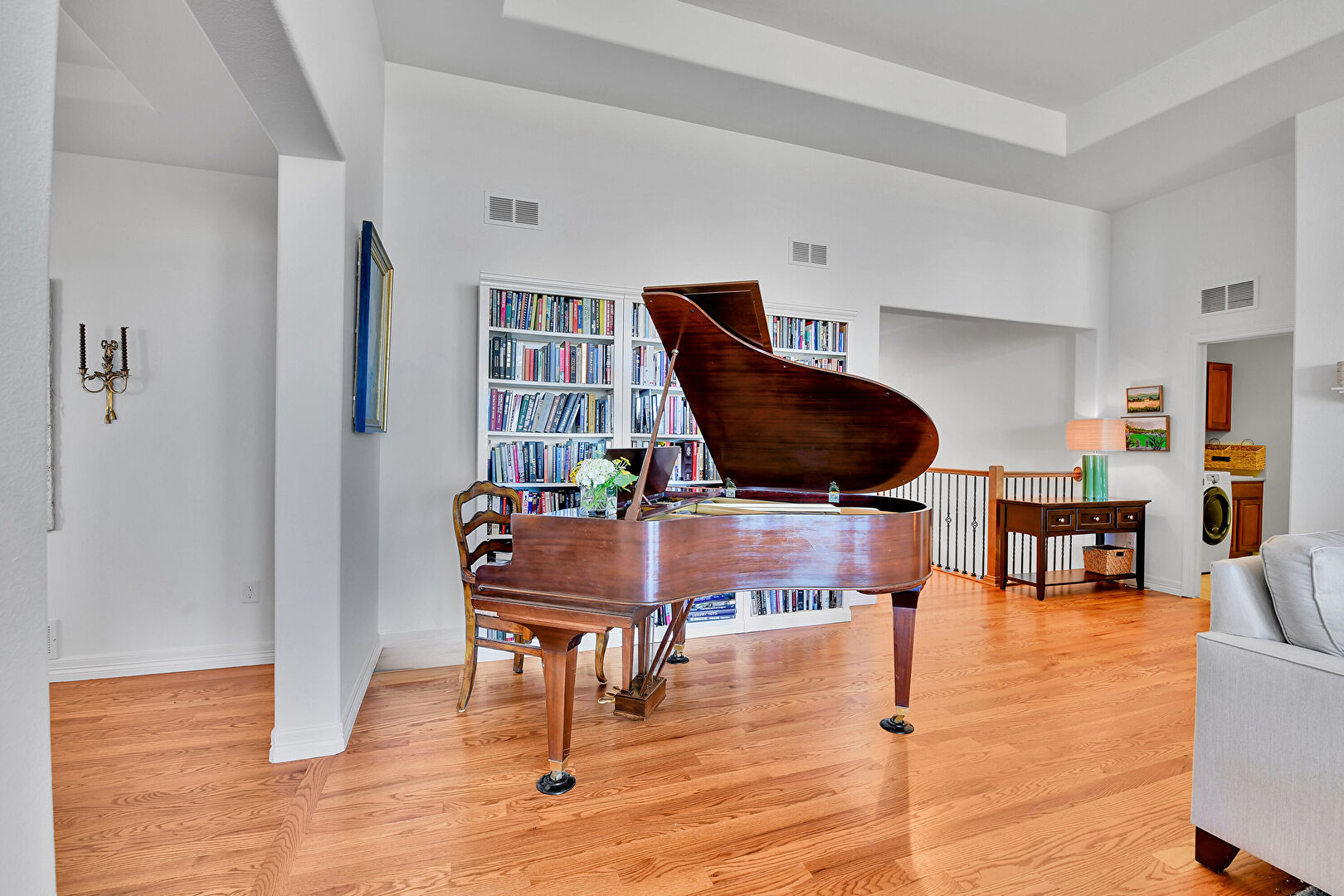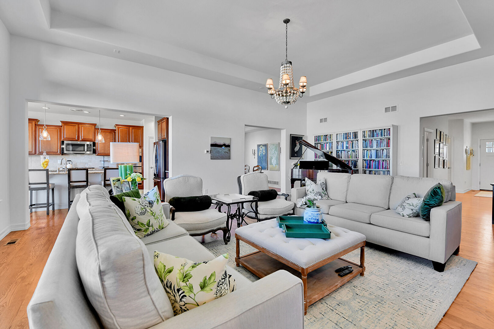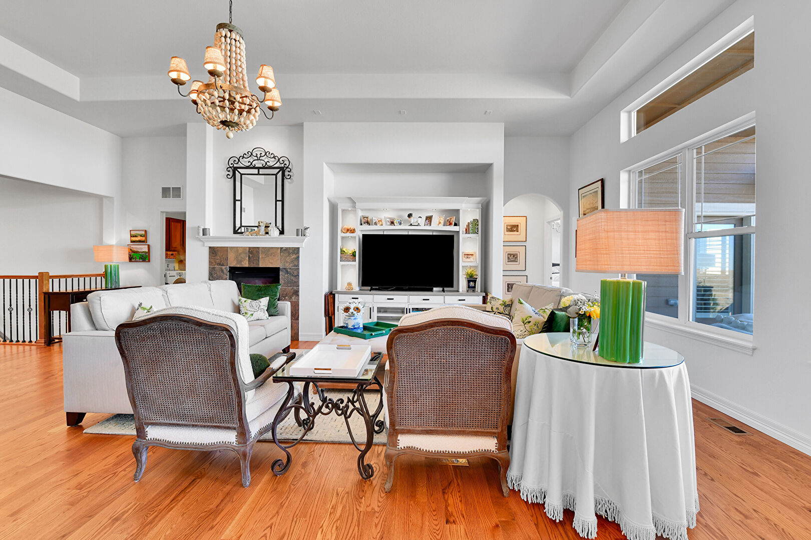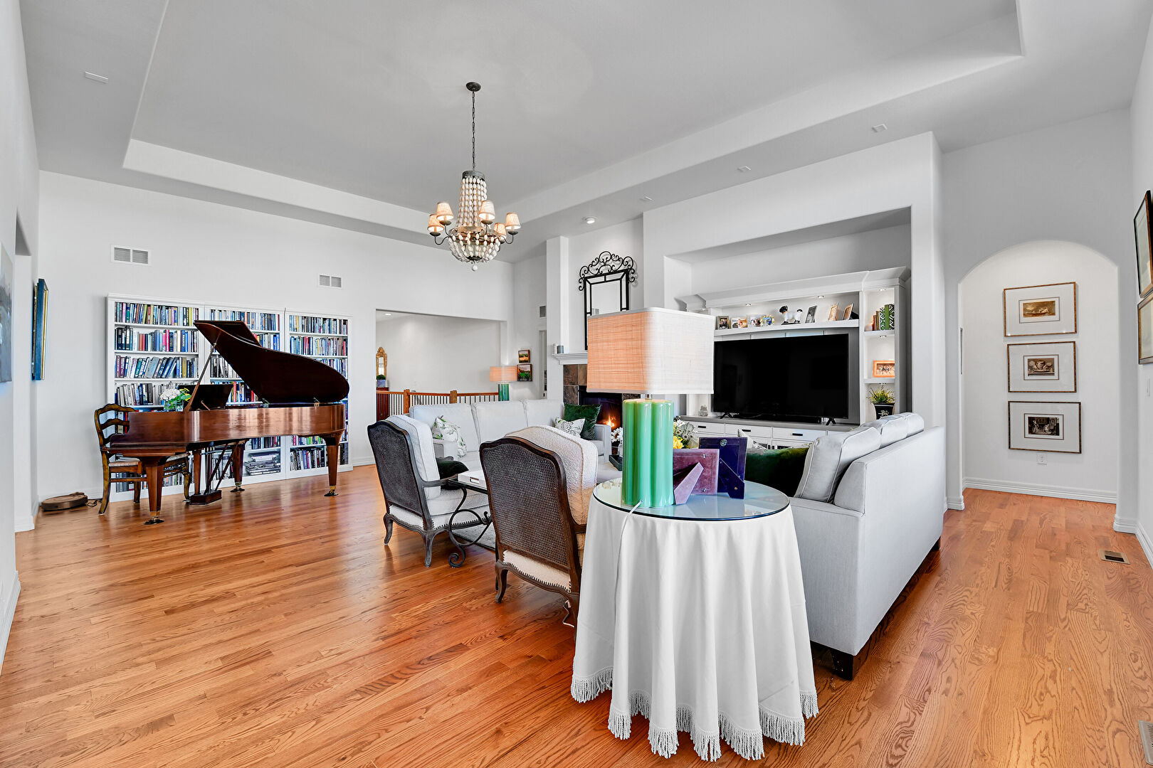 Arched Walkways, Baseboards Wall, Built In Shelves, Drywall, Fireplace, High Ceiling, Laundry, Natural Light, Notable Chandelier, Recessed Lighting, Tray Ceiling, Vent, Washer Dryer, Wood Finish Floor, Baseboards Wall, Built In Shelves, Fireplace, L Shaped Kitchen, Natural Light, Notable Chandelier, Tray Ceiling