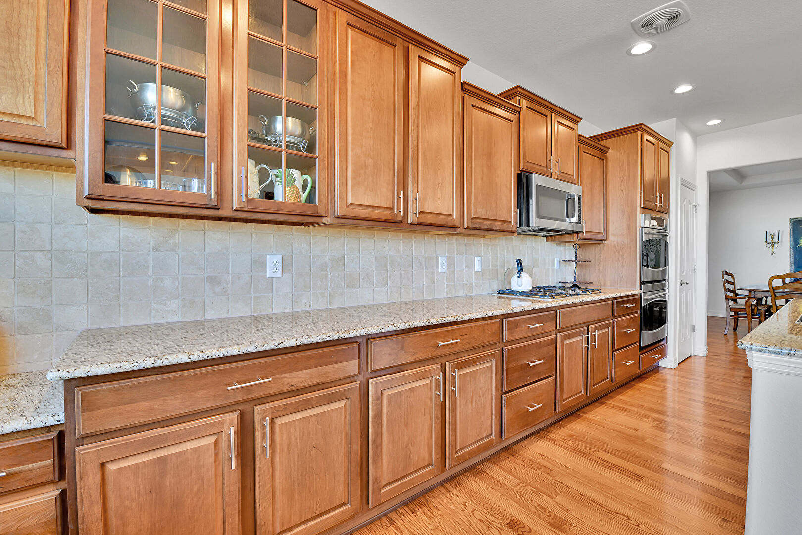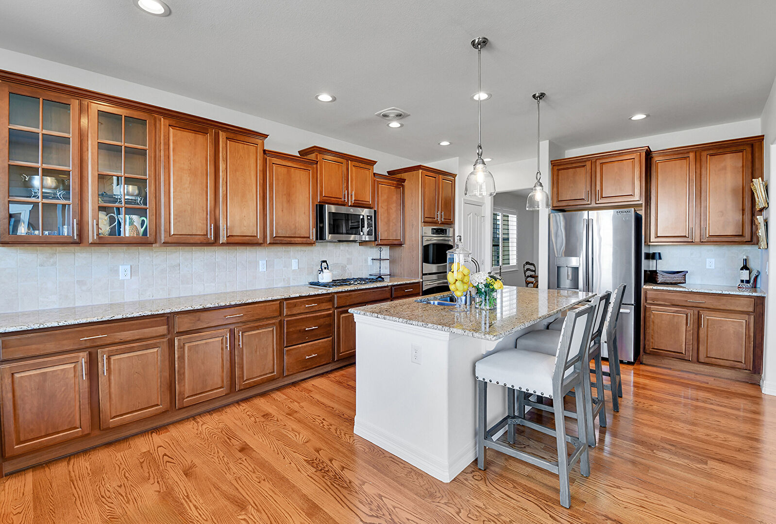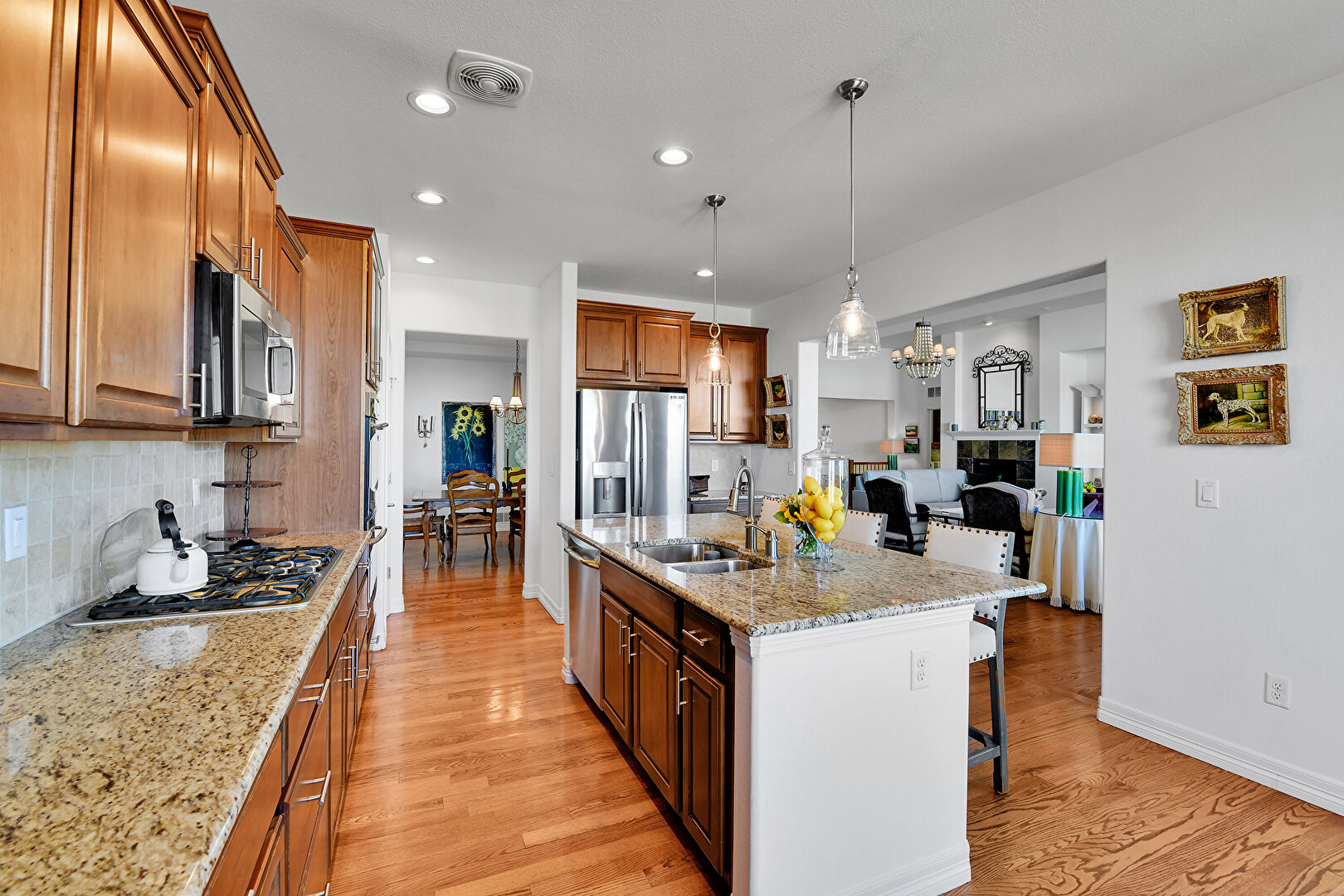 Baseboards Wall, Crown Molding Cabinets, Double Oven, Drywall, Fireplace, Glass Insert Cabinets, Kitchen Bar, Kitchen Island, L Shaped Kitchen, Medium Brown Cabinets, Natural Light, Notable Chandelier, Opens To Living Area, Pendant Lighting, Raised Cabinets, Recessed Lighting, Stone Countertops, Vent, Wood Finish Floor, Double Oven, Drywall, Kitchen Bar, Medium Brown Cabinets, Opens To Living Area, Stone Countertops, Vent