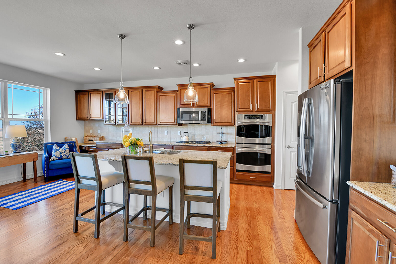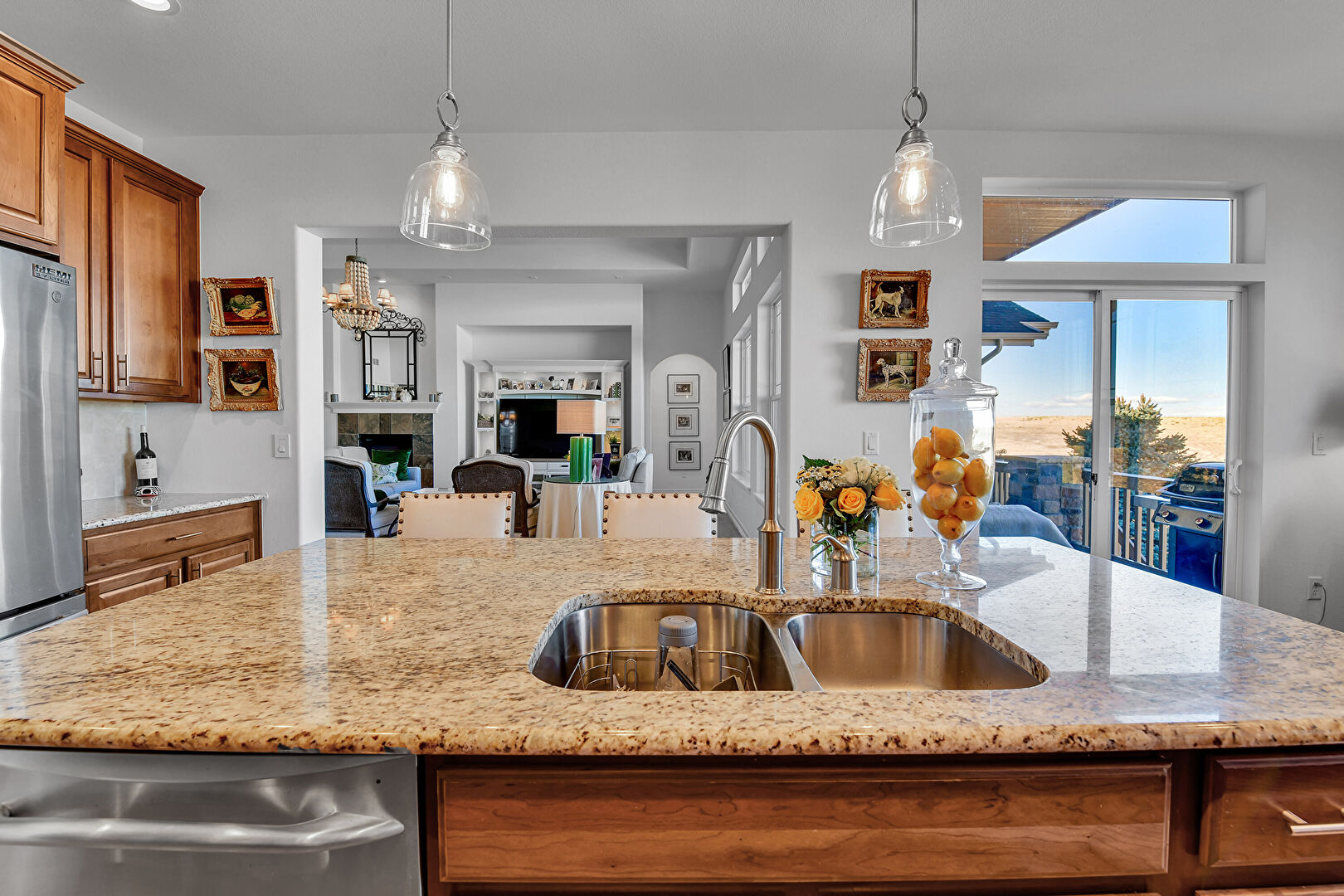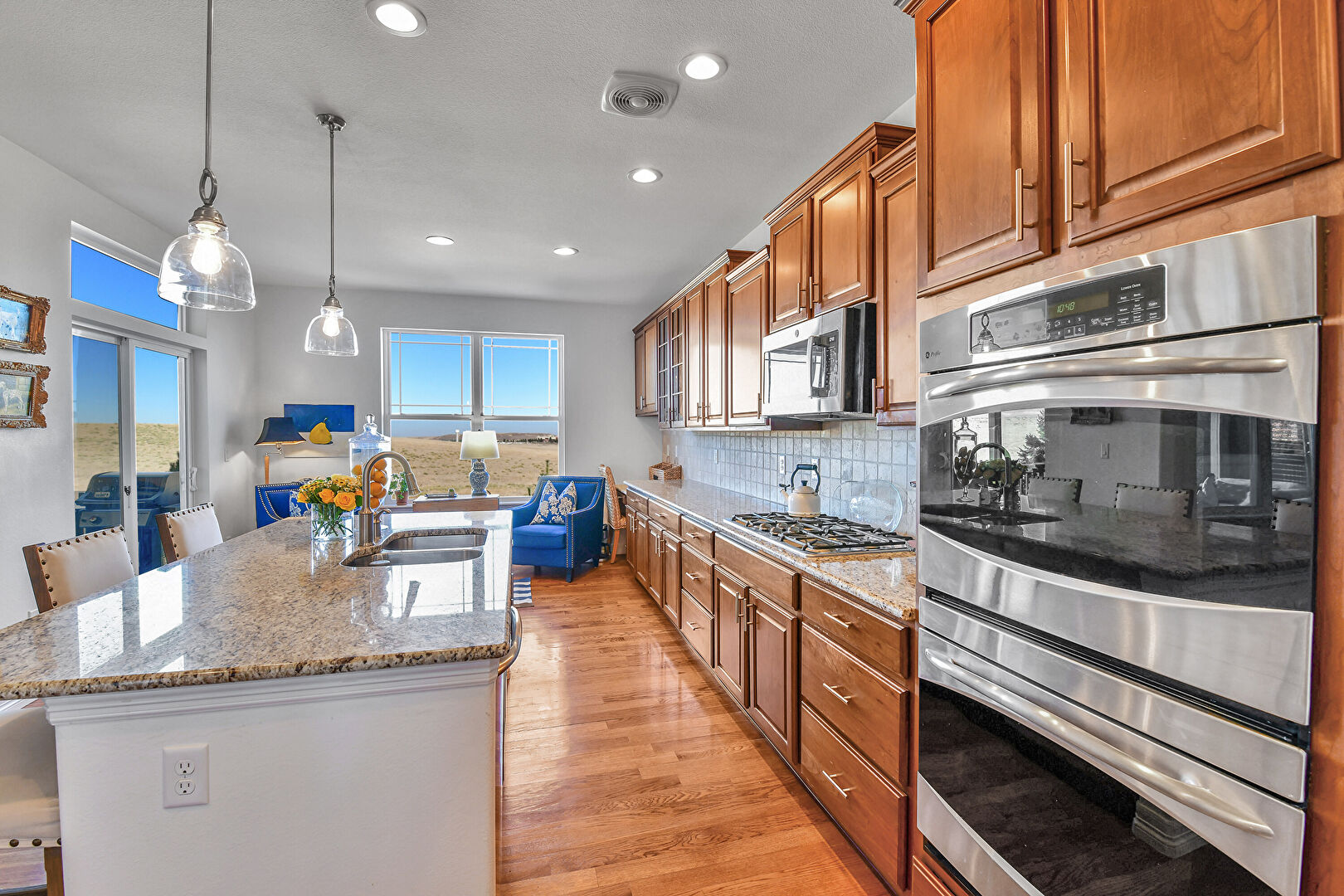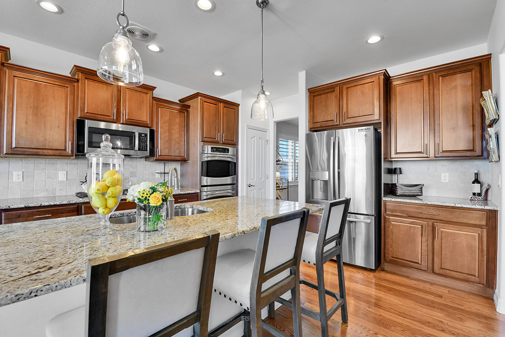 Baseboards Wall, Crown Molding Cabinets, Double Oven, Drywall, Fireplace, Glass Insert Cabinets, Kitchen Bar, Kitchen Island, L Shaped Kitchen, Medium Brown Cabinets, Natural Light, Notable Chandelier, Opens To Living Area, Pendant Lighting, Raised Cabinets, Recessed Lighting, Stone Countertops, Vent, Wood Finish Floor, Double Oven, Drywall, Kitchen Bar, Medium Brown Cabinets, Opens To Living Area, Stone Countertops, Vent
