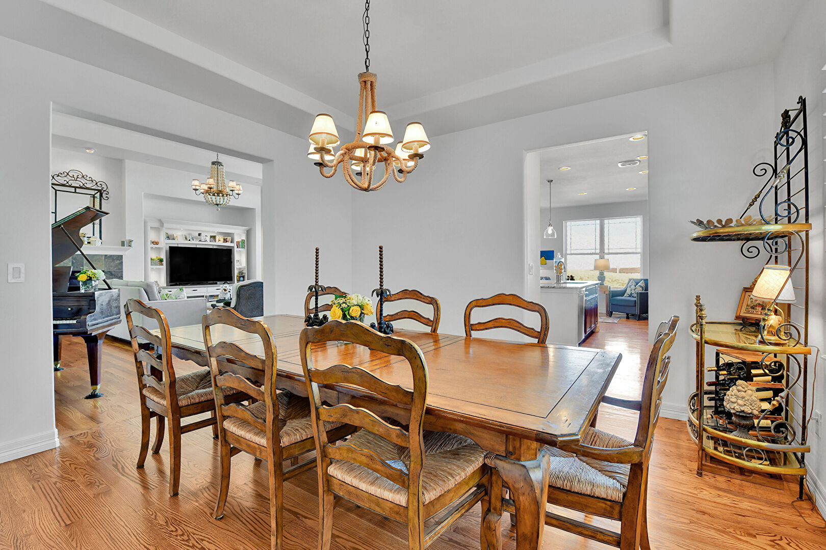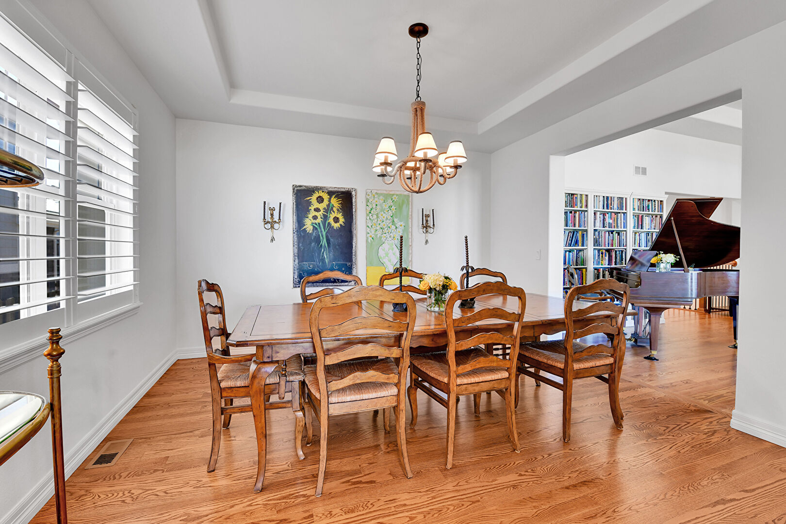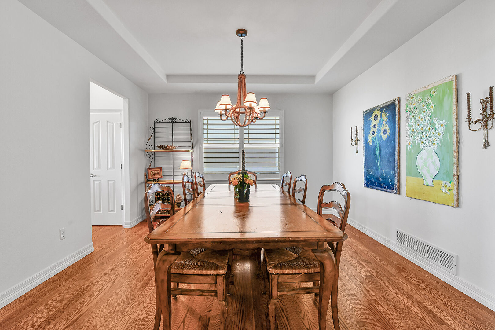 Baseboards Wall, Drywall, Natural Light, Notable Chandelier, Tray Ceiling, Vent, Wood Finish Floor, Drywall, Tray Ceiling, Wood Finish Floor