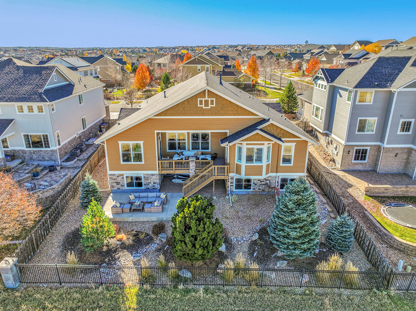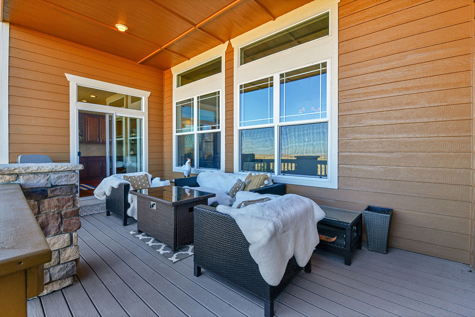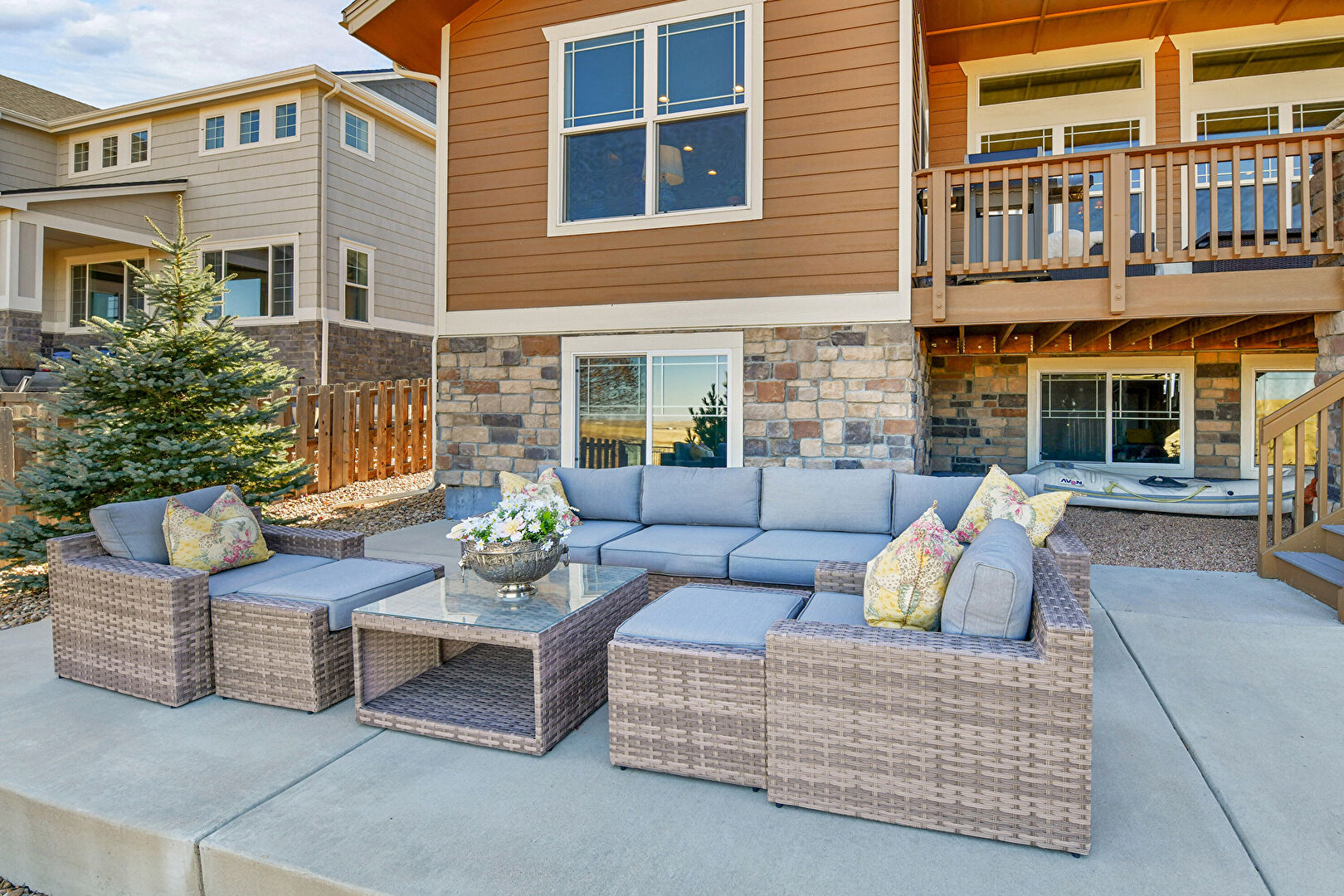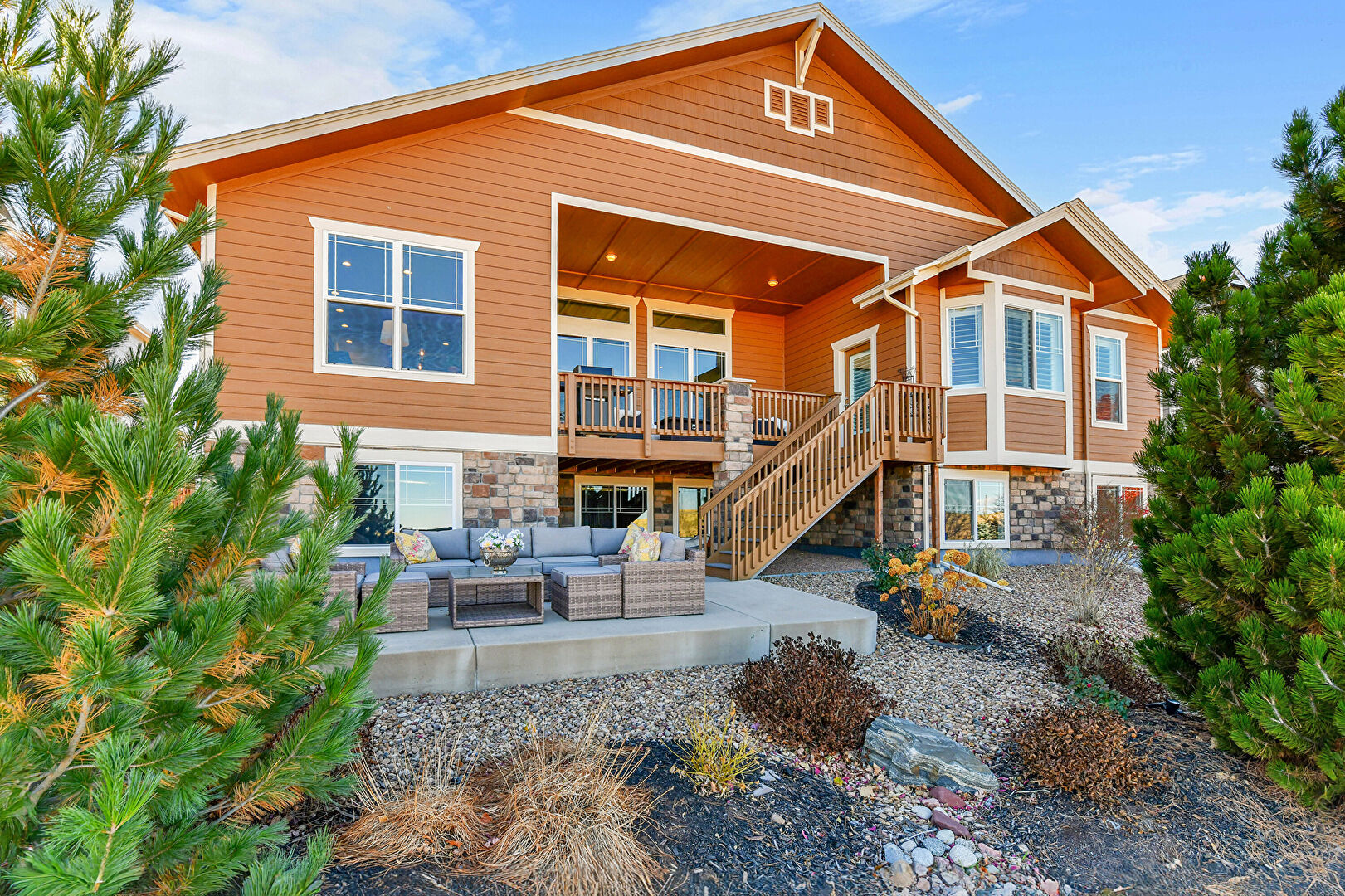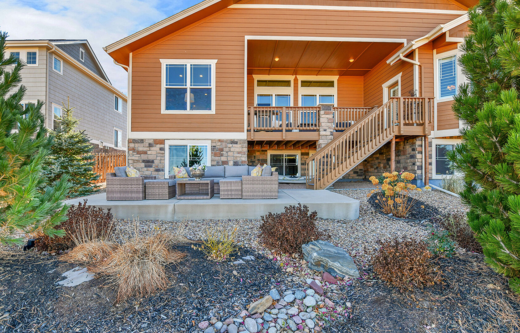 Deck, Downspout, Fence, Gutters, Horizontal Siding, Outdoor Living Space, Patio, Shake Shingle Siding, Stairs, Stone Siding, Patio, Stone Siding