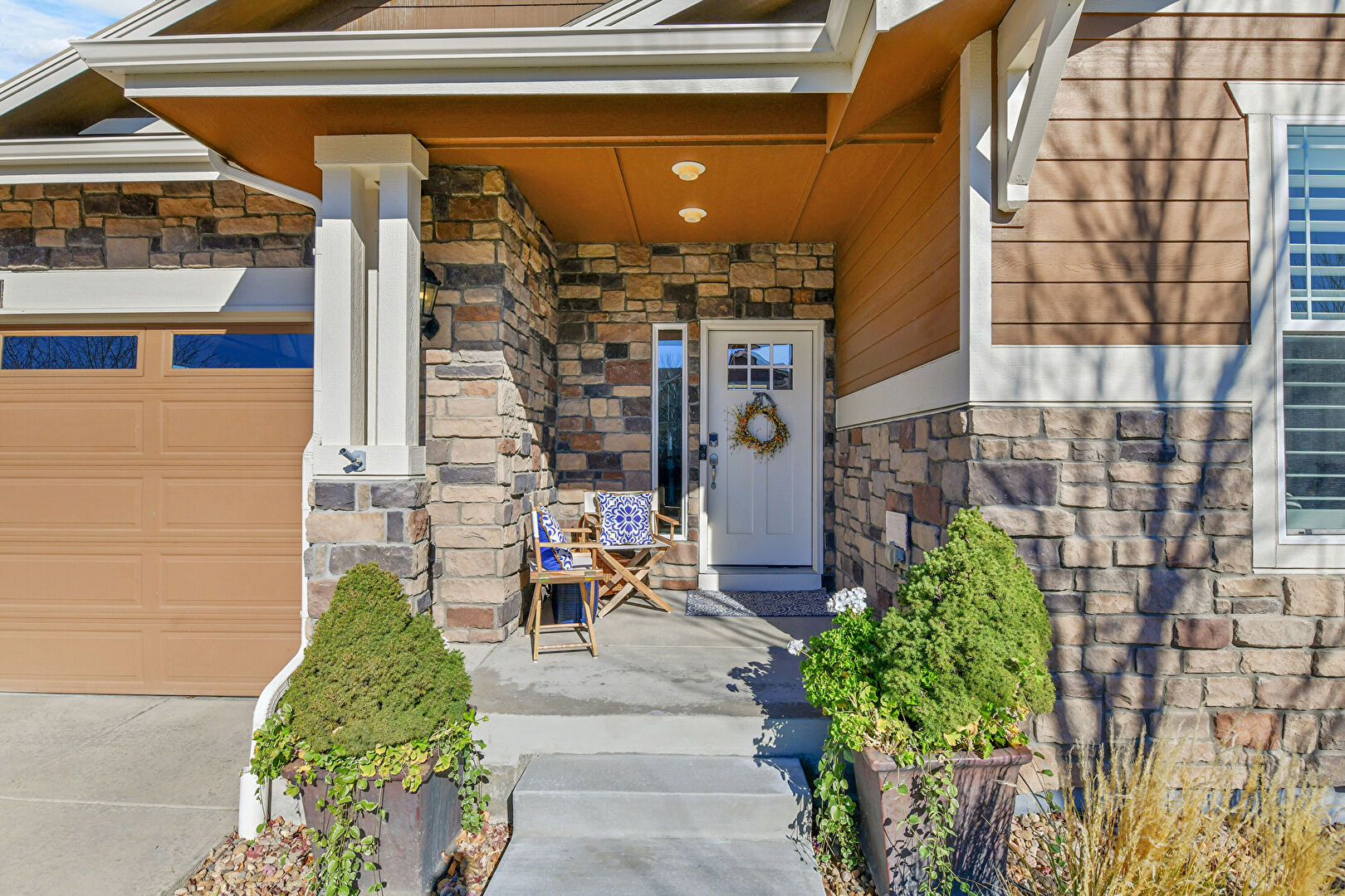 Downspout, Driveway, Gutters, Horizontal Siding, Porch, Stone Siding