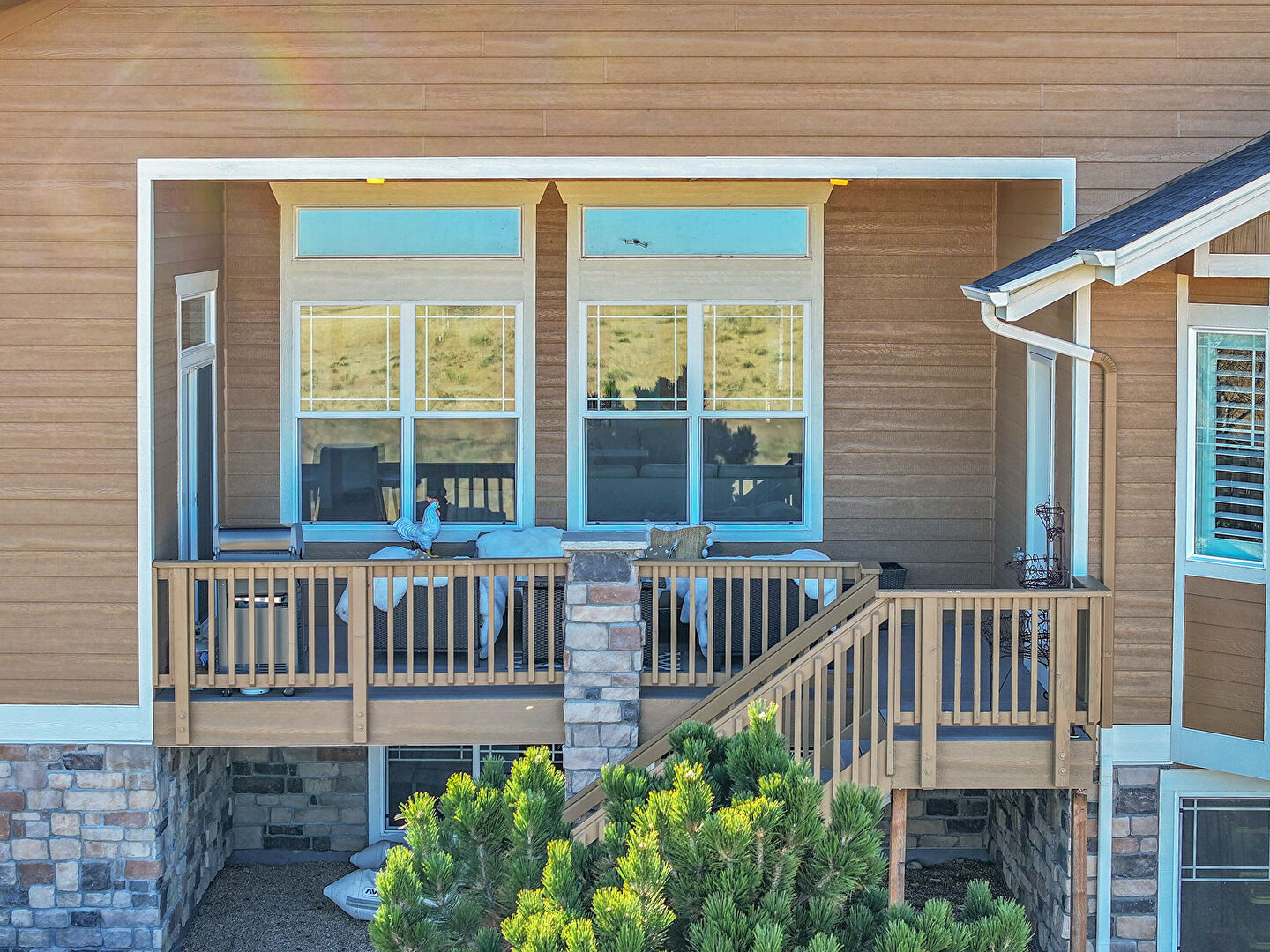 Deck, Desert View, Driveway, Fence, Horizontal Siding, Lawn, Mountain View, Outdoor Living Space, Patio, Residential View, Rural View, Shake Shingle Siding, Shingle Roof, Stairs, Stone Siding, Water View, Lawn, Residential View, Rural View, Stairs, Stoop, Water View