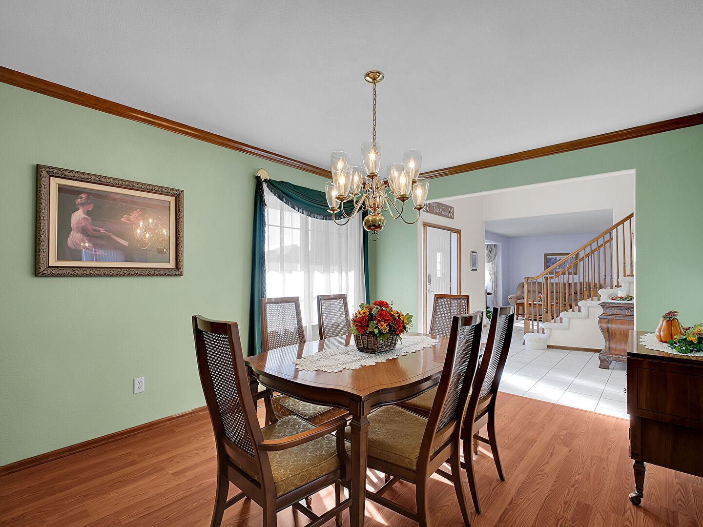 Baseboards Wall, Crown Molding, Drywall, High Ceiling, Natural Light, Stairs, Tile Floor, Carpet, Notable Chandelier