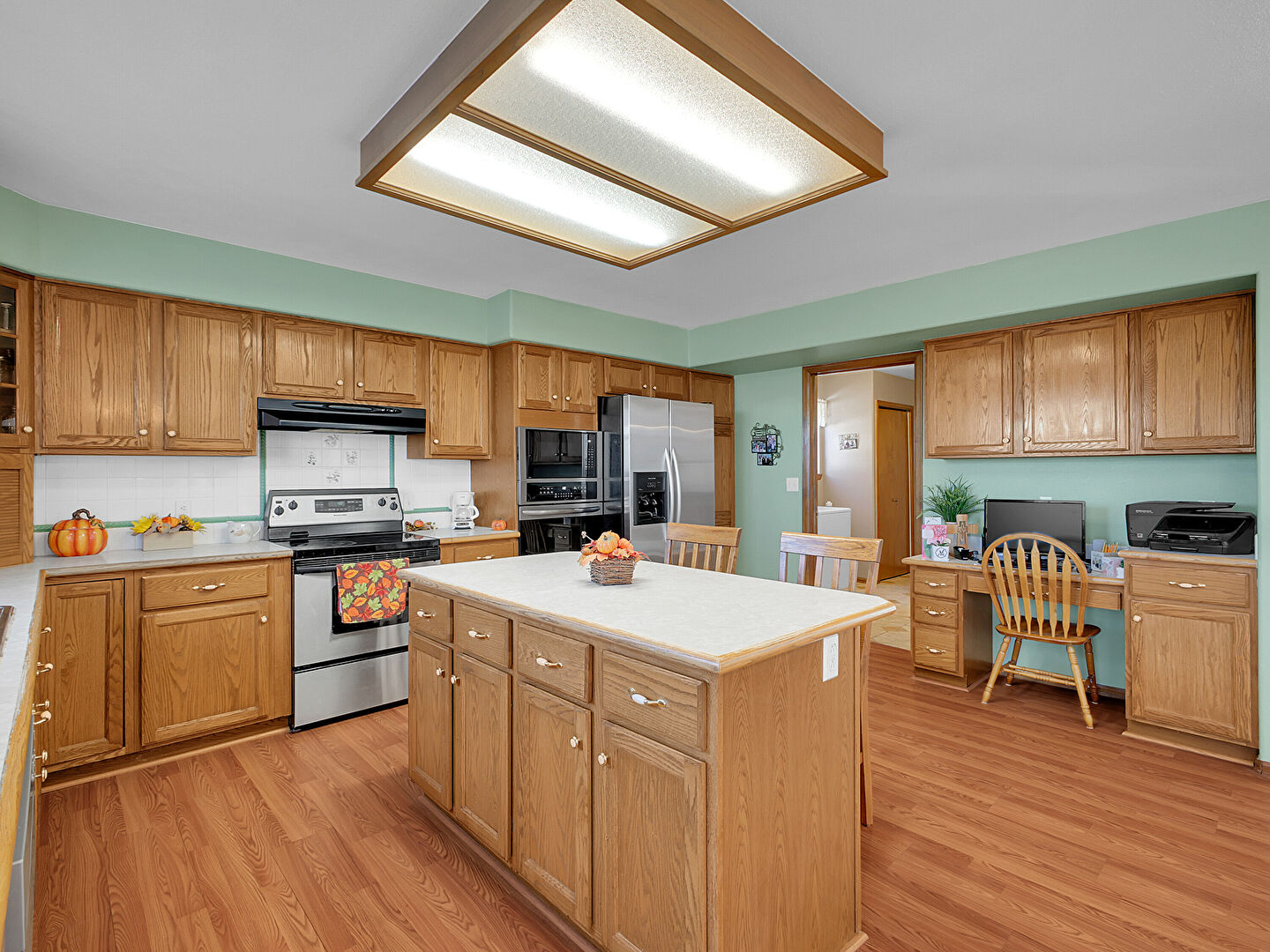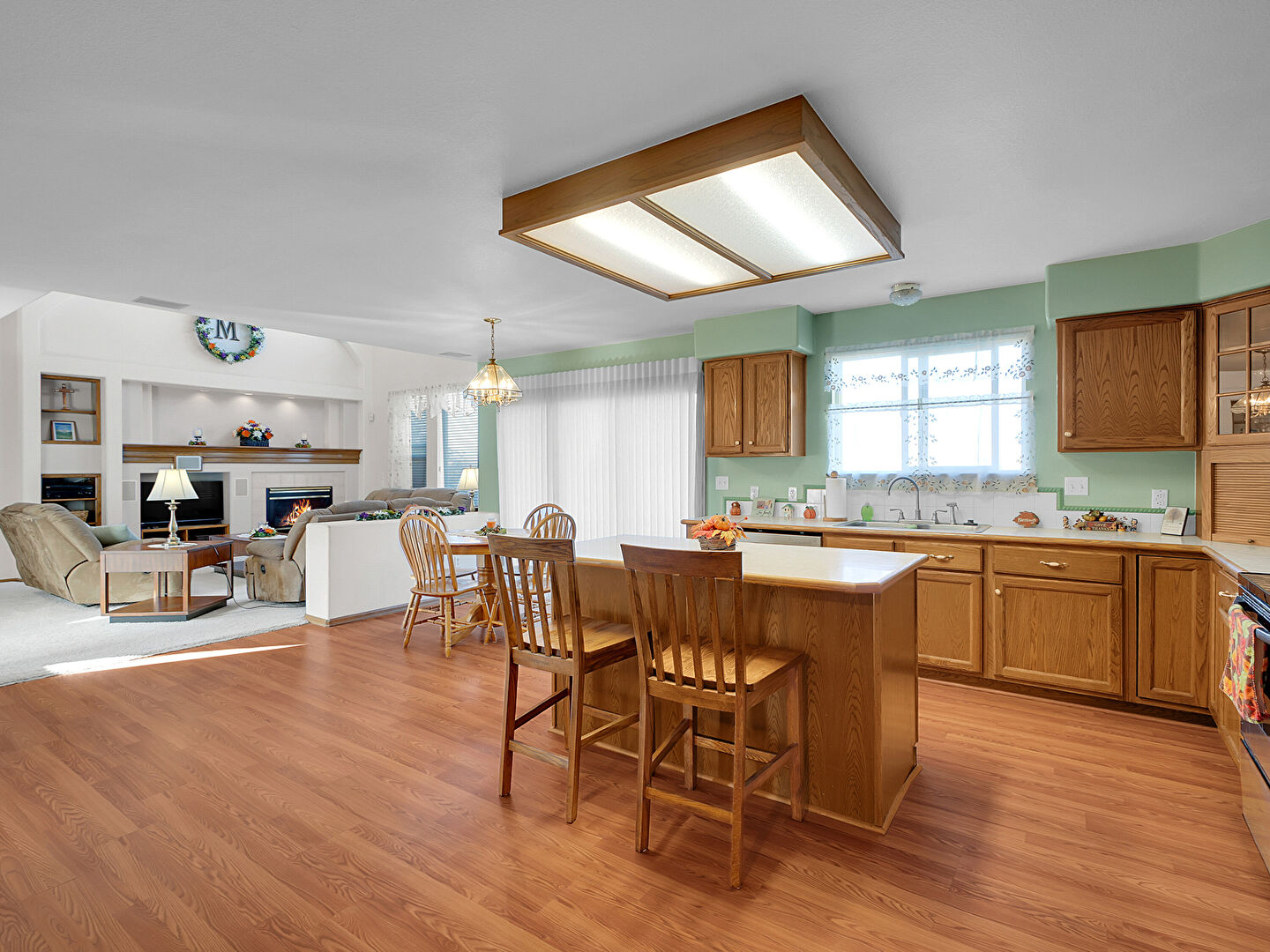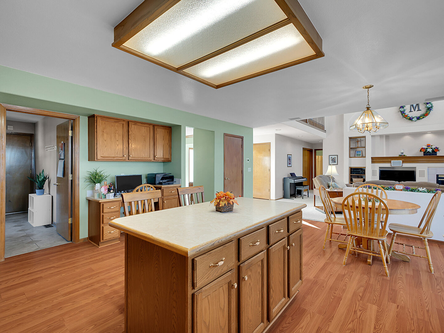 Built In Desk, Drywall, Fireplace, Glass Insert Cabinets, Kitchen Bar, Kitchen Island, L Shaped Kitchen, Medium Brown Cabinets, Natural Light, Notable Chandelier, Office Area, Opens To Living Area, Pendant Lighting, Shaker Cabinets, Wood Finish Floor, Drywall, Fireplace, Glass Insert Cabinets, Kitchen Bar, Kitchen Island, Shaker Cabinets