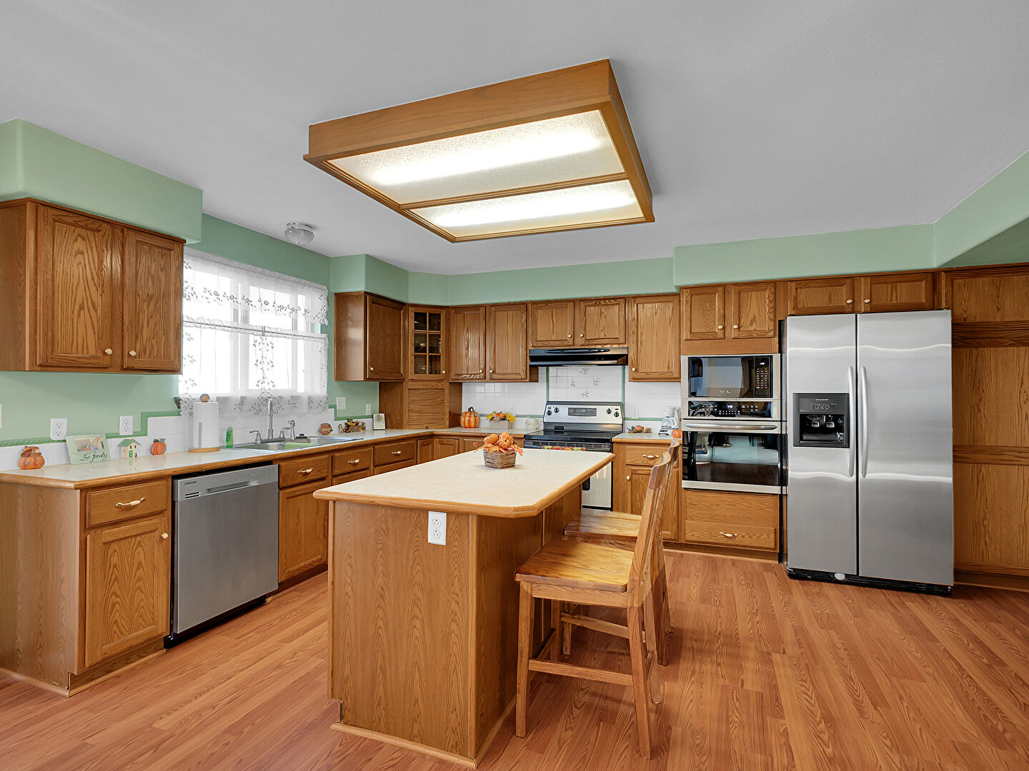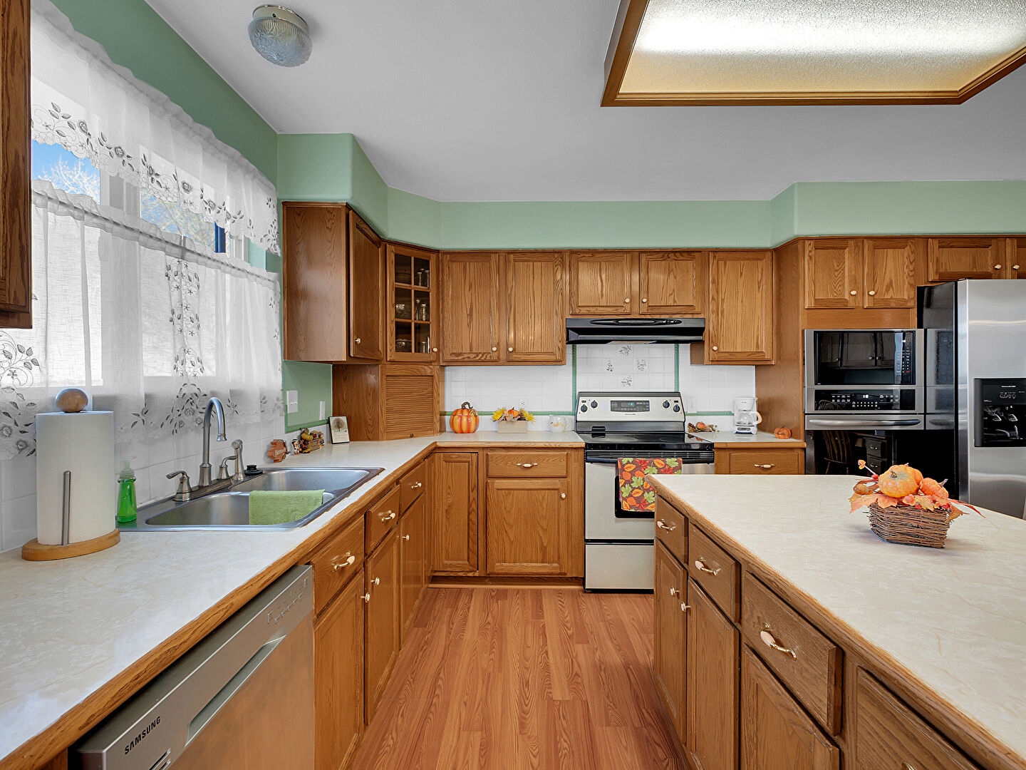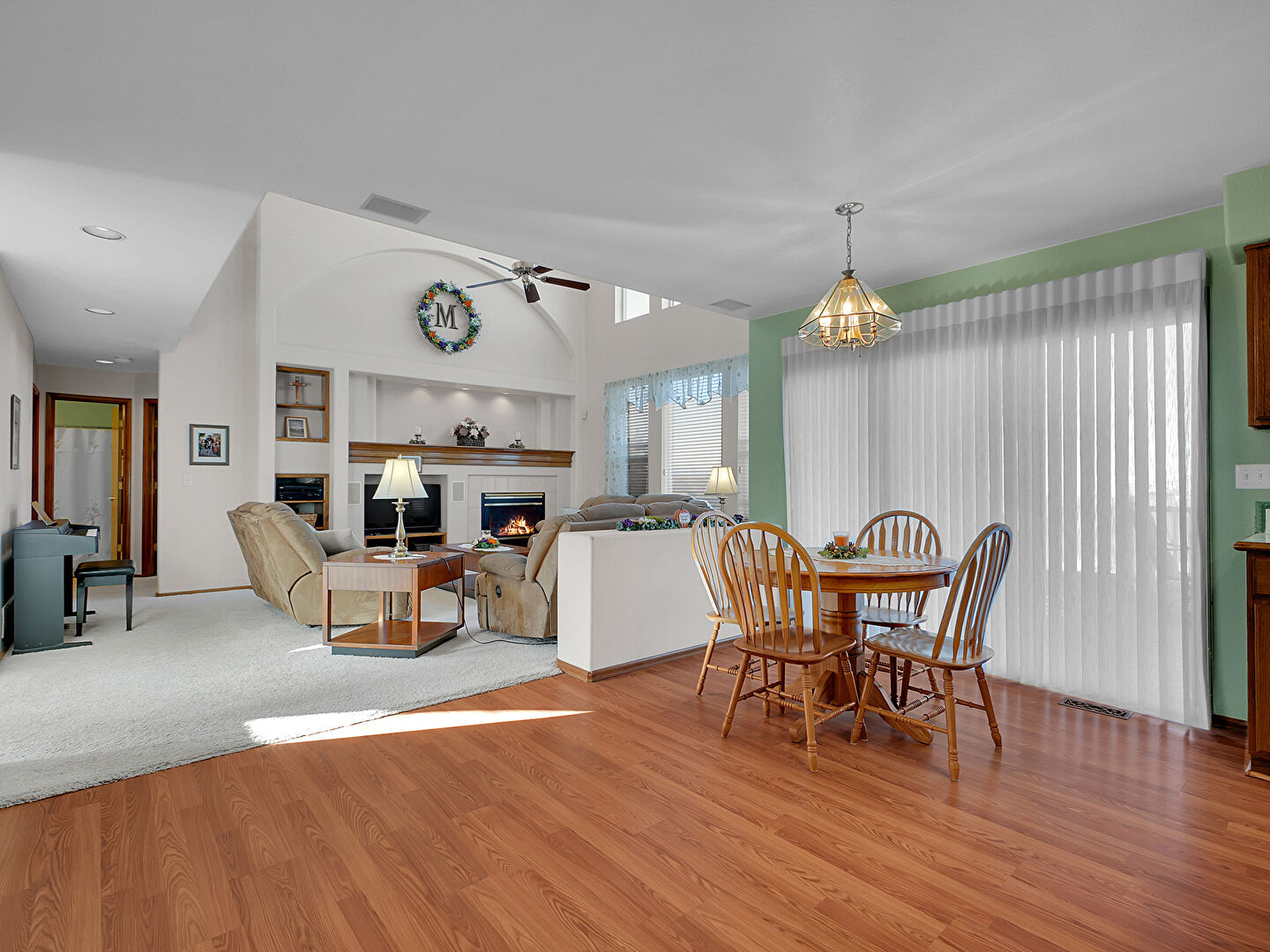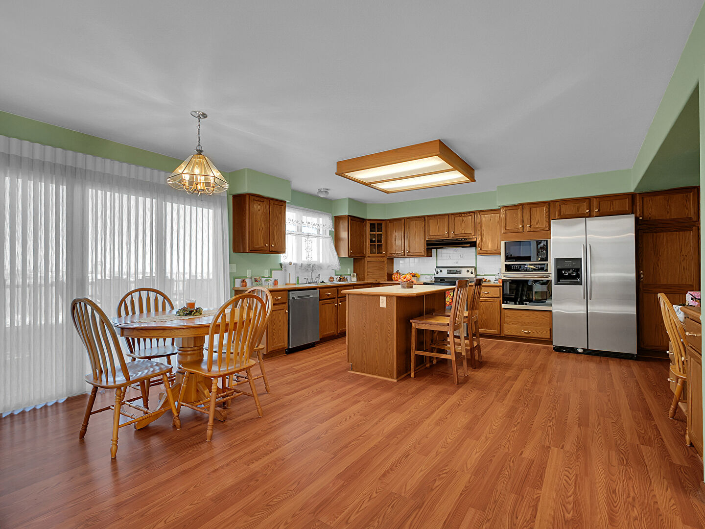 Built In Desk, Drywall, Fireplace, Glass Insert Cabinets, Kitchen Bar, Kitchen Island, L Shaped Kitchen, Medium Brown Cabinets, Natural Light, Notable Chandelier, Office Area, Opens To Living Area, Pendant Lighting, Shaker Cabinets, Wood Finish Floor, Drywall, Fireplace, Glass Insert Cabinets, Kitchen Bar, Kitchen Island, Shaker Cabinets