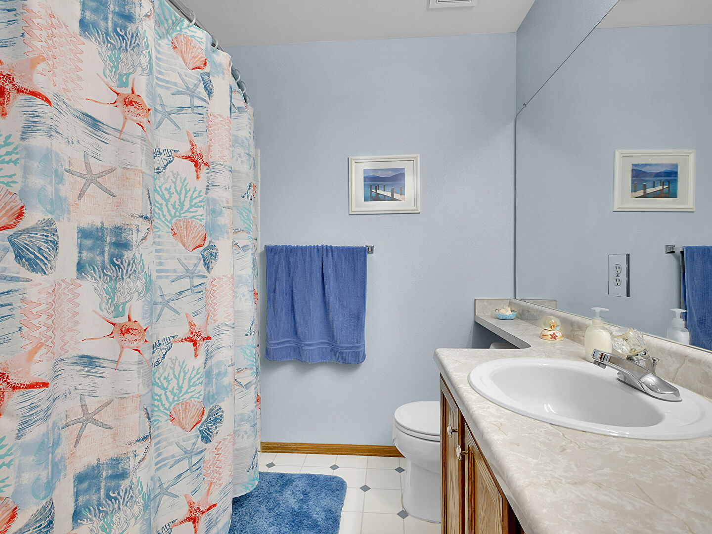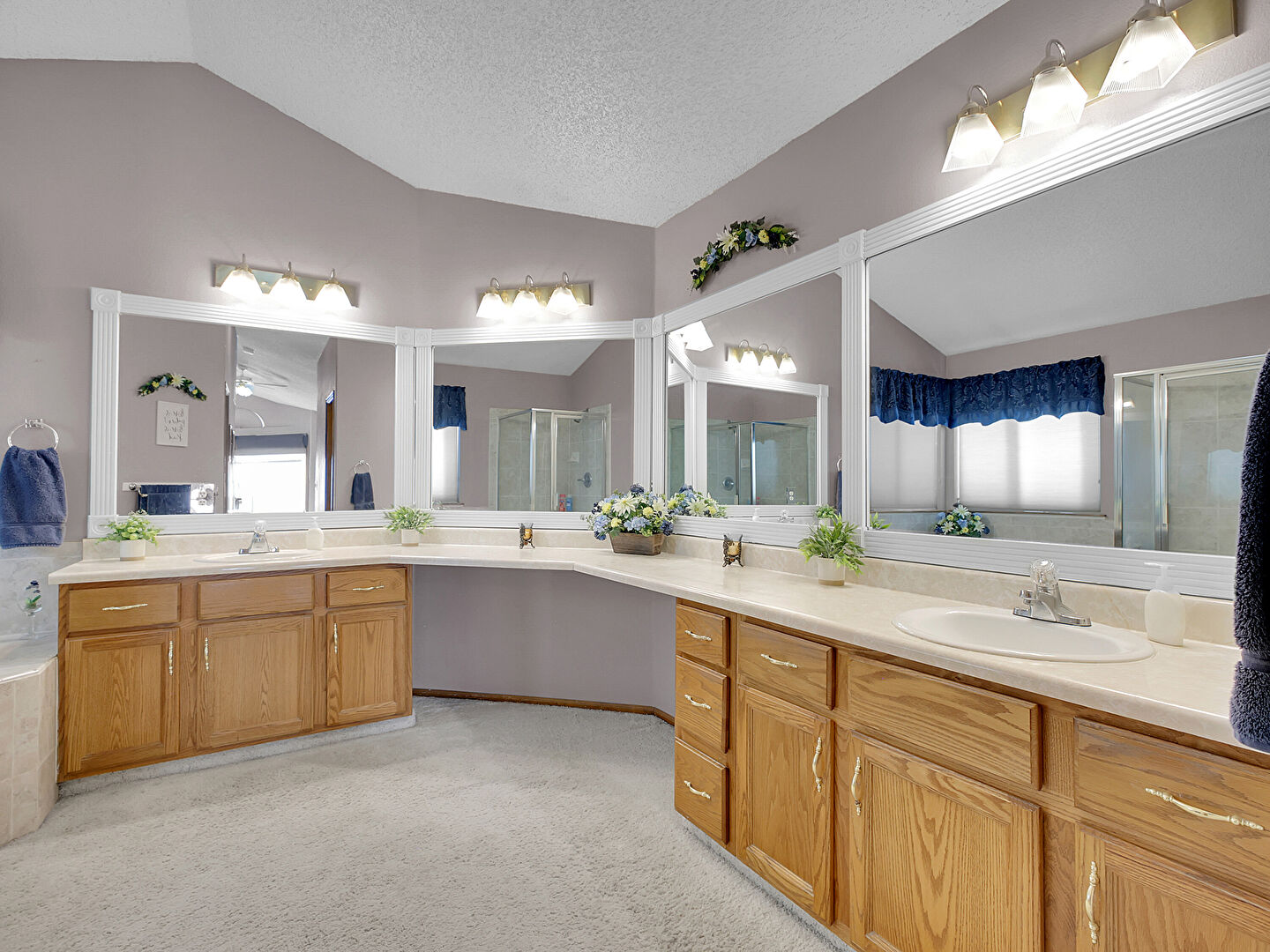 Baseboards Wall, Carpet, Drywall, Full Bathroom, Half Bathroom, Natural Light, Textured Ceiling, Tile Floor, Vanity, Vaulted Ceiling, Vent, Baseboards Wall, Cathedral Ceiling, Double Vanity, Full Bathroom, Vanity