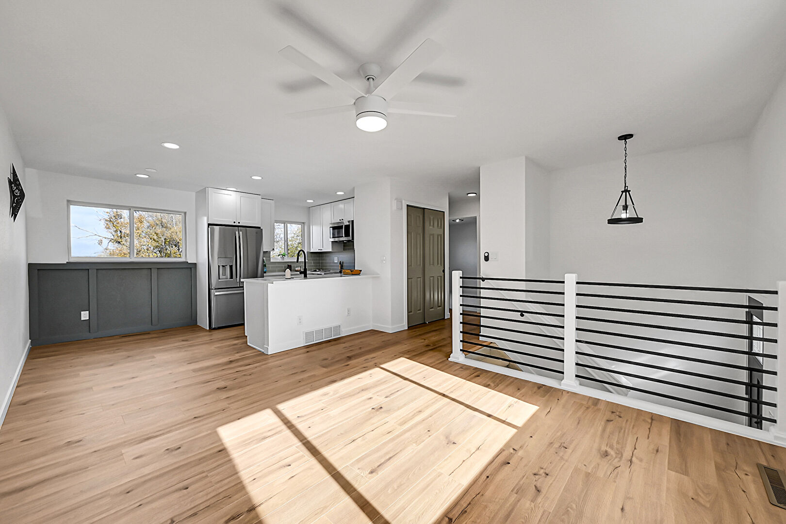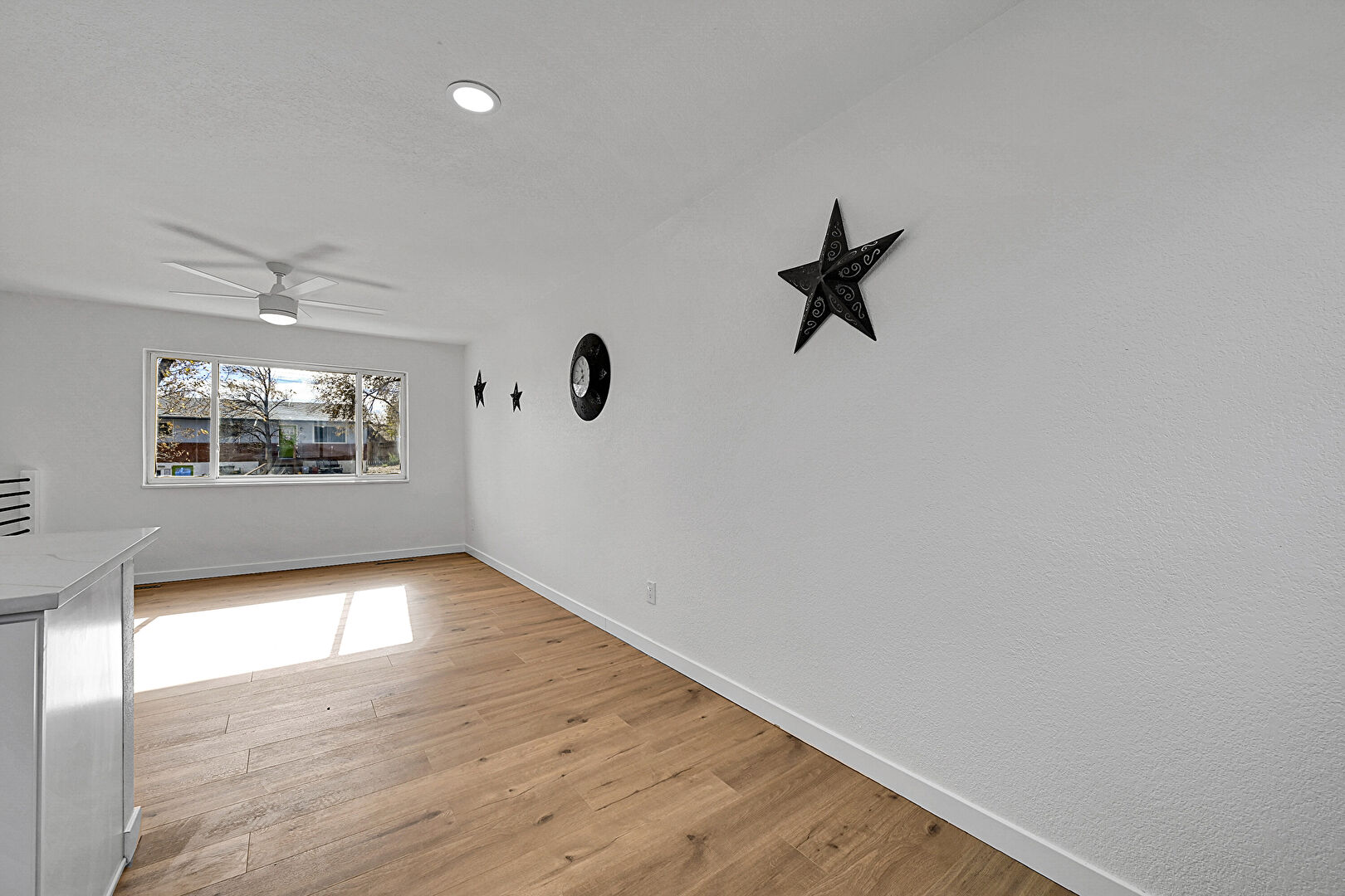 Baseboards Wall, Ceiling Fan, Drywall, Kitchen Peninsula, Natural Light, Pendant Lighting, Recessed Lighting, Shaker Cabinets, Stone Countertops, Wood Finish Floor, Drywall, Recessed Lighting, Stone Countertops