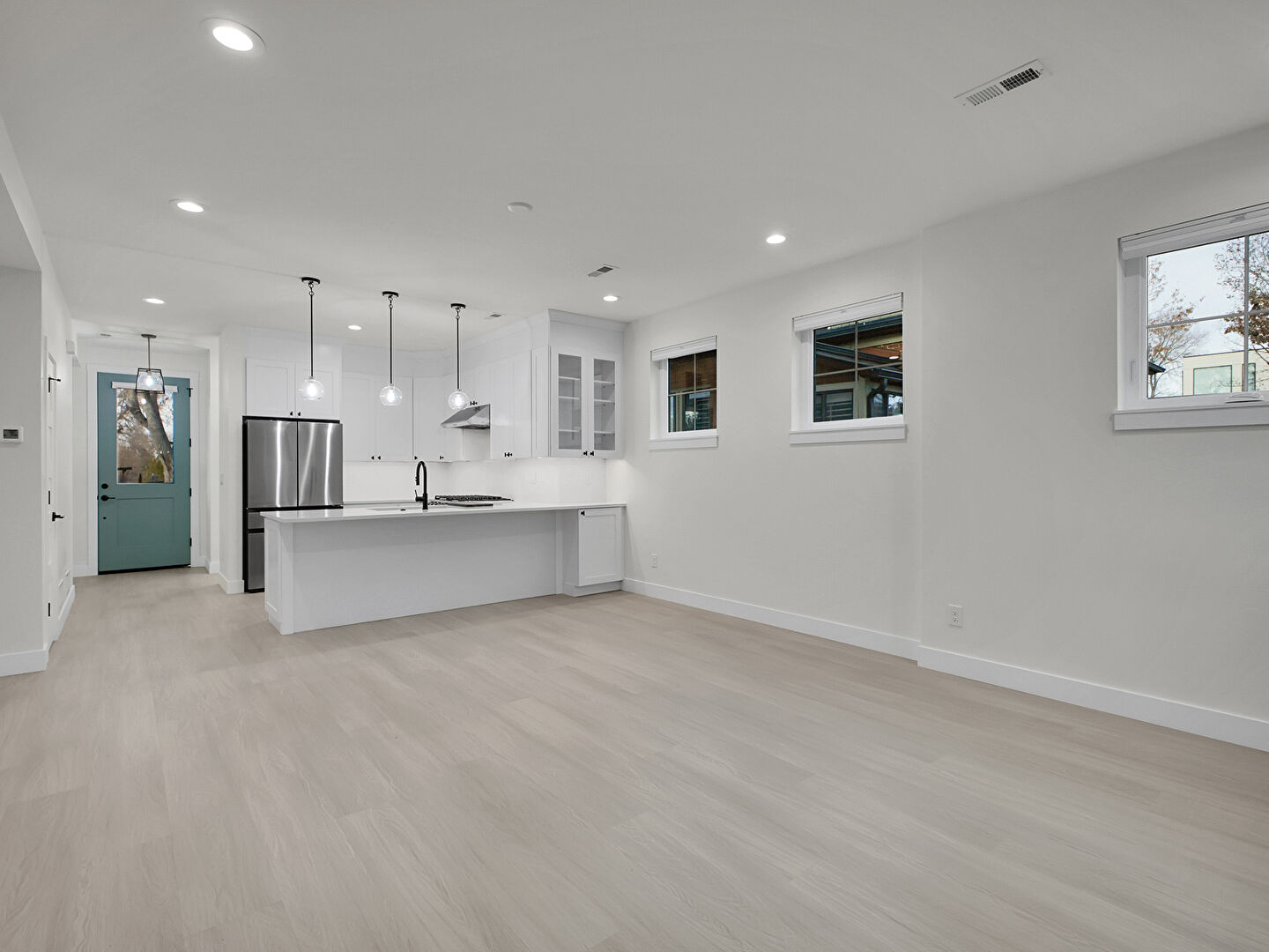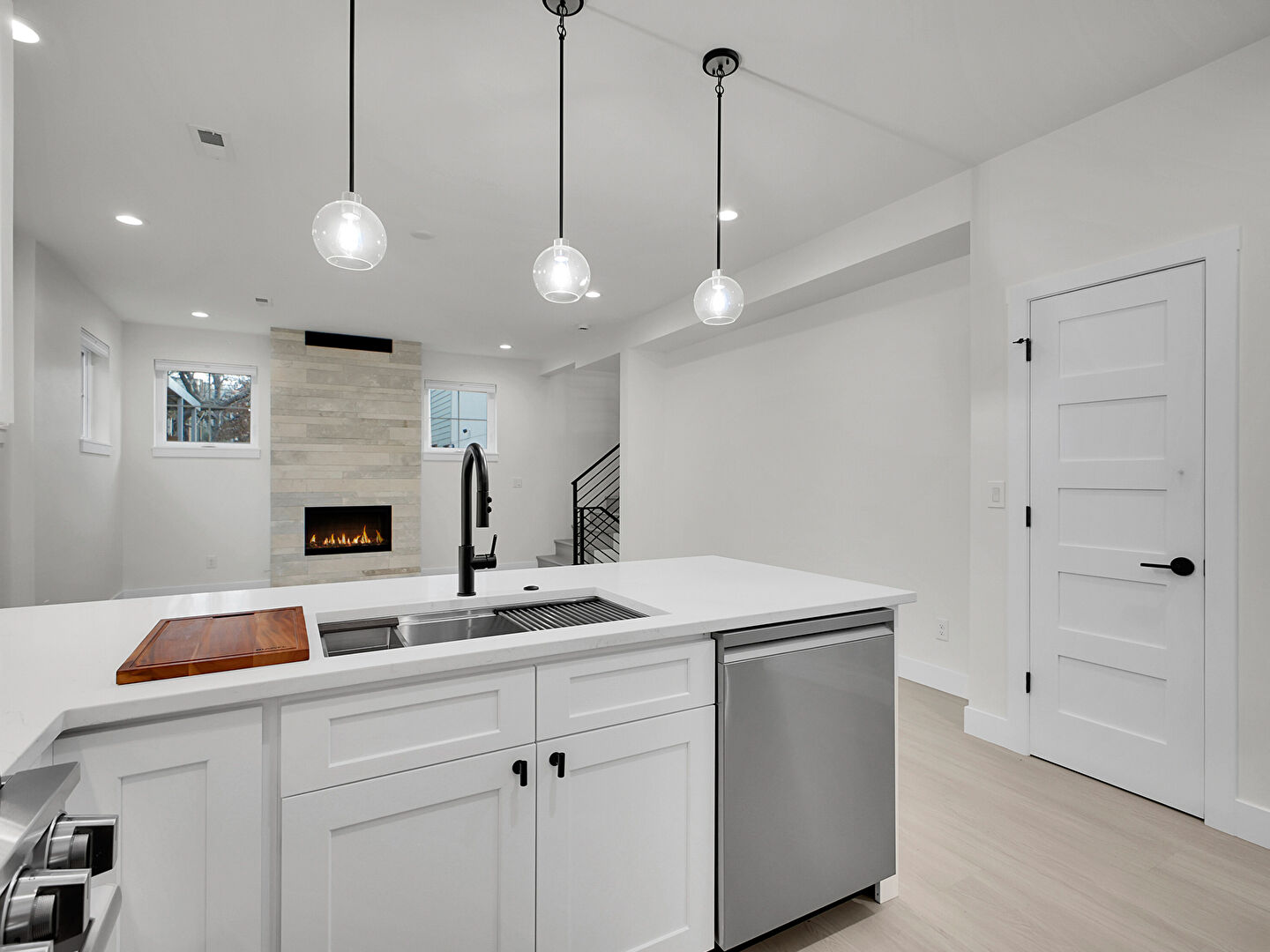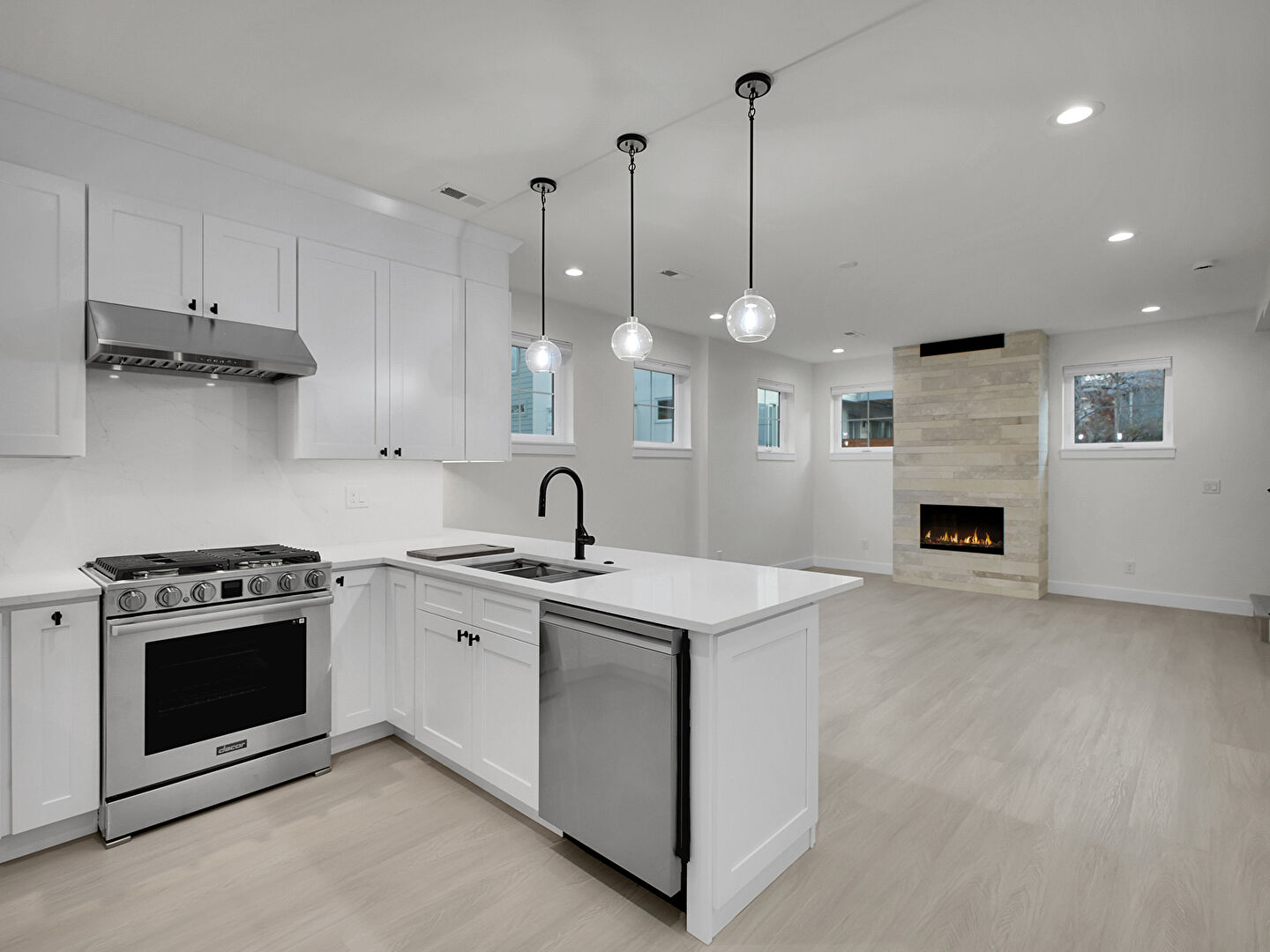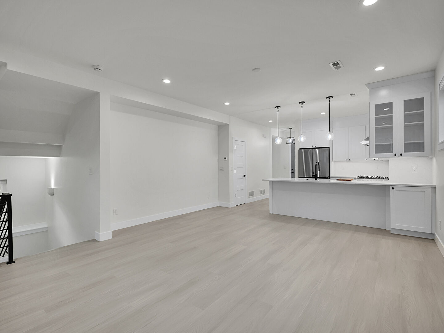 Baseboards Wall, Drywall, Fireplace, Natural Light, Recessed Lighting, Stairs, U Shaped Kitchen, Vent, Wood Finish Floor, Recessed Lighting, Vent