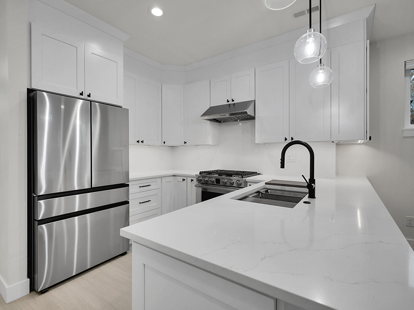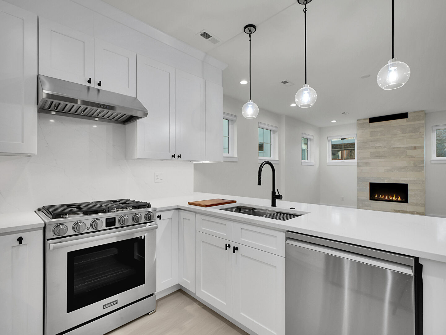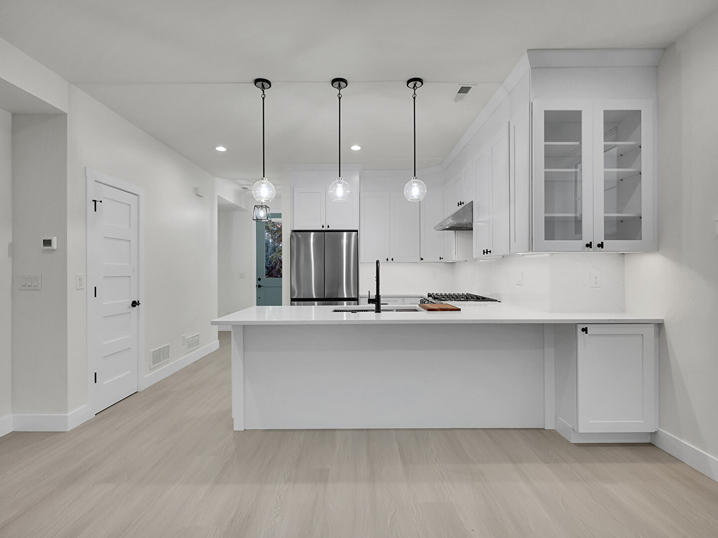 Baseboards Wall, Crown Molding, Crown Molding Cabinets, Drywall, Fireplace, Glass Insert Cabinets, Kitchen Bar, Kitchen Peninsula, Natural Light, Opens To Living Area, Pendant Lighting, Recessed Lighting, Shaker Cabinets, Stone Countertops, U Shaped Kitchen, Vent, Wood Finish Floor, Crown Molding Cabinets, Glass Insert Cabinets, Pendant Lighting, Recessed Lighting, Stone Countertops, U Shaped Kitchen, Wood Finish Floor